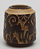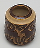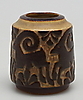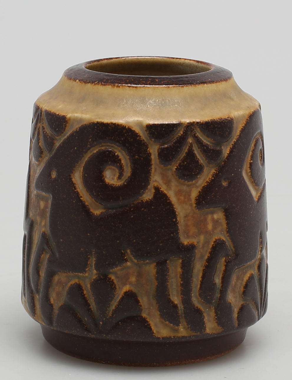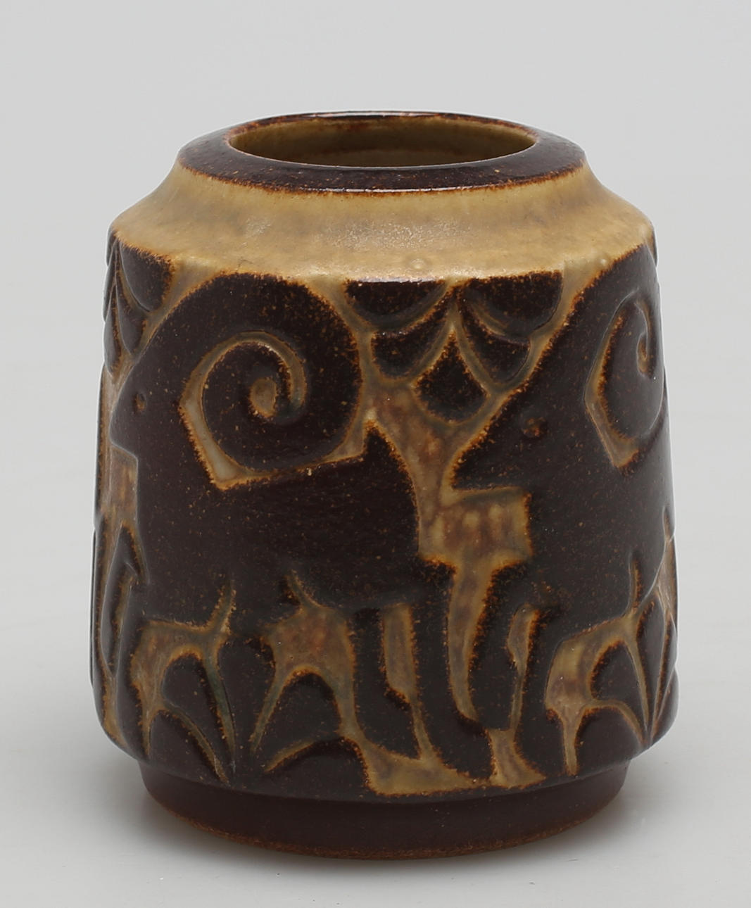Reliefdekoration med bukke i brun glasur på lysere baggrund. Højde 10 cm.