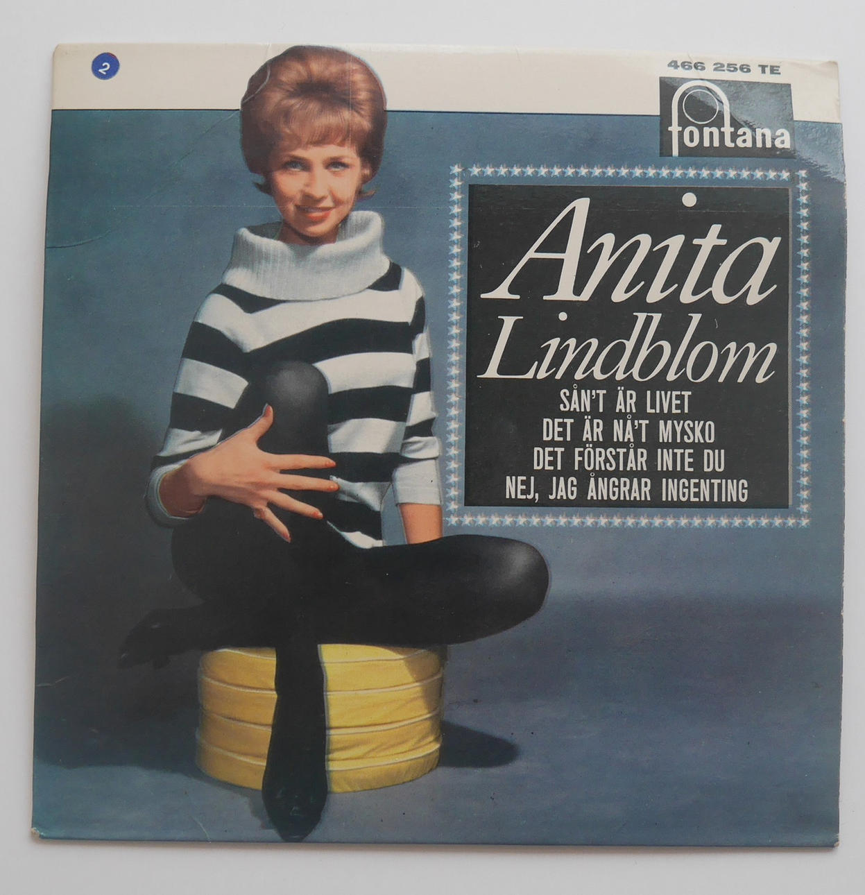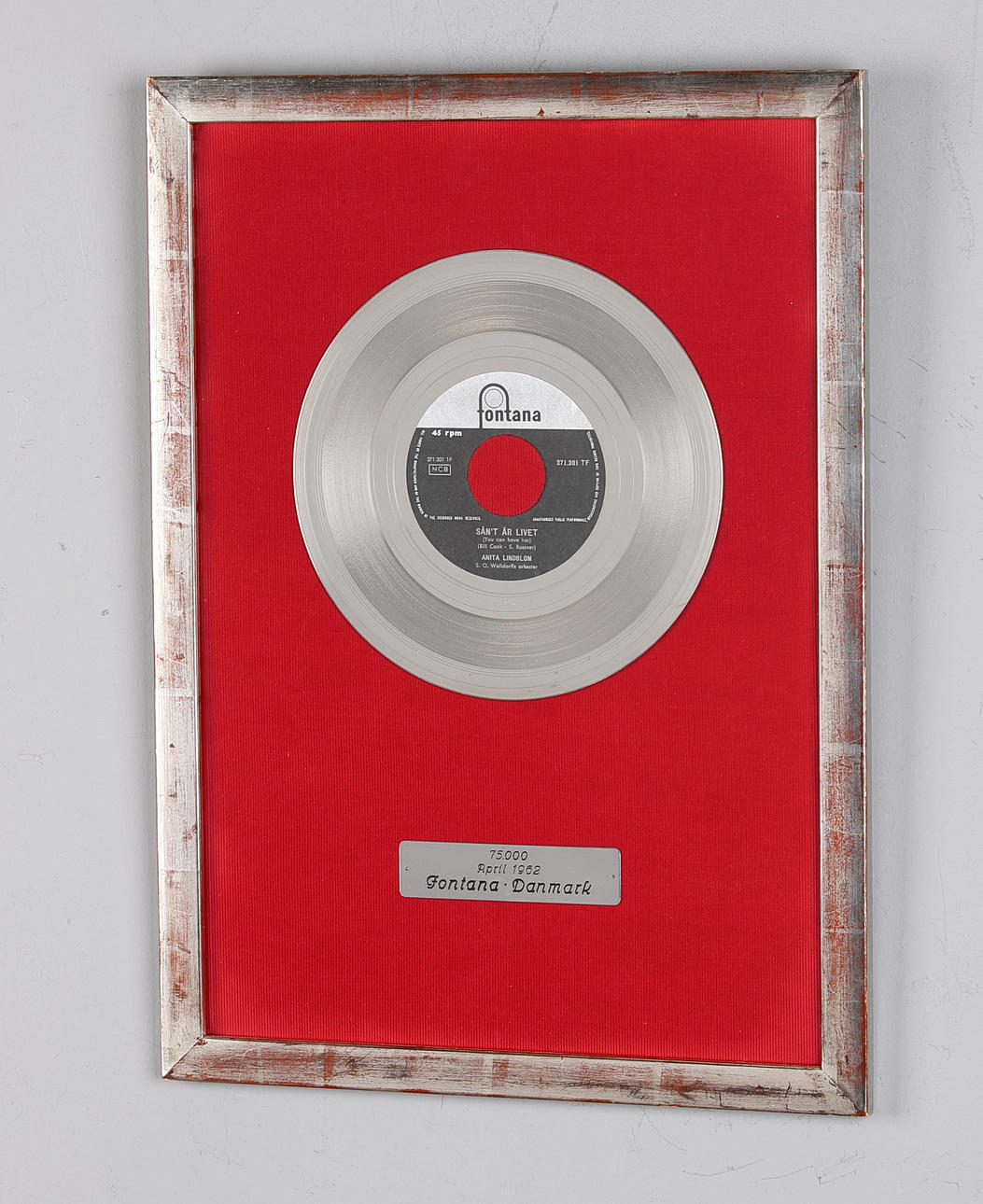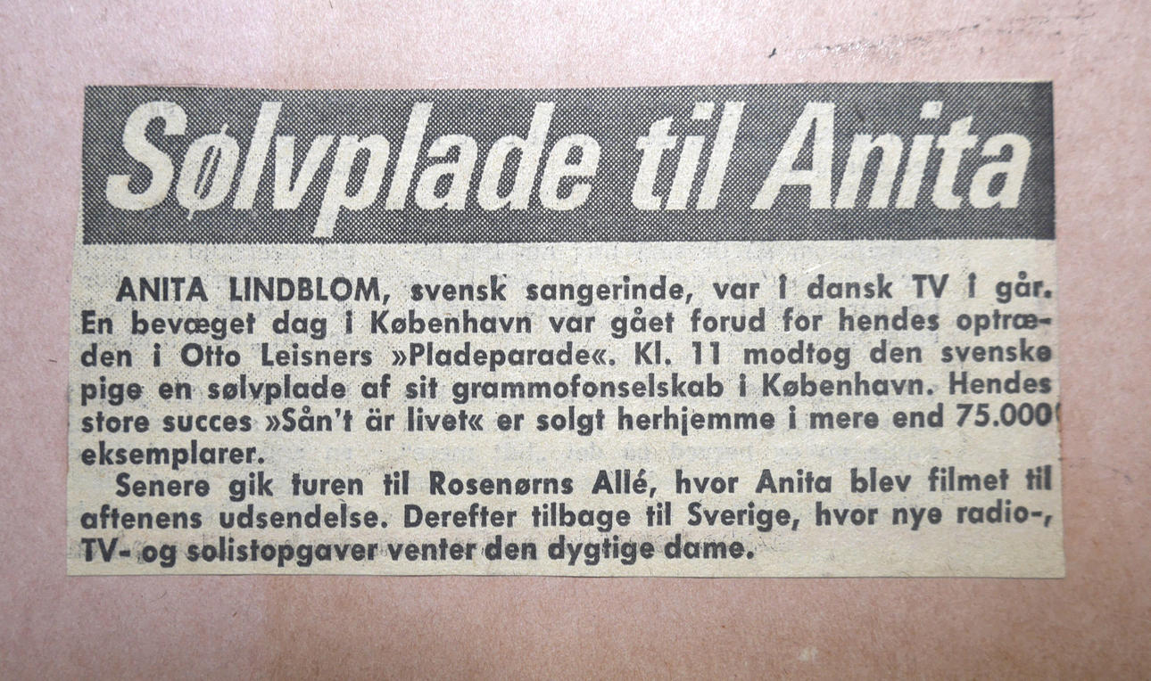 Sådan er livet – jeg fortryder intet. 34,5x26cm, skivediameter 17,5cm, "Til Anita Lindblom afleveret, da der blev solgt 100.000 eksemplarer af Sådan er livet ikke 2/2 1962 AB Philips Sonora". Ramme og glas "Sånt är lievet" fra 1961, med tekst af Stikkan Anderson, er et af de mest elskede numre i svensk hithistorie. Det blev Anita Lindbloms signaturmelodi og en hitlistesucces i flere lande. Anita sang den på svensk, engelsk og tysk.