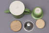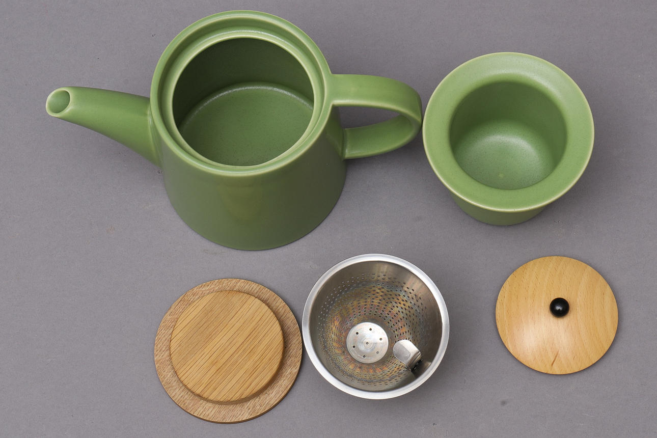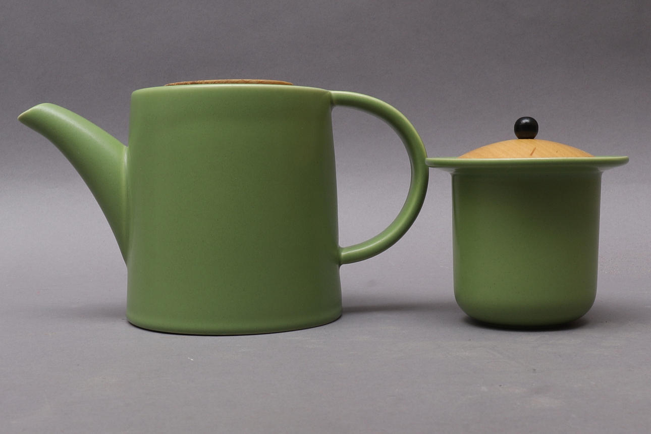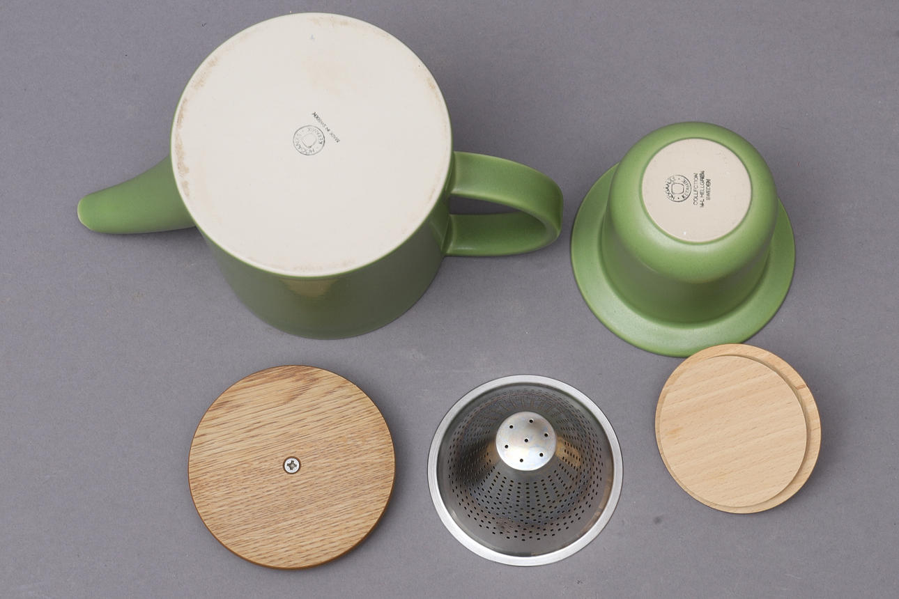 Tekande, med trælåg og te-si i metal. Højde ca 14,5 cm Krukke med trælåg, højde ca 12 cm Kande, højde ca 8,5 cm Krus, 1/2 liter.