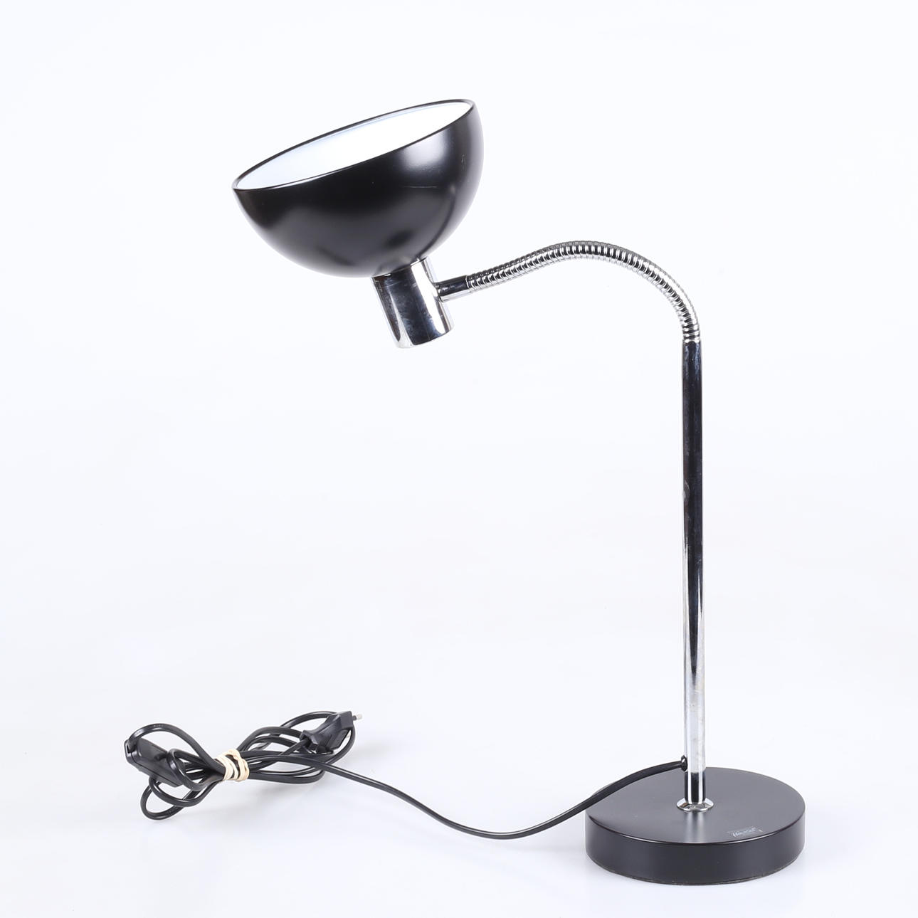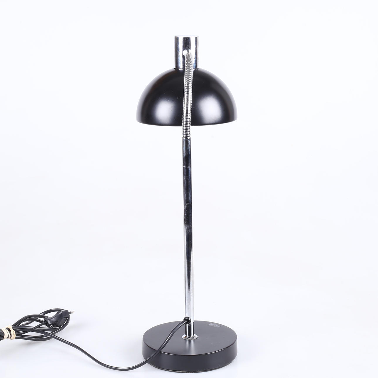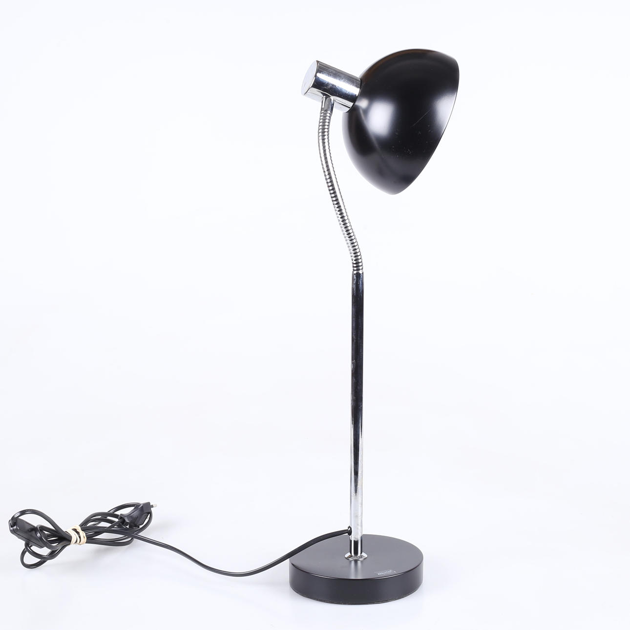 Sortlakeret og forkromet metal, bøjelig arm, højde ca 46 cm.