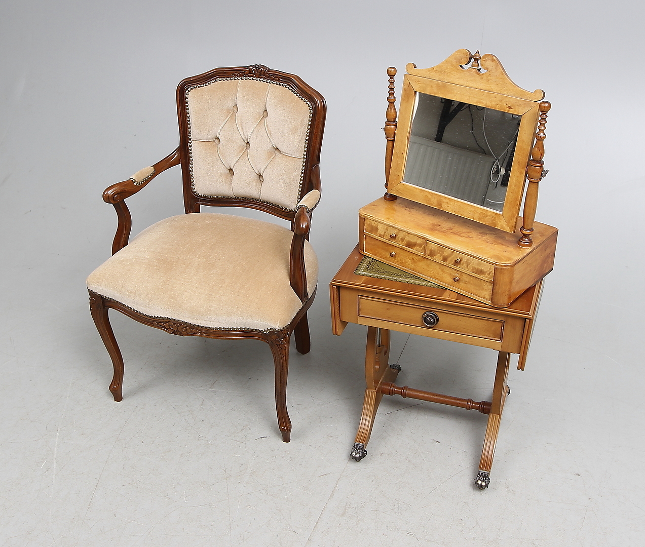 161651. SOVEVÆRELSESBORD, engelsk stil, griseskuer 1800-tallet, polstret lænestol.