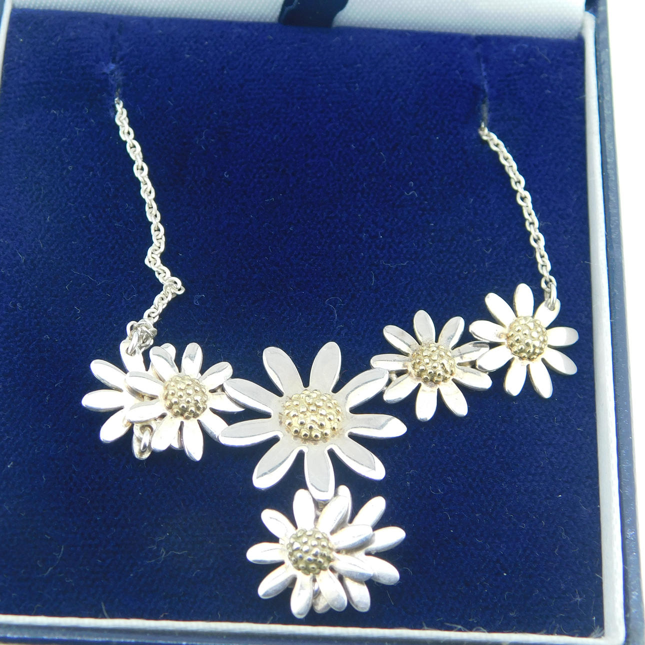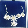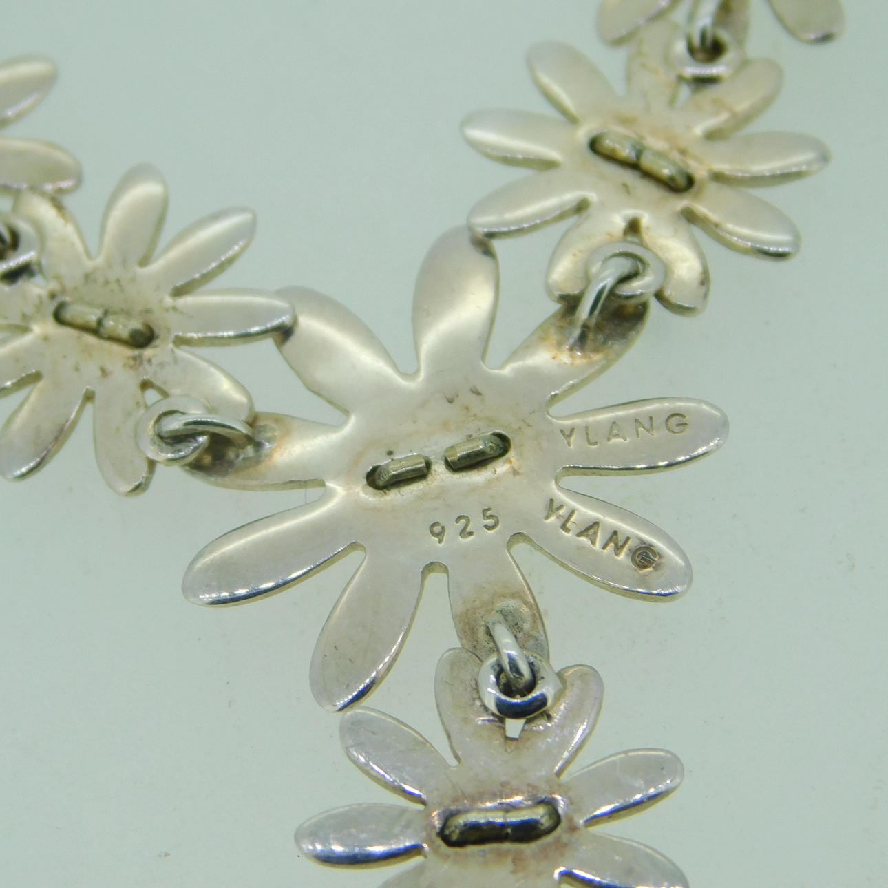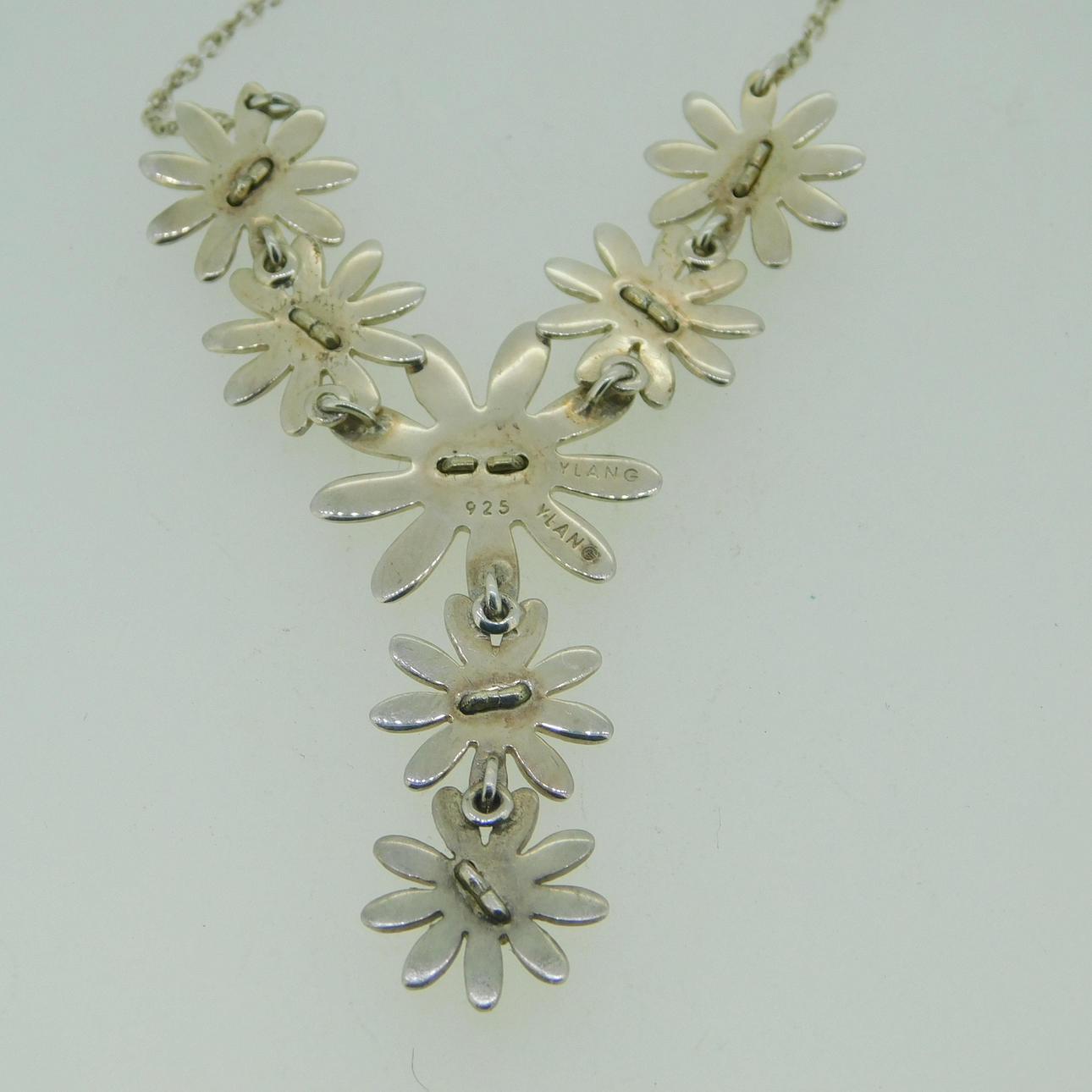 Sølv Ylang Ylang halskæde med margueritter dekoration og marguerit drop Halskæden er stemplet 925 (testet som sølv) Tusindfrydens centre er forgyldt / effekt Halskæden er ca 16" (40,5 cm) i længden og er bygget af 5 tusindfryd som en integreret del af længden af kæden med en ekstra dråbe på 2 tusindfryd, som er ca. 1¼" (3,2 cm) og vægten af hele halskæden er 8g. Producenten er Ylang Ylang, som blev grundlagt i 1985 i Florida, USA af Ray og Lois Morganstern Halskæden er i en J Lawrence (Newbury) æske, som vejer 61,6 g, så den samlede vægt er 69,6 g.