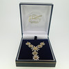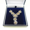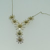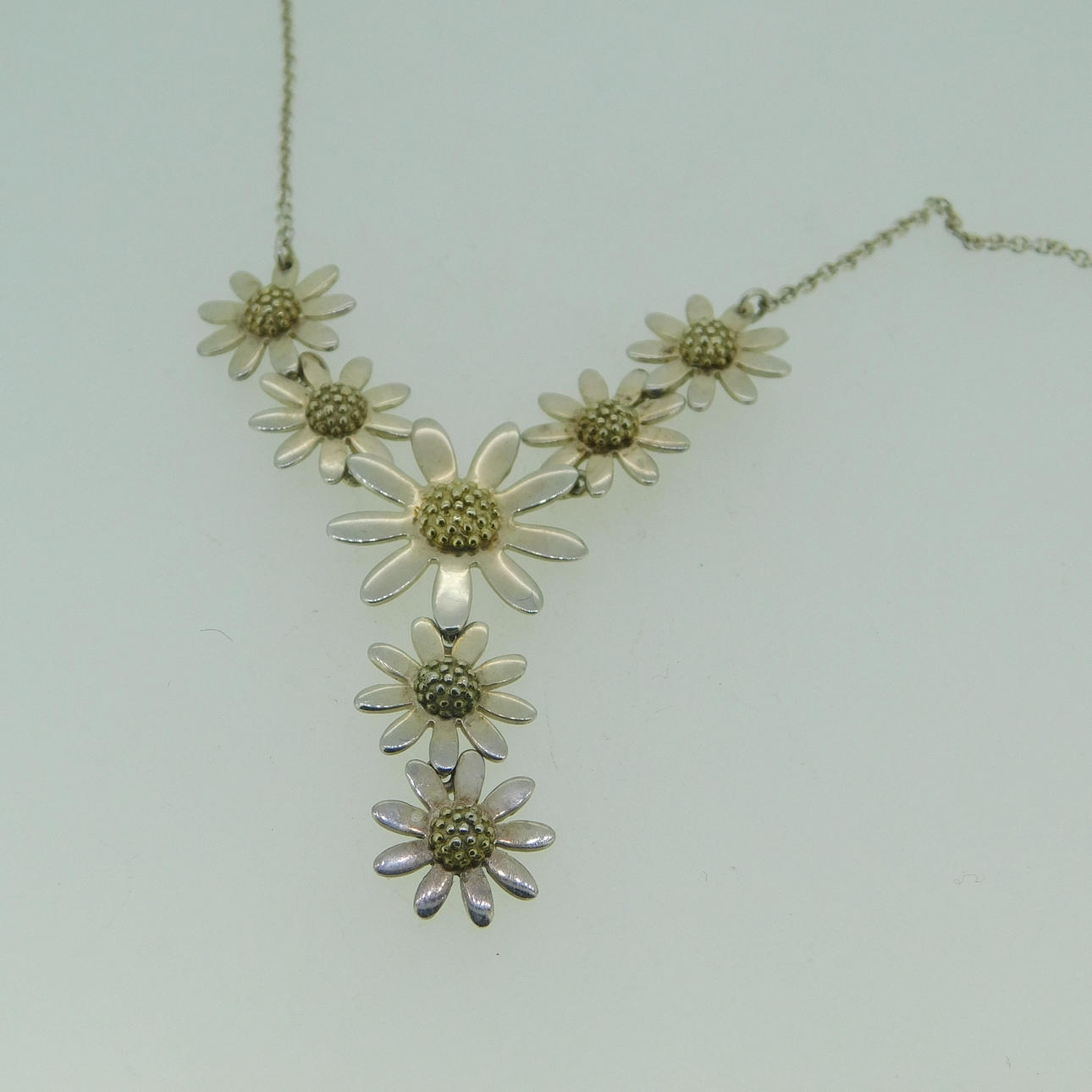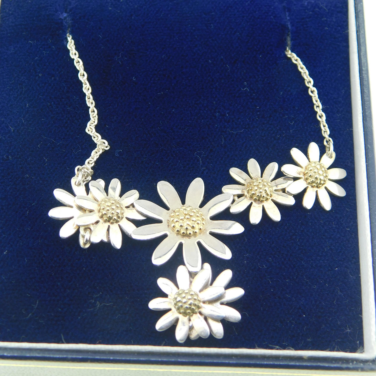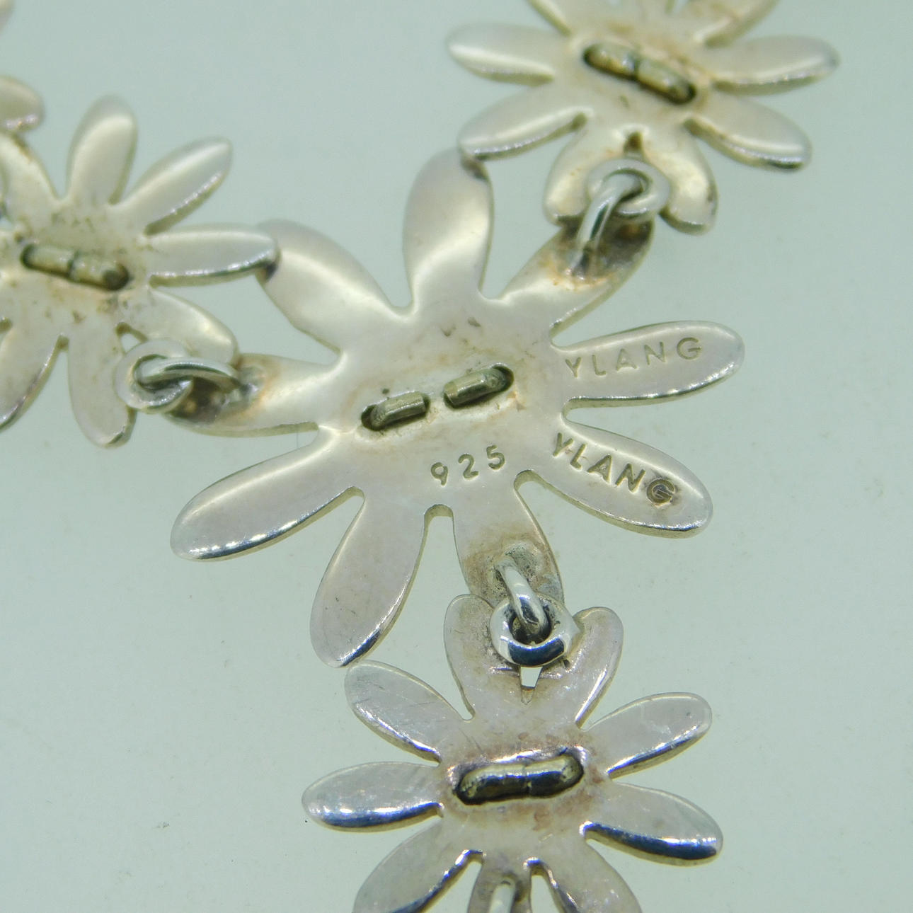 Sølv Ylang Ylang halskæde med margueritter dekoration og marguerit drop Halskæden er stemplet 925 (testet som sølv) Tusindfrydens centre er forgyldt / effekt Halskæden er ca 16" (40,5 cm) i længden og er bygget af 5 tusindfryd som en integreret del af længden af kæden med en ekstra dråbe på 2 tusindfryd, som er ca. 1¼" (3,2 cm) og vægten af hele halskæden er 8g. Producenten er Ylang Ylang, som blev grundlagt i 1985 i Florida, USA af Ray og Lois Morganstern Halskæden er i en J Lawrence (Newbury) æske, som vejer 61,6 g, så den samlede vægt er 69,6 g.