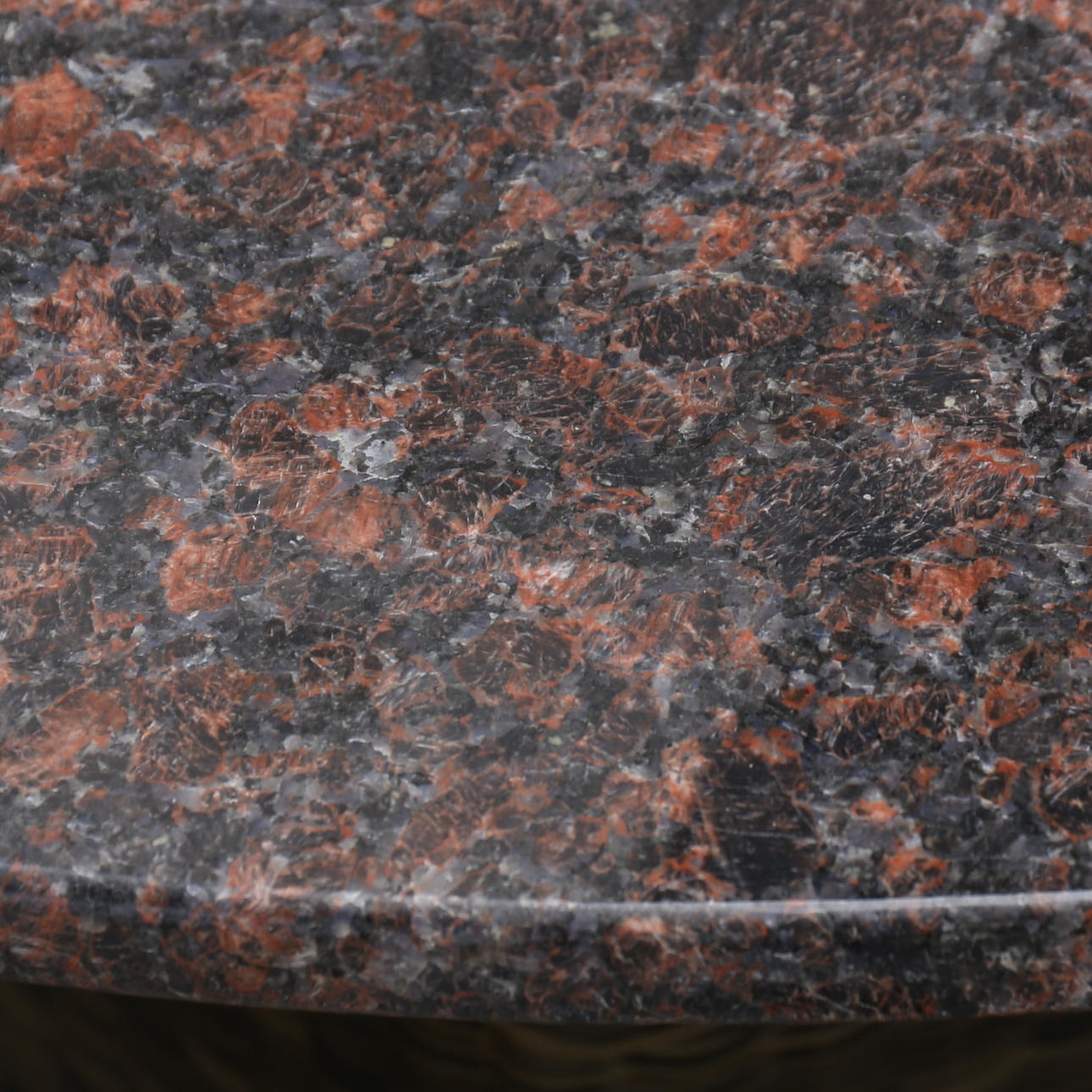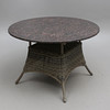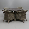 Bord med stenplade, højde 72 cm, diameter 110 cm. Stole 4, ryghøjde 79, sædehøjde 44, bredde 61 cm.