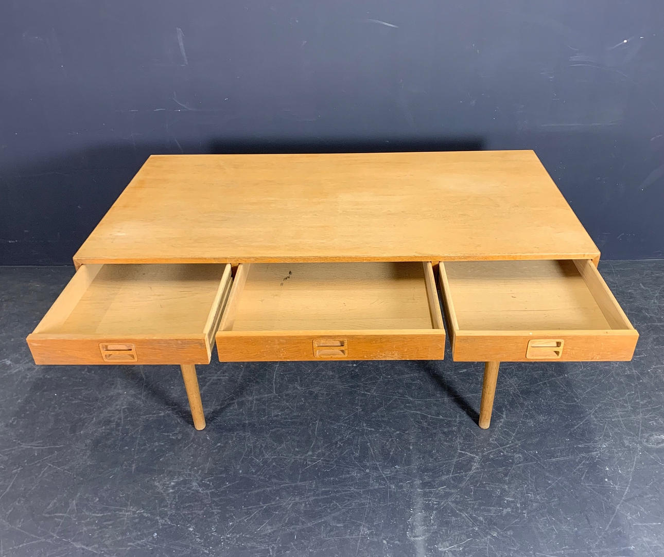 Skrivebord i eg med tre skuffer.