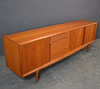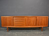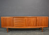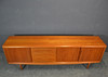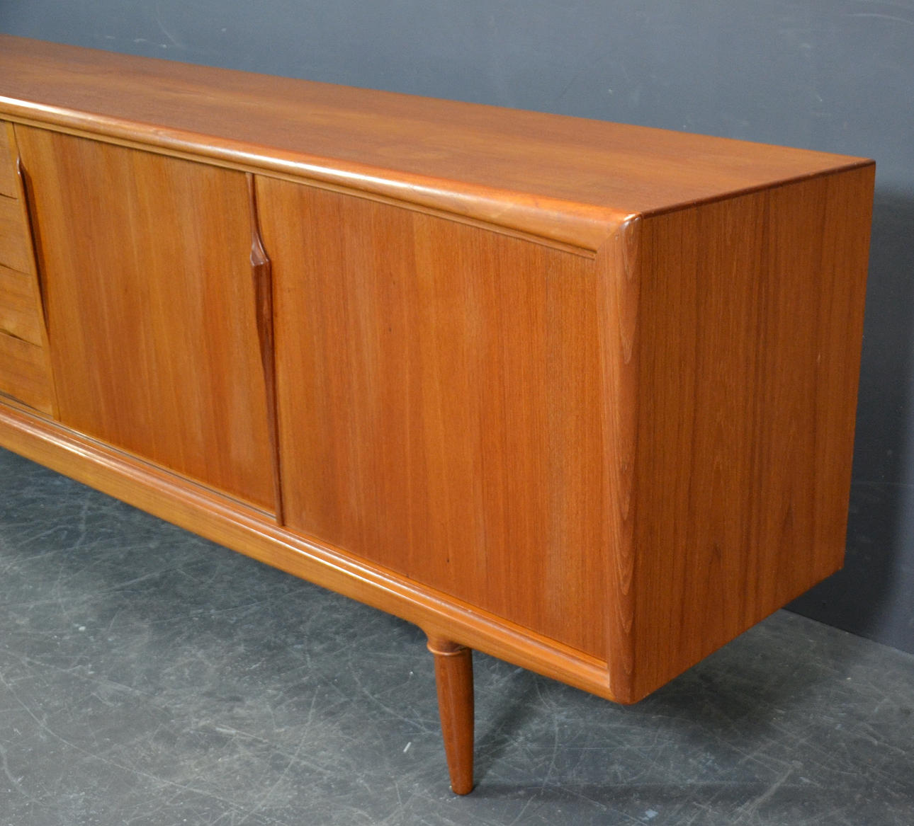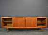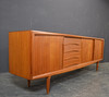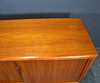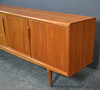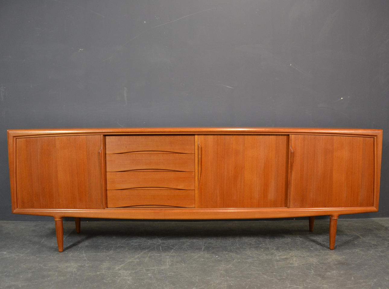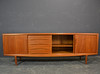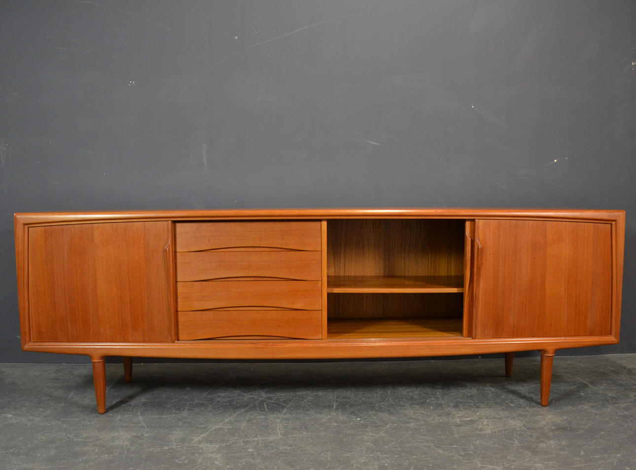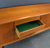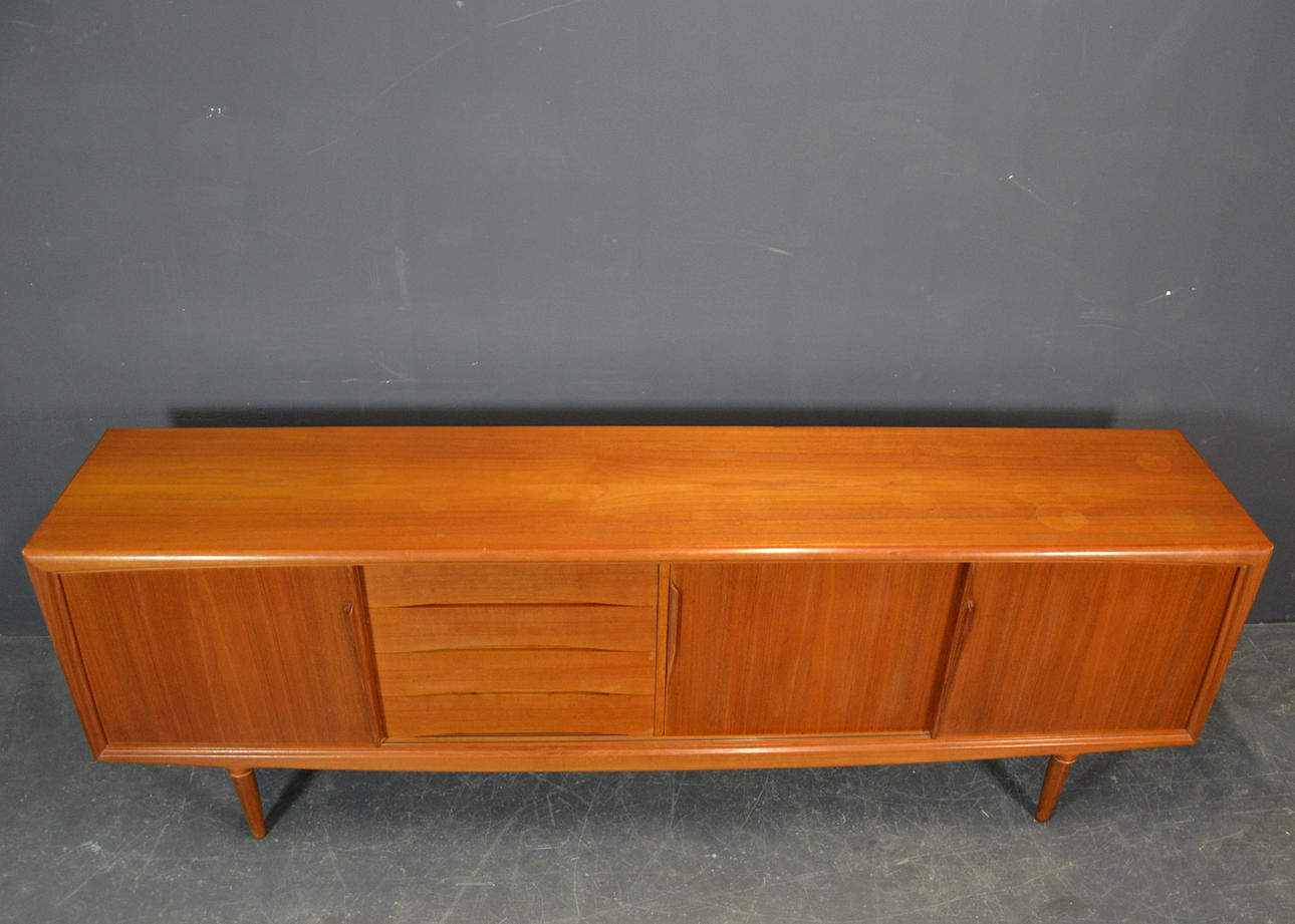 Teaktræ med skydelåger og skuffer.