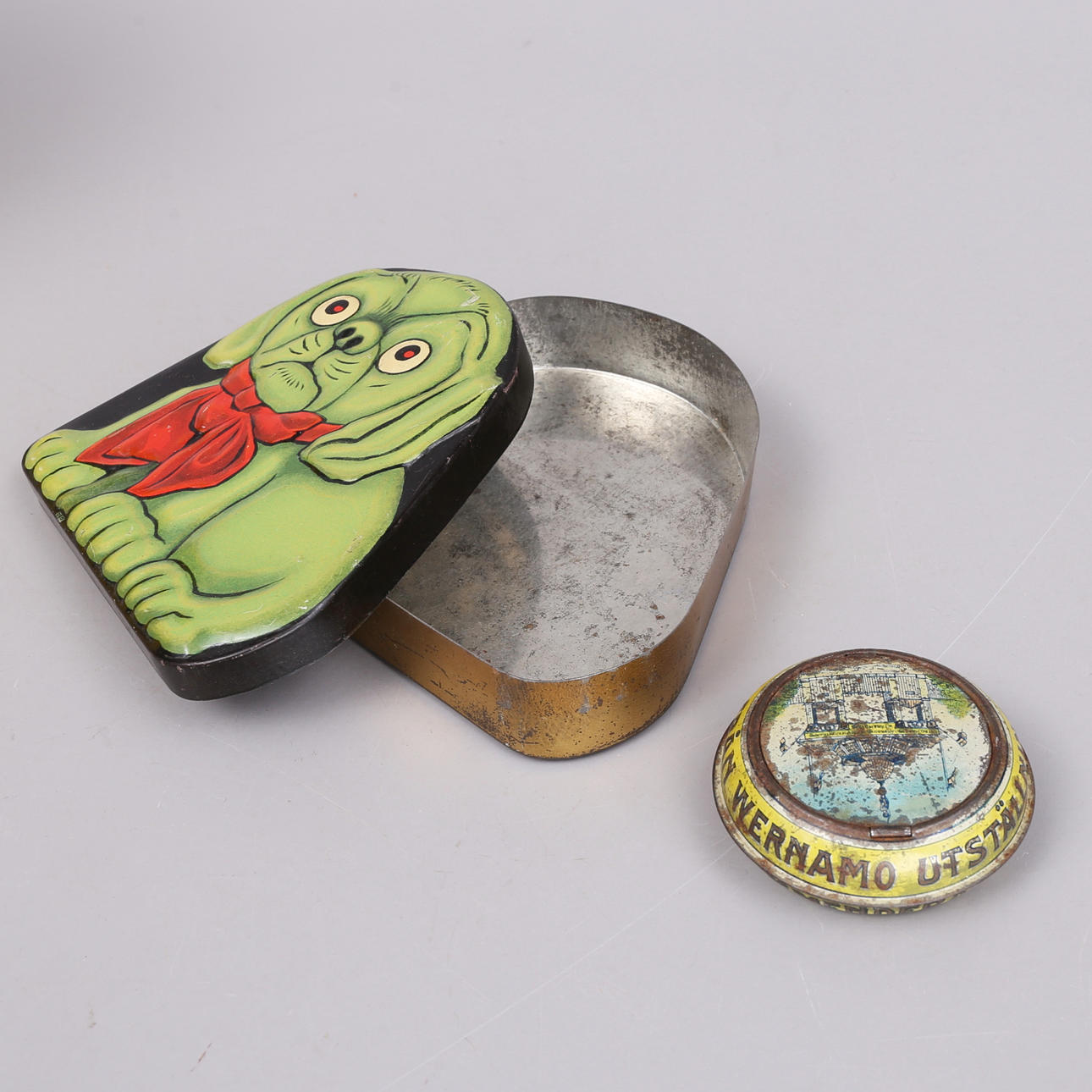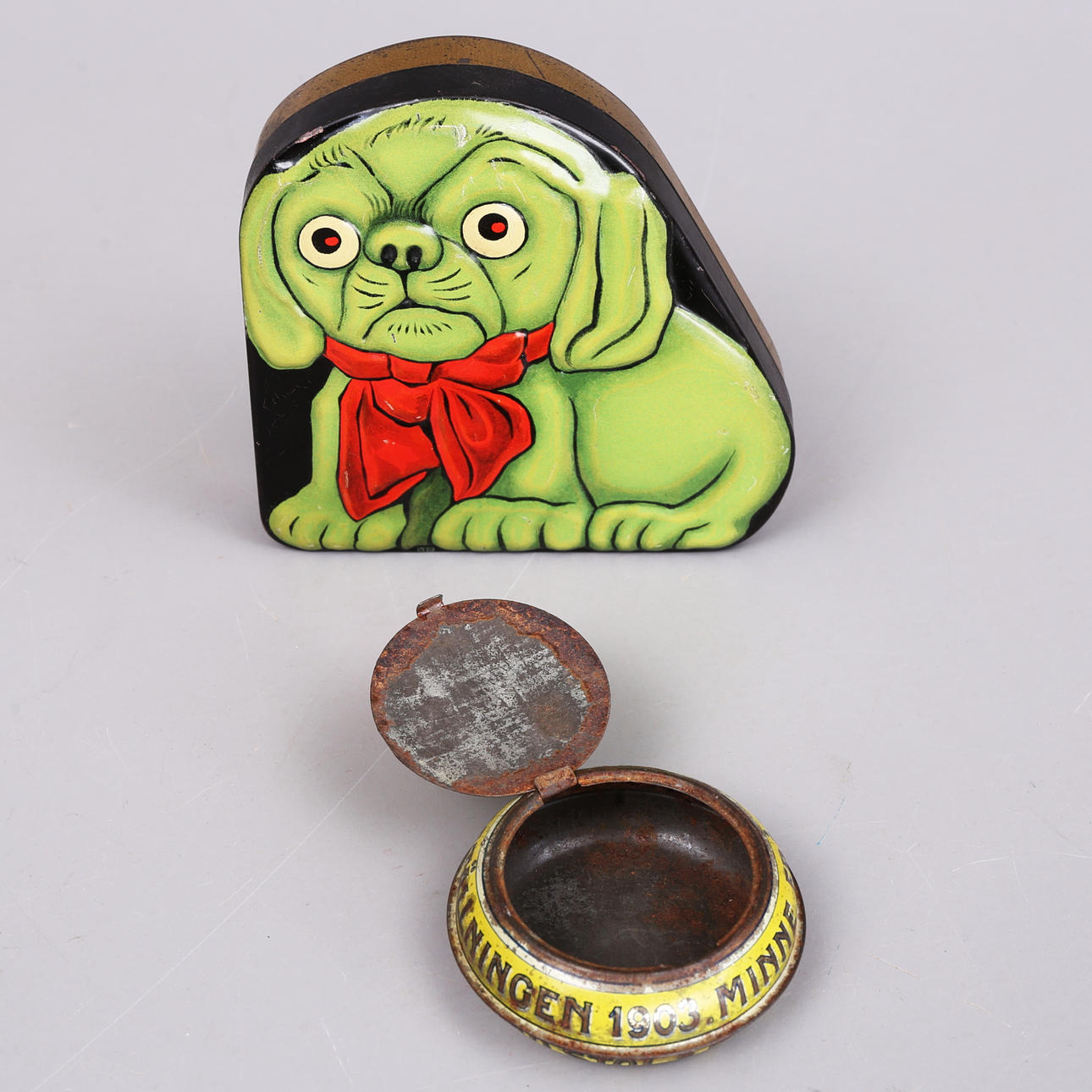 Blikdåse i form af en hund Lidköpings Konfektyr 13 x 12,5 cm.