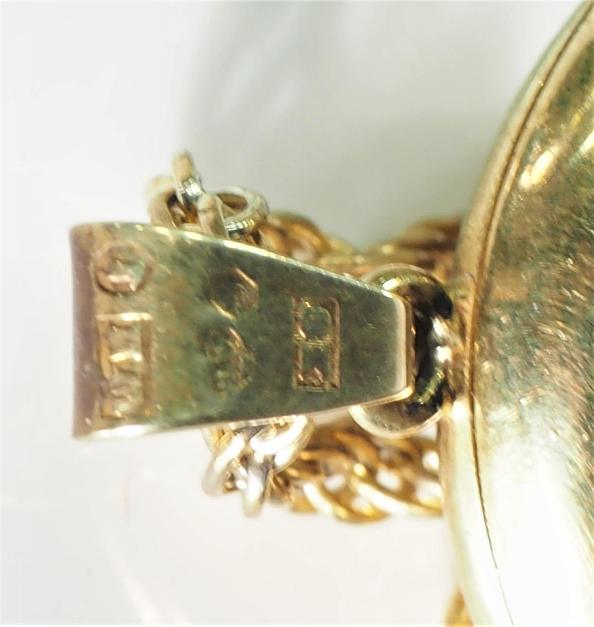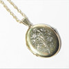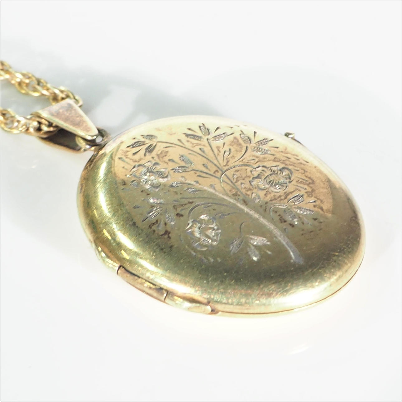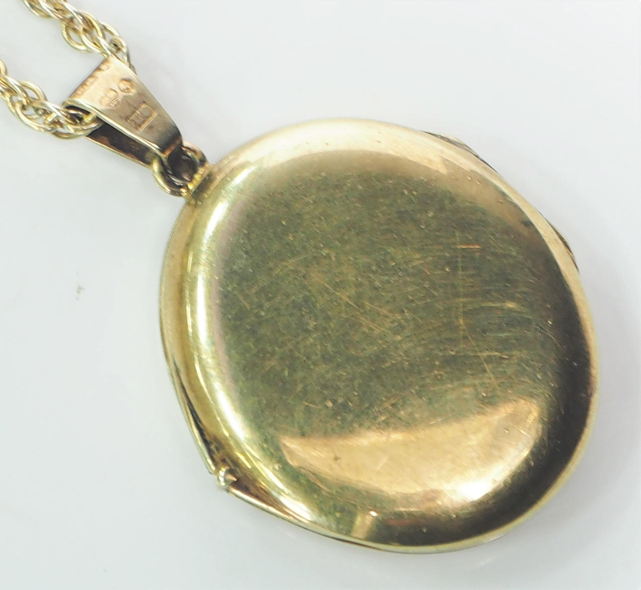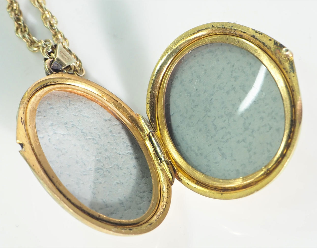 Oplukkelig medaljon til billeder, højde 3 cm. kædelængde ca 50 cm.