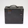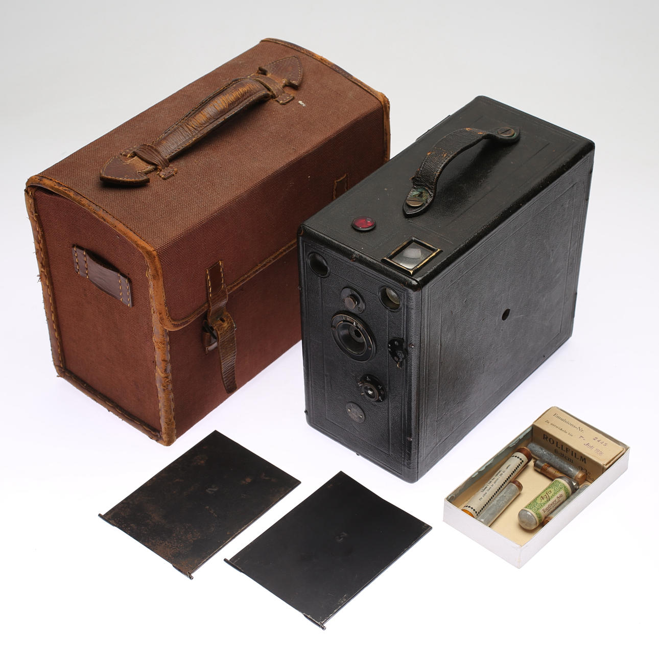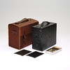 Læderbeklædt metalramme. Ekstra plader og tilbehør til fremkaldelse medfølger. Medfølgende taske medfølger. Længde ca 12, bredde 23, højde 21 cm.