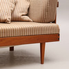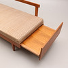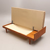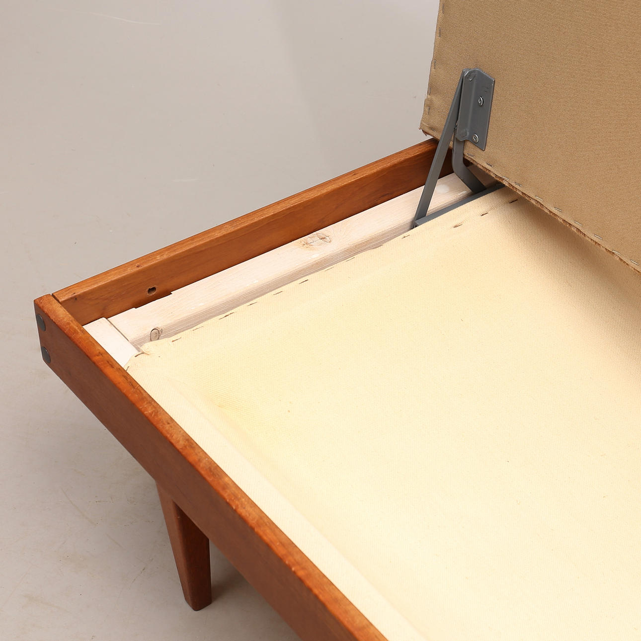 Opbevaring til sengetøj er under sædet, som løftes af hængsler.