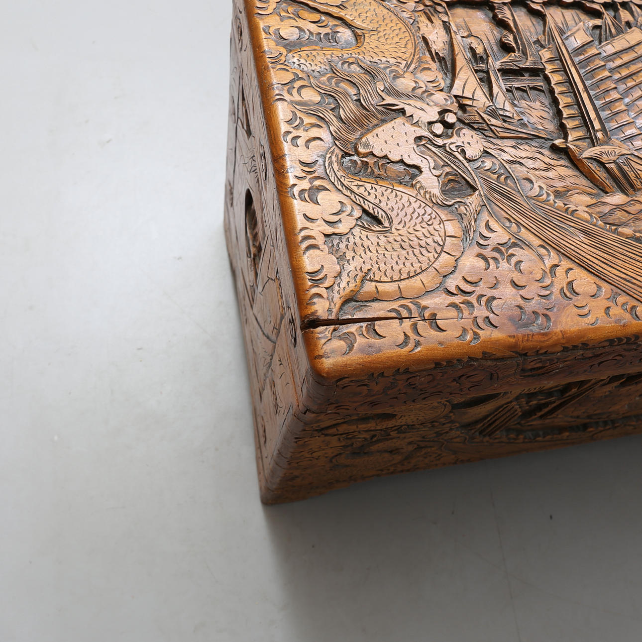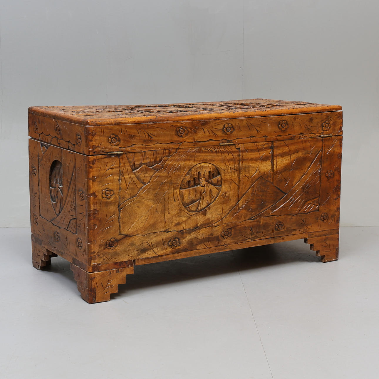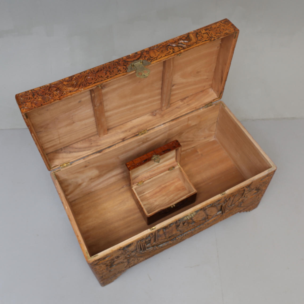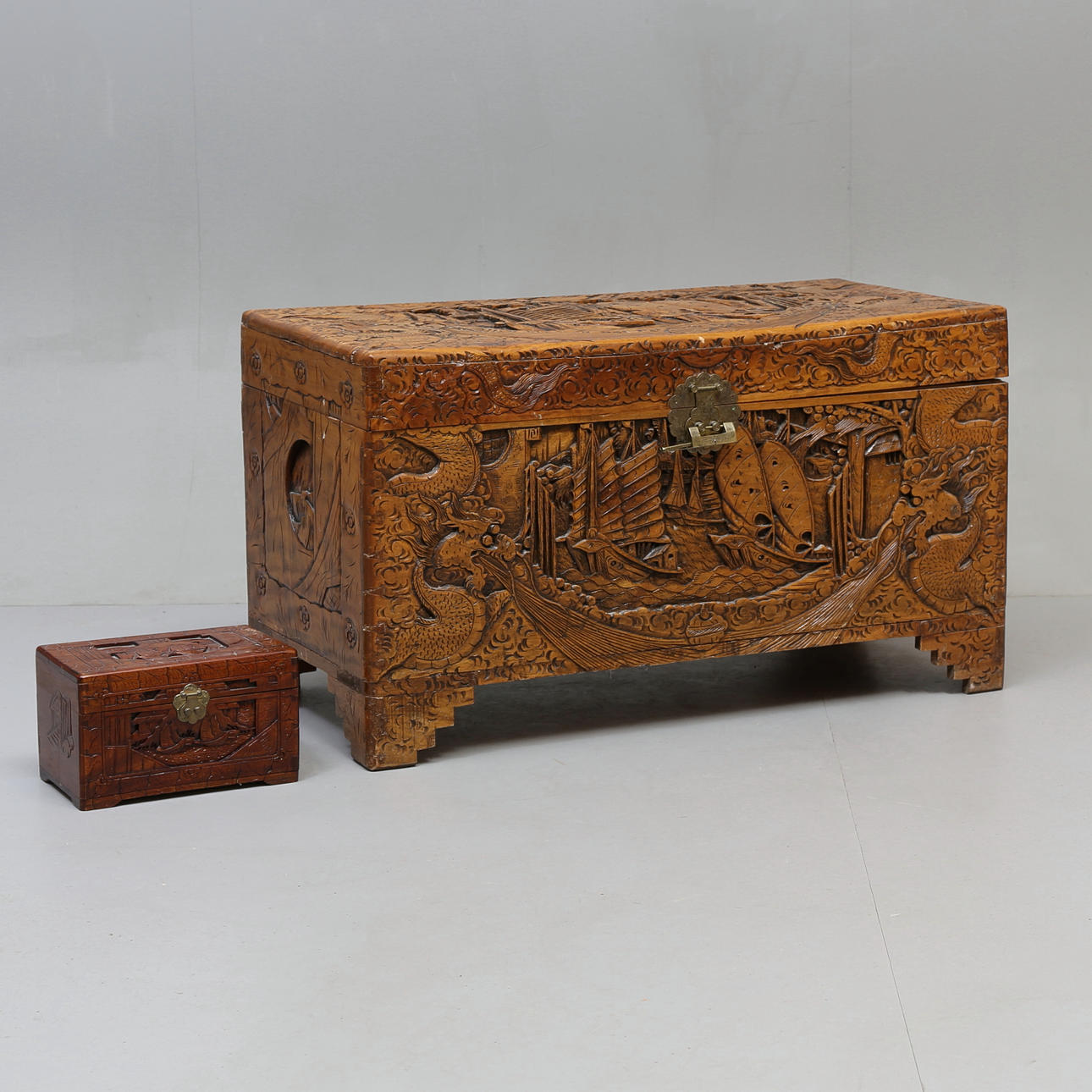 Arbejdslåsemekanisme Bryst, længde 101, bredde 51, højde 58 cm Kist, længde 31, bredde 19, højde 18,5 cm.