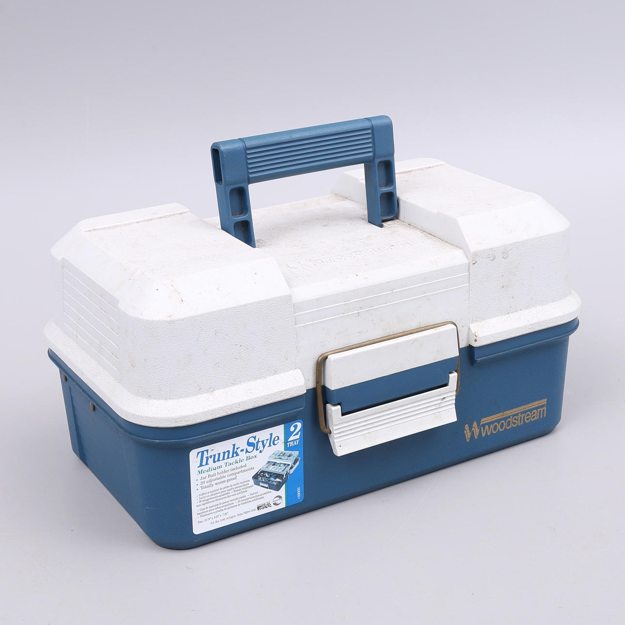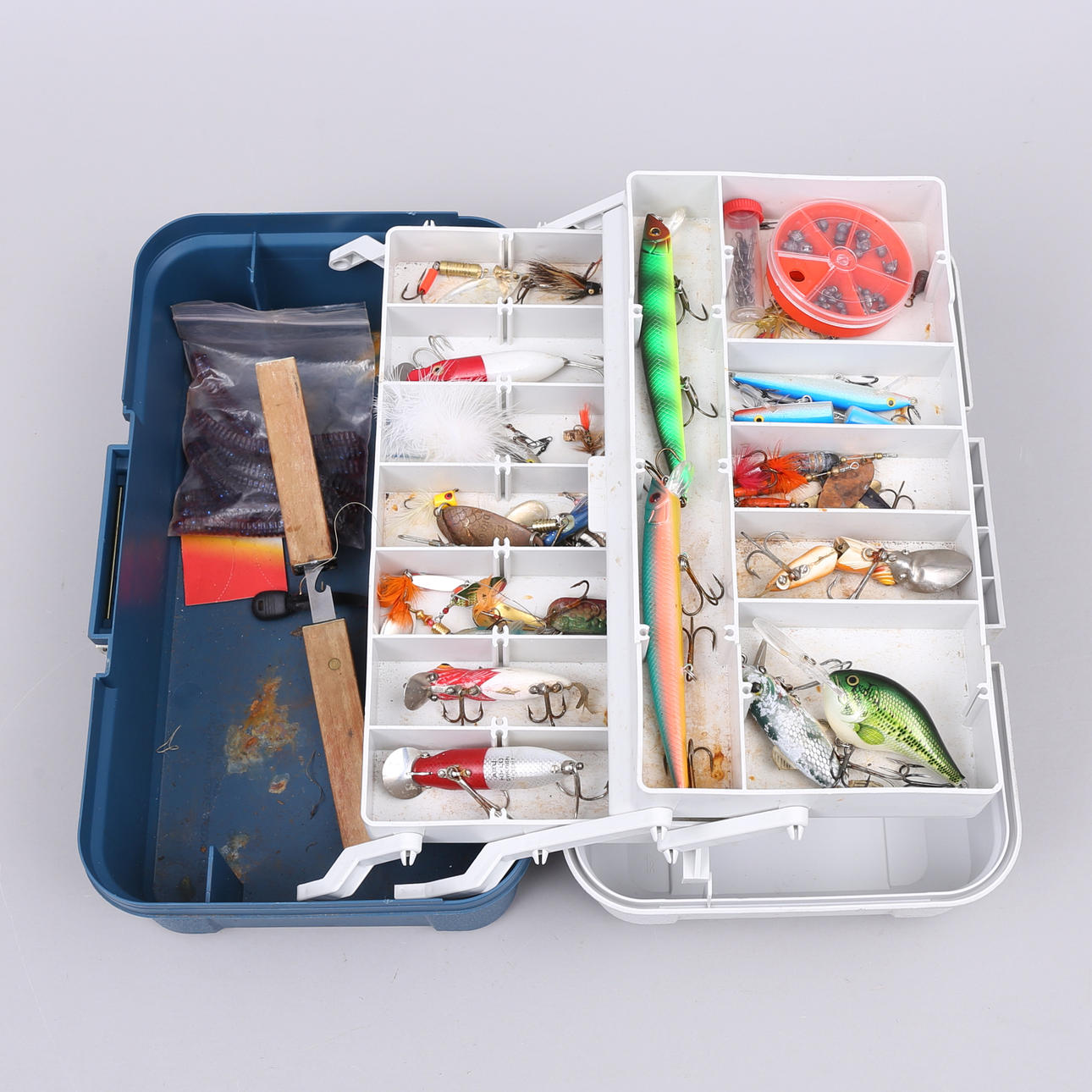 Fiskeboks 18 x 35 x 20 cm med kniv, wobler, spinner mm.