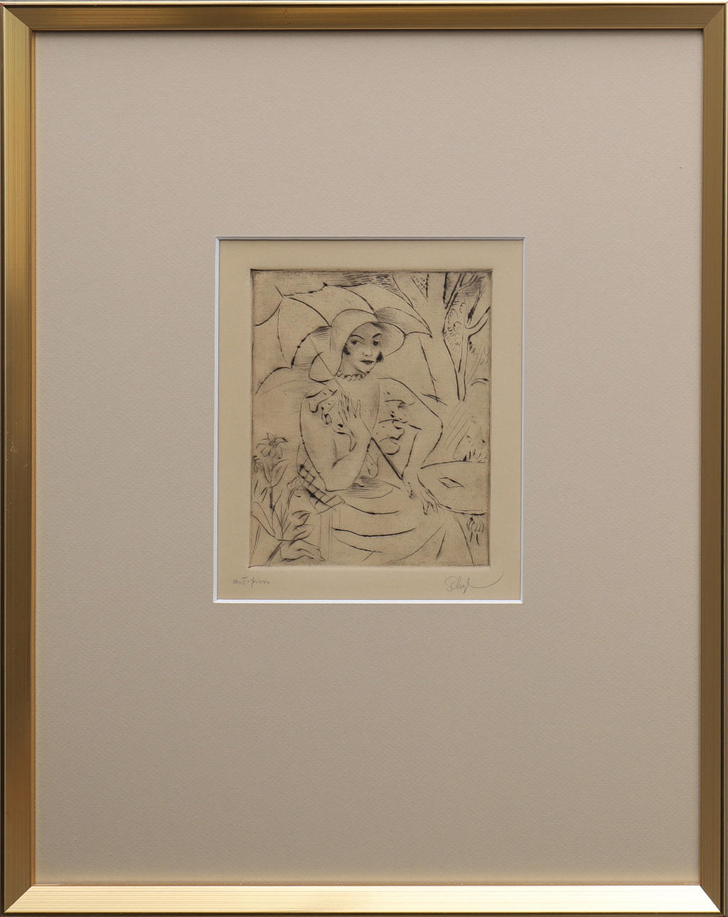 1664451. JULES SCHYL. KVINDE MED PARAPLY, radering.