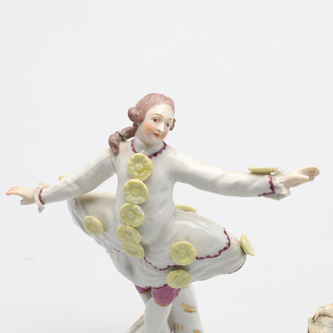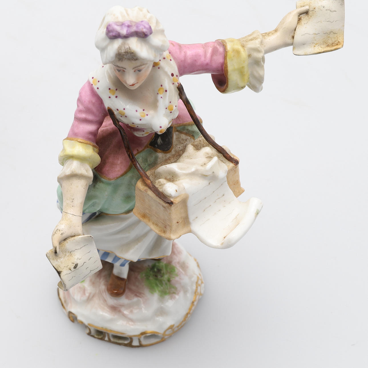 Volkstedt-figuren med restaurerede arme, den ene sat fast, den anden med afhuggede fingre.