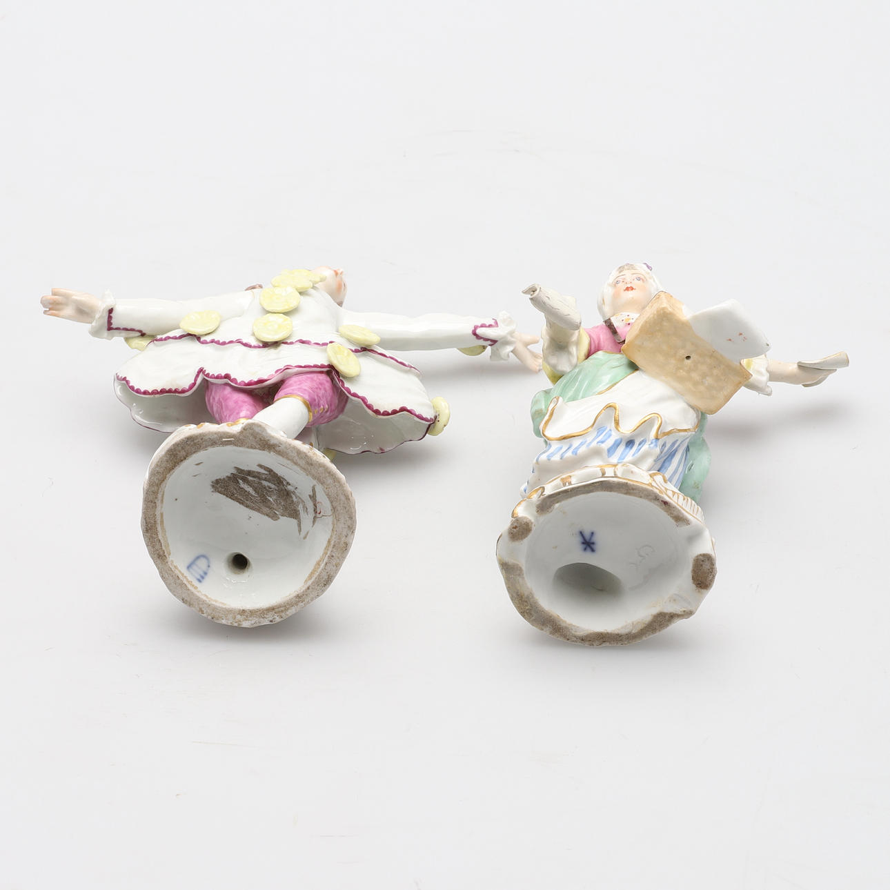 en Volkstedt-figur af en sedselsælger, på cirkulær rokokobund, 16 cm høj, den anden af en herredanser med påsat blomsterdekoration, 16 cm, pseudo Wienermærke i blåt, (2).