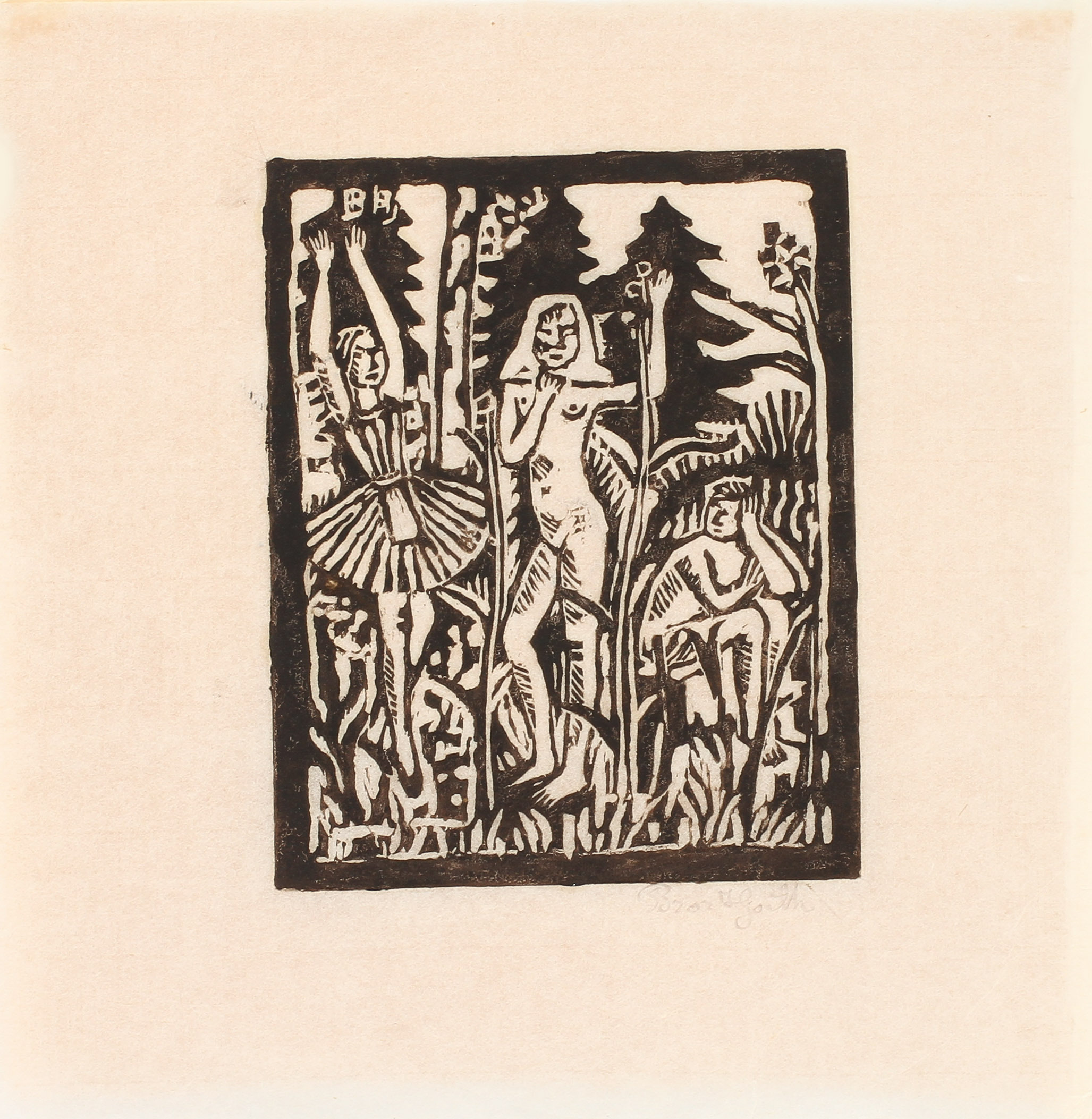 167622. BROR HJORTH. Figurkomposition, træsnit, signeret.