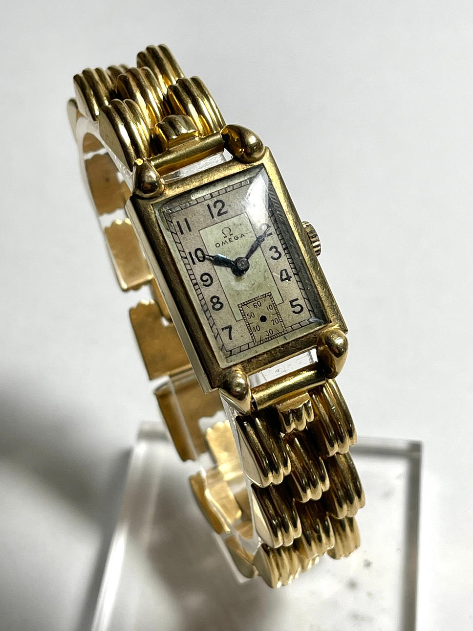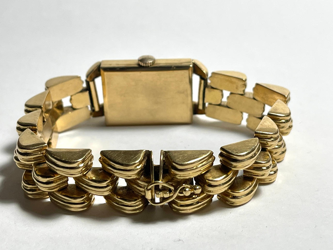 18K guld urkasse og armbånd. Med en diameter på 34 x 21 mm. Original grå urskive. Mikrosekunder ved seks. Manuel optræksbevægelse. Samlet vægt 55 gram.
