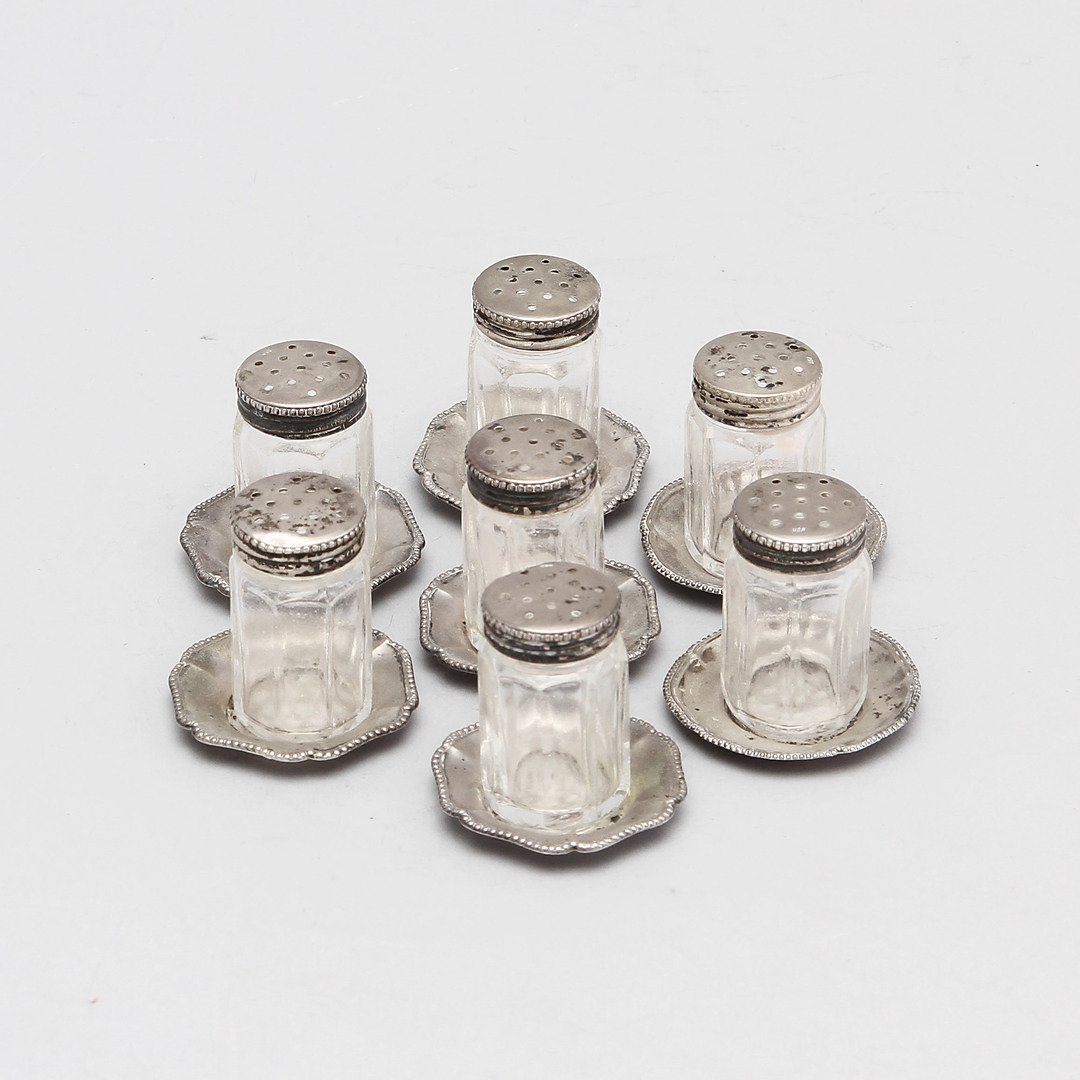 168847. DISTRIBUTØR PÅ FAD, 7 stk, sølv og glas, importstempler.