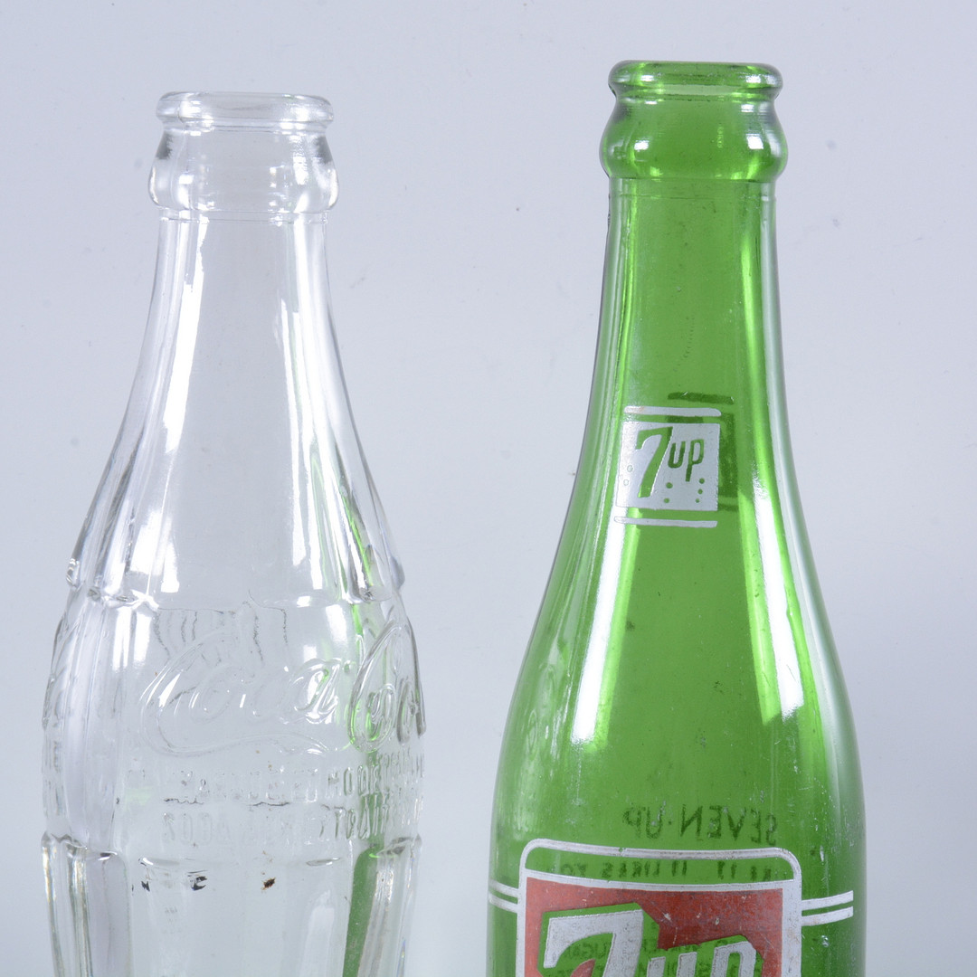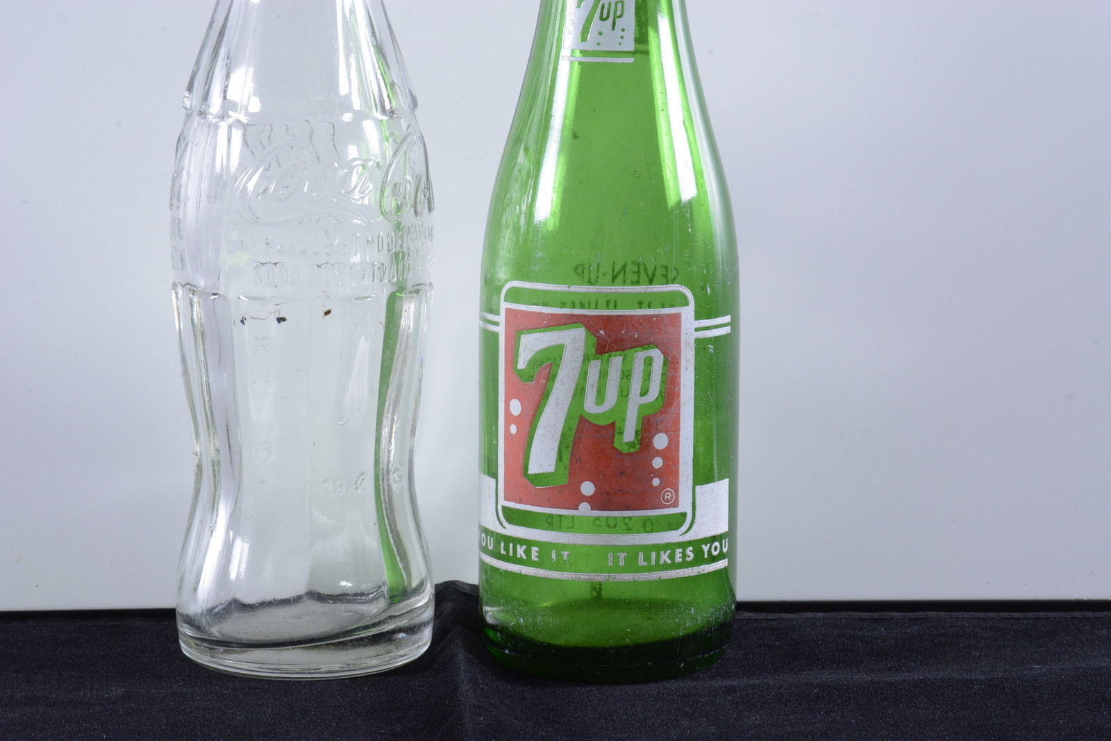 1691521. FLASKER, 2 stk, glas, Coca Cola og 7up, 1950'erne.