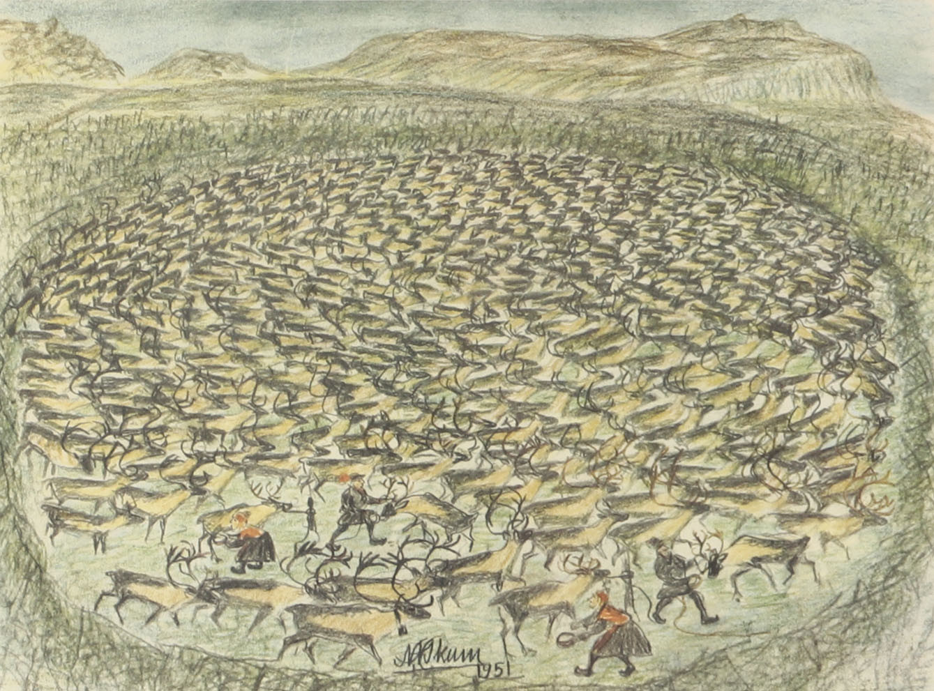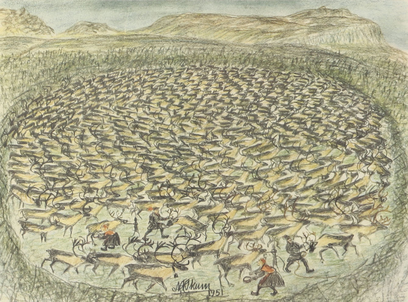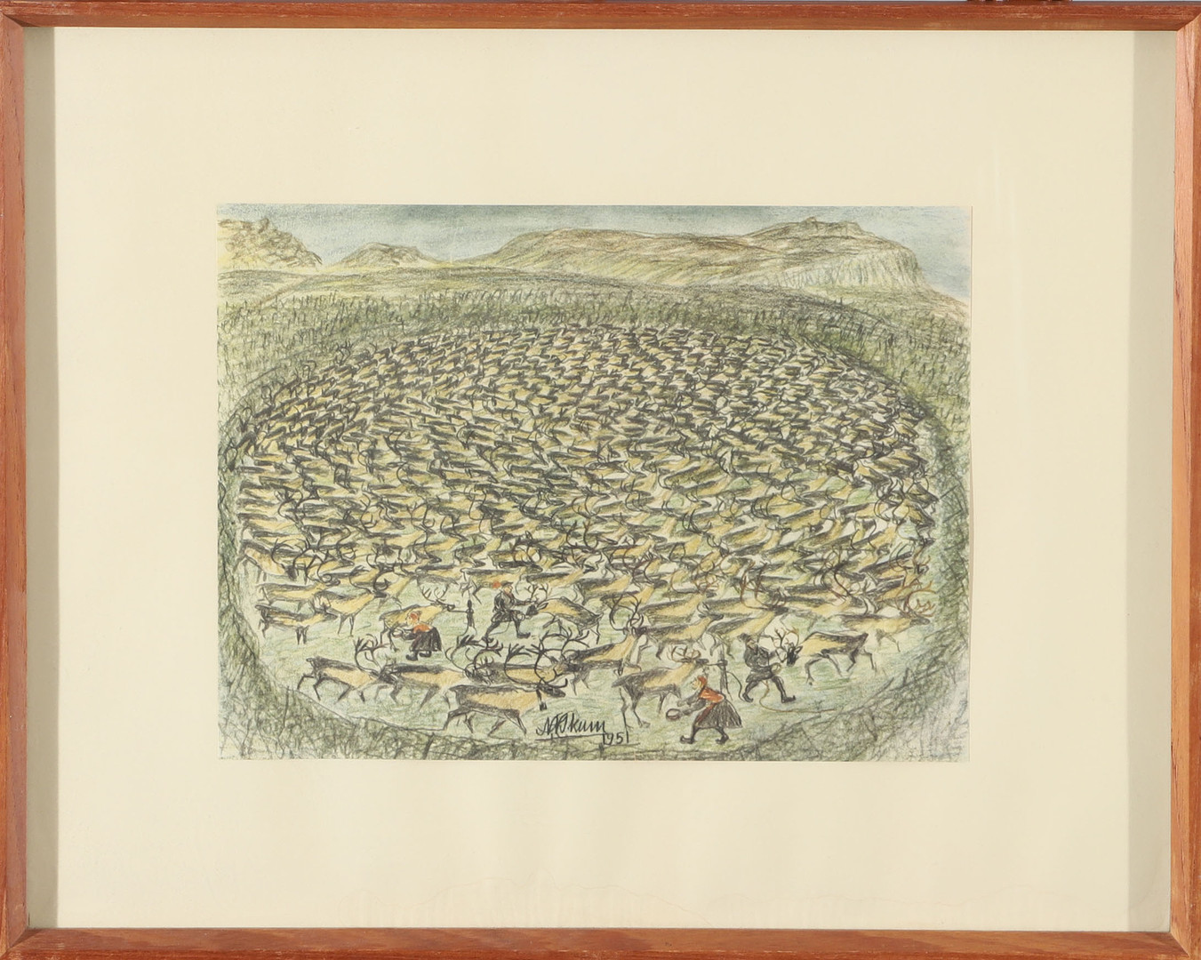 1705097. NILS NILSSON SKUM. EFTER. Rensdyrsamling, tryk i teakramme.