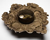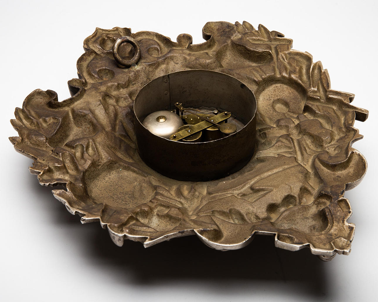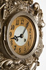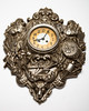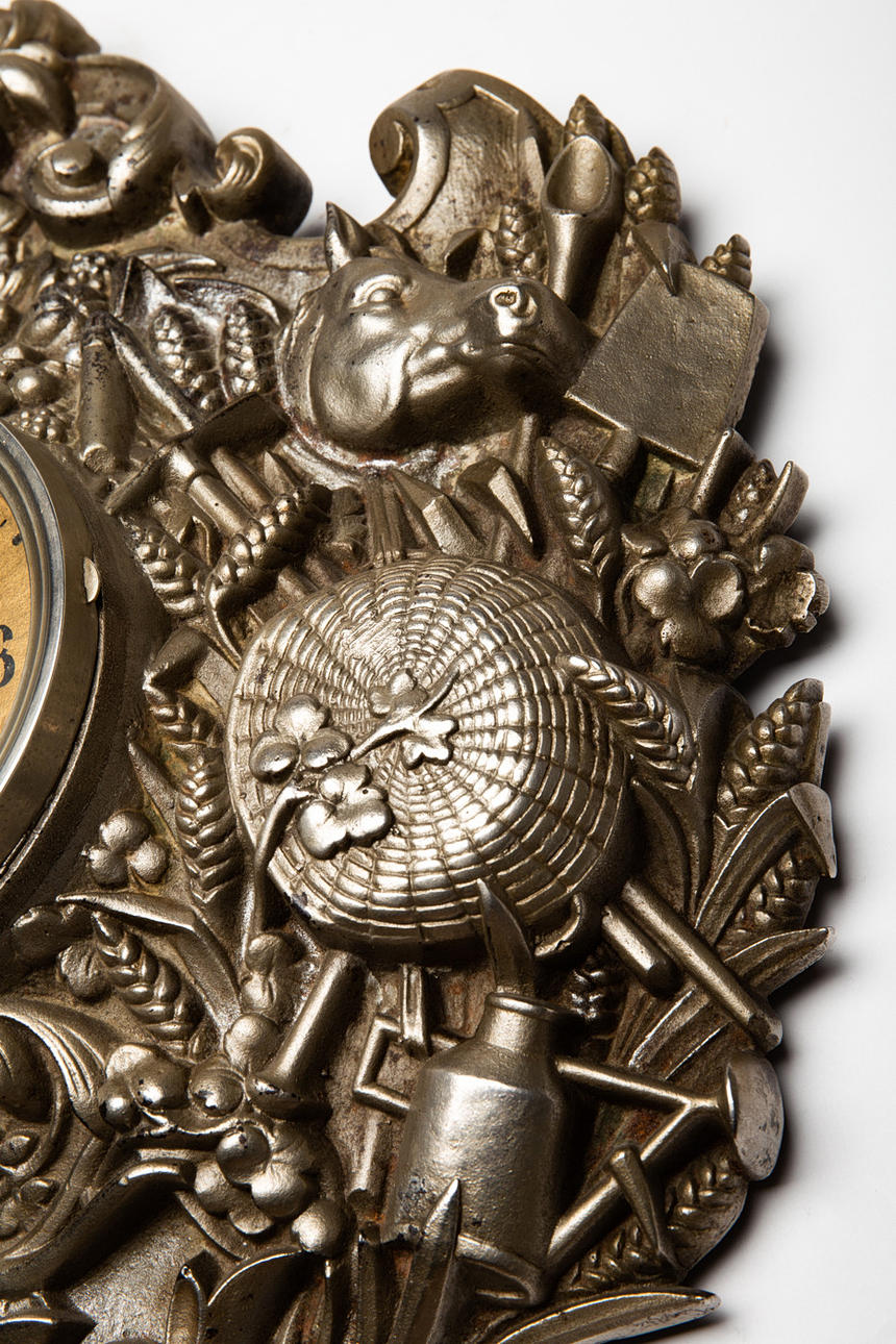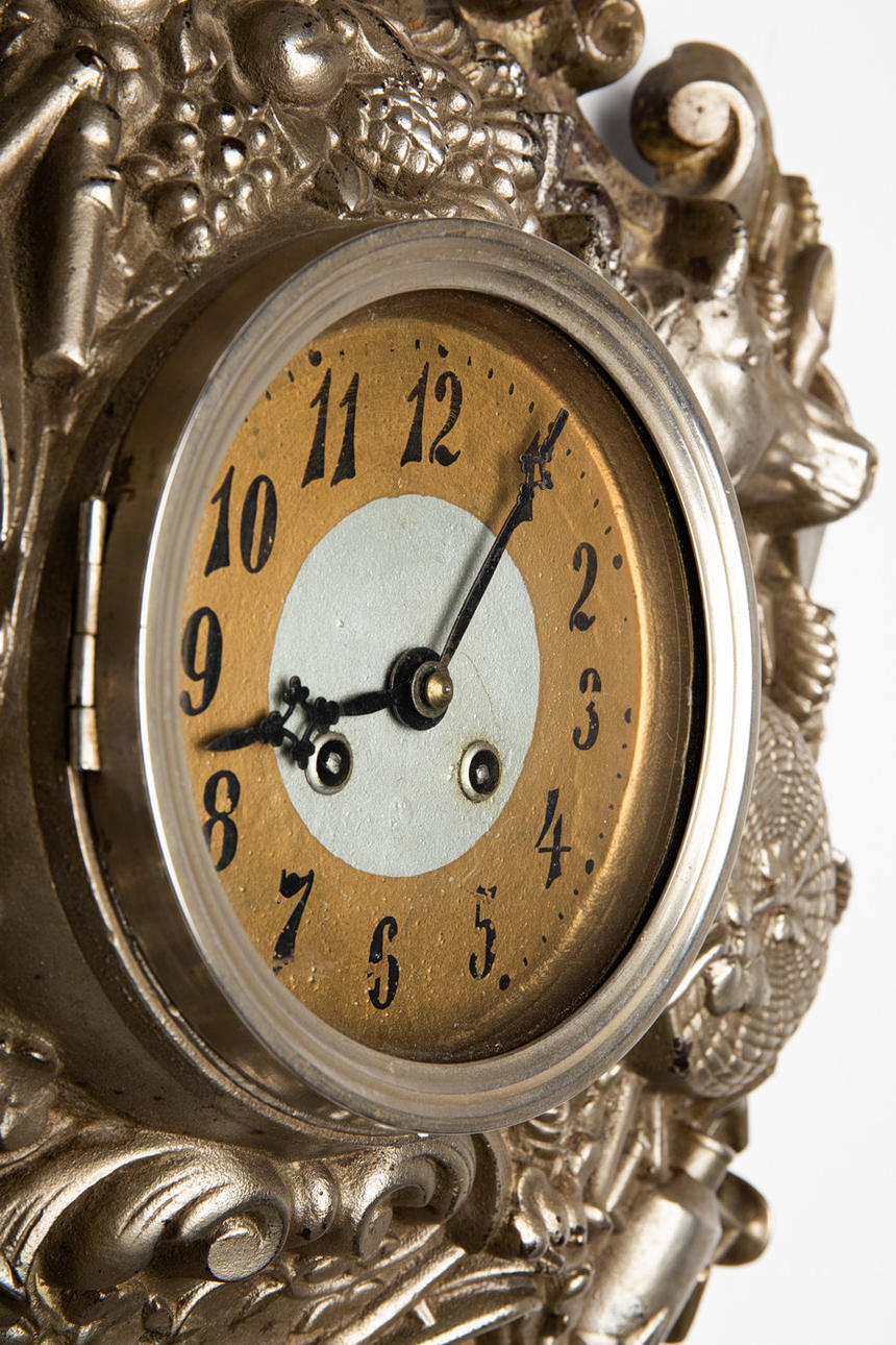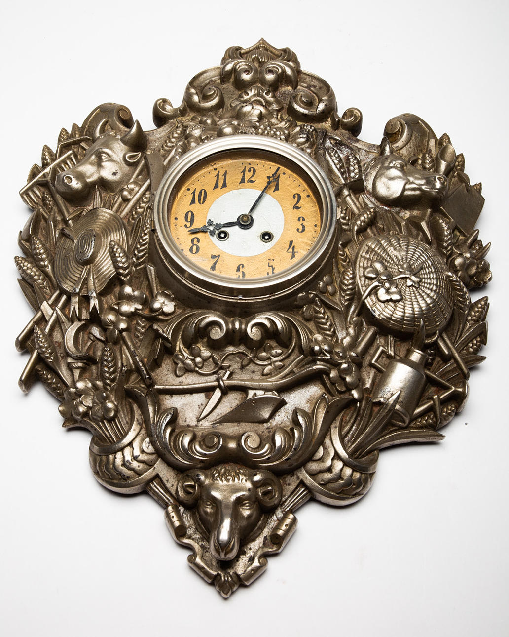 ur / vægur, metal, glas. Vægur med urskive i polykrom farve og sorte arabertal, forsynet med metalramme og ornamenteret med forskellige dyrerelieffer i bondeoptik, lukket med nøgle. H.57cm, B.43cm, D.10.5cm.