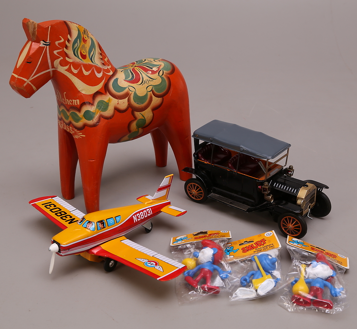 170742. LEGETØJ 6 stk. Blikbil, fly, dalahest, smølfer.