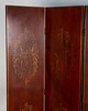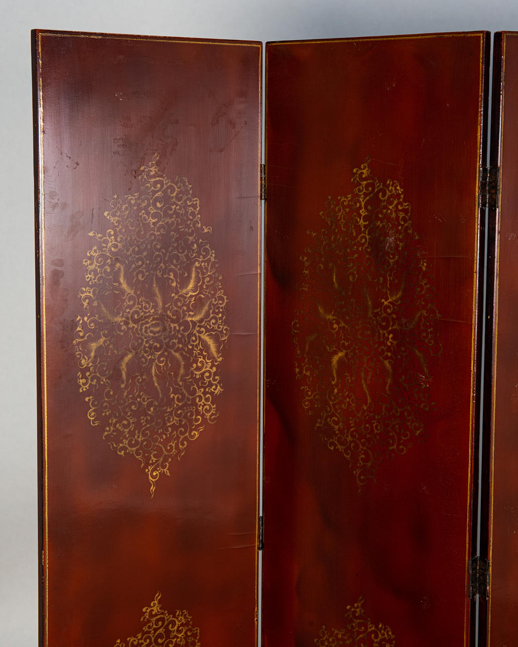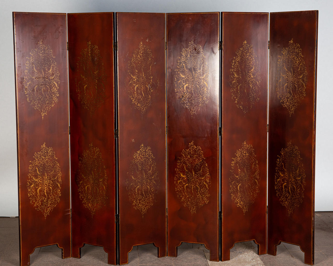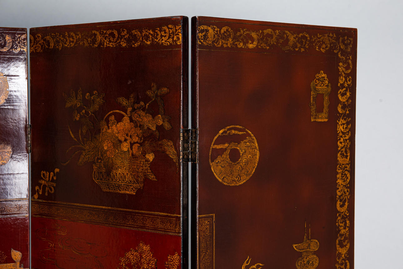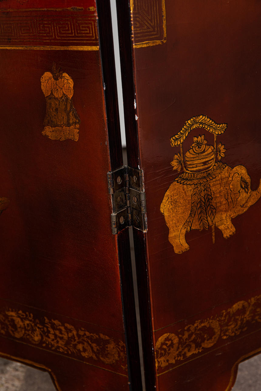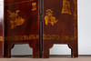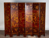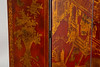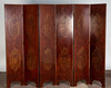 Skærm / rumdeler, træ, lak, Asien. Seksdelt skærm af rød- og sortlakeret træ med figurbilleder på ydersiden og ornamental kant, H.180cm, L.40-240cm.