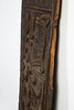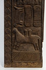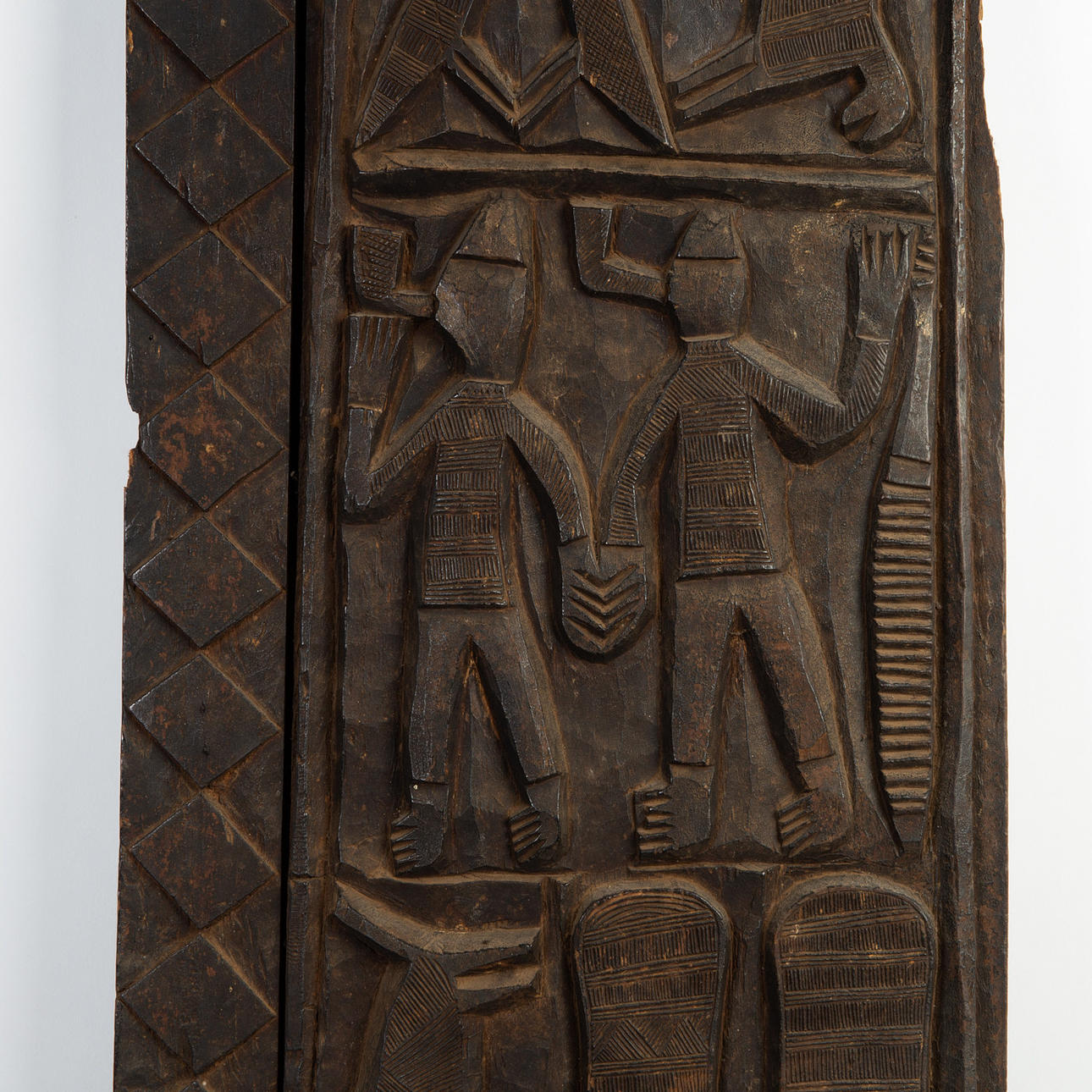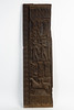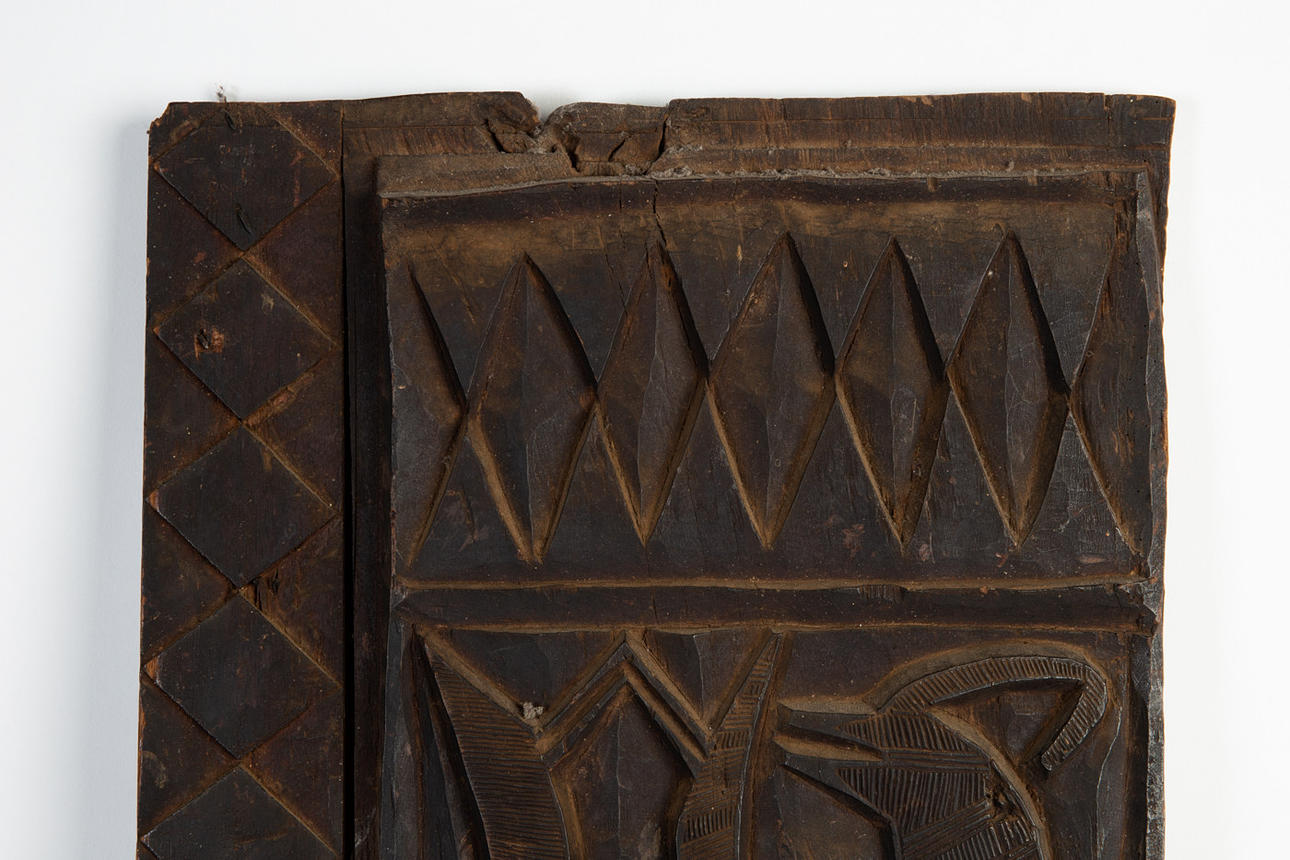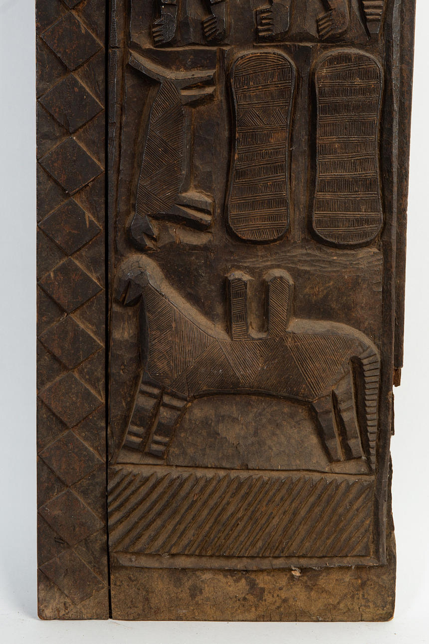Dør / lagerdør, træ, Vestafrika. Rektangulært dørblad af træ, dekoreret med et firezoners udskåret relief med forskellige dyre- og figurrepræsentationer, indrammet af geometriske udskårne mønstre, H.170cm, B.47cm, D.9cm.