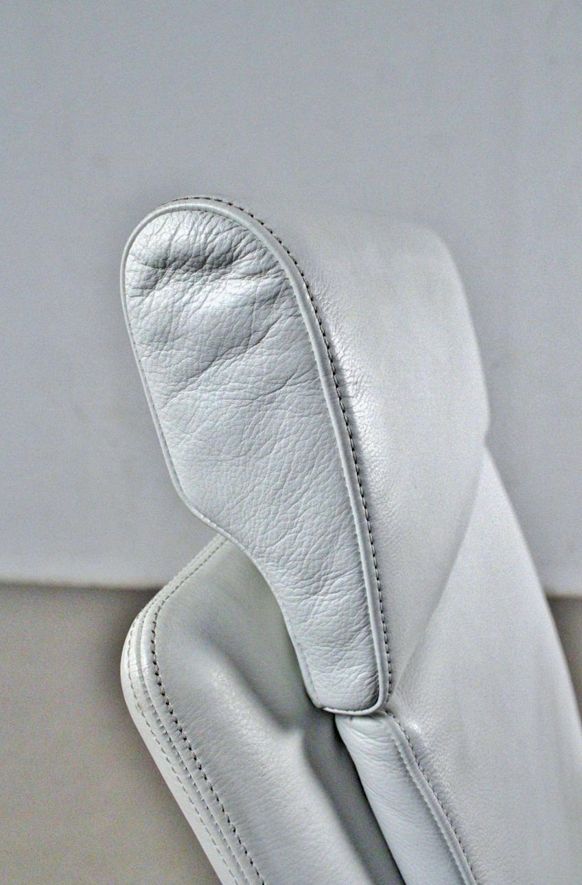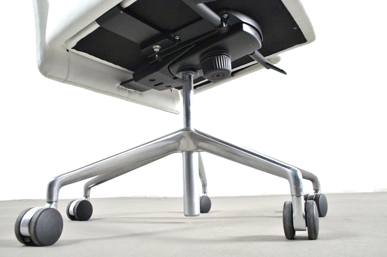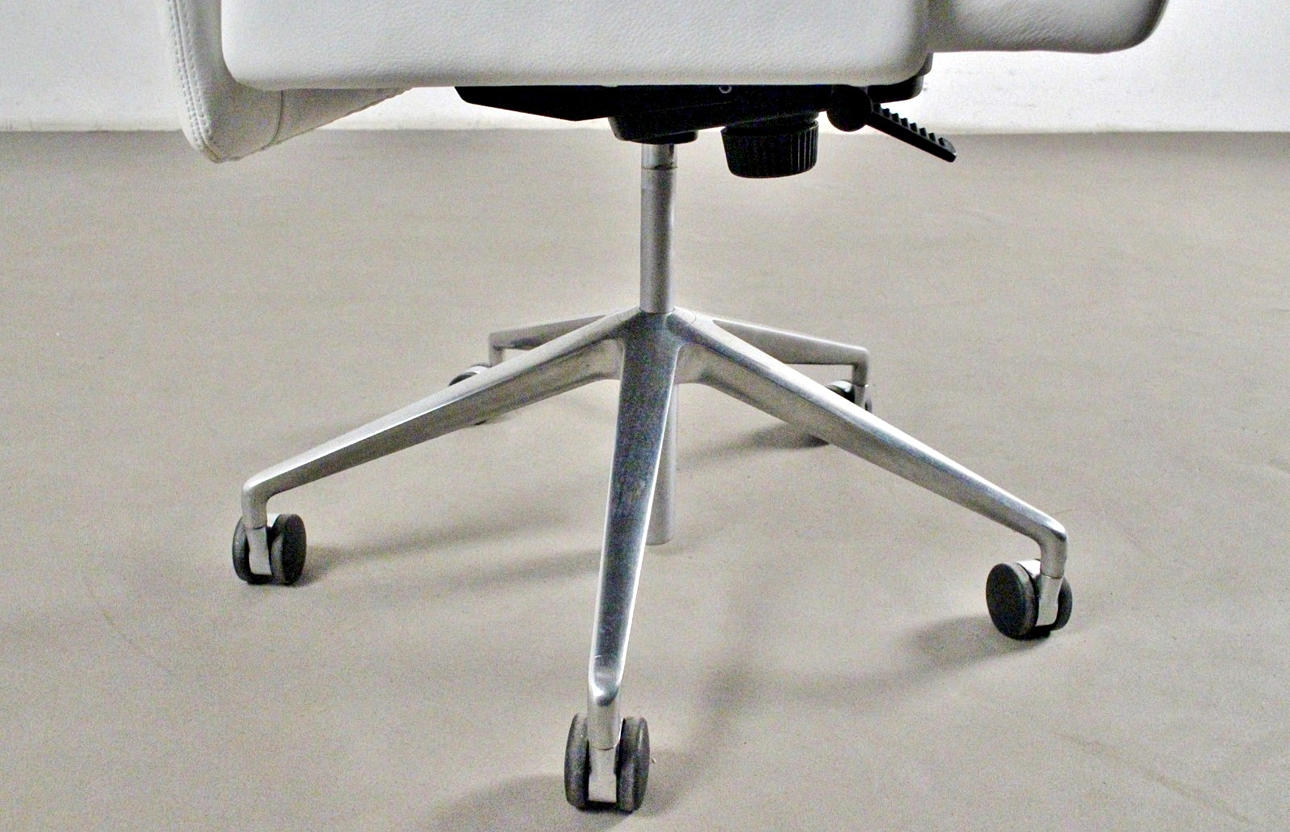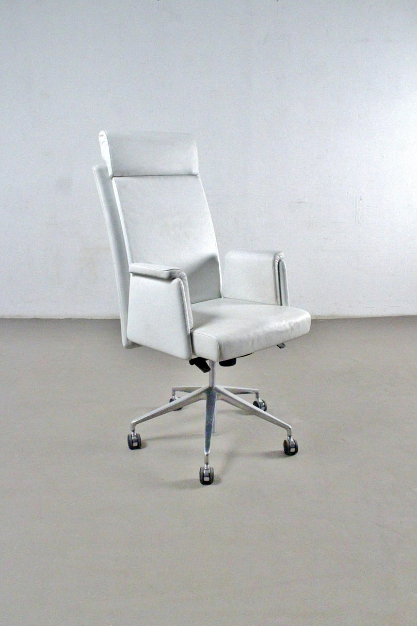 Kontorstol / kontorstol model "Jason executive". Østrigsk design af EOOS (Martin Bergmann, Gernot Bohmann og Harald Gründl) for Walter Knoll, Tyskland. Mærket med flag. Fuldt funktionel lænestol med låsbar vippemekanisme og højdejustering via gastryksdæmper, femstjernet fod på hjul. Betrukket på alle sider med hvidt læderbetræk. mål ca. H. 134 / 123 cm, B. 61 cm, D. 67 cm.