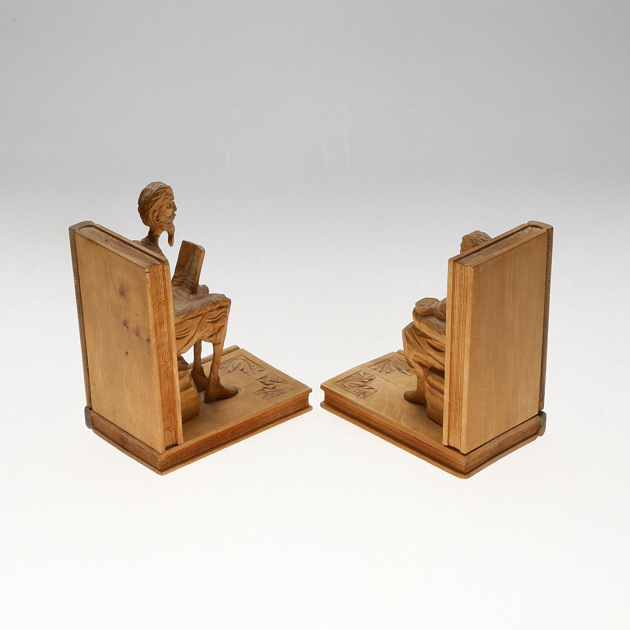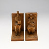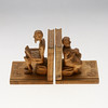 Træudskårne bogstøtter i form af figurer og bøger.
