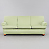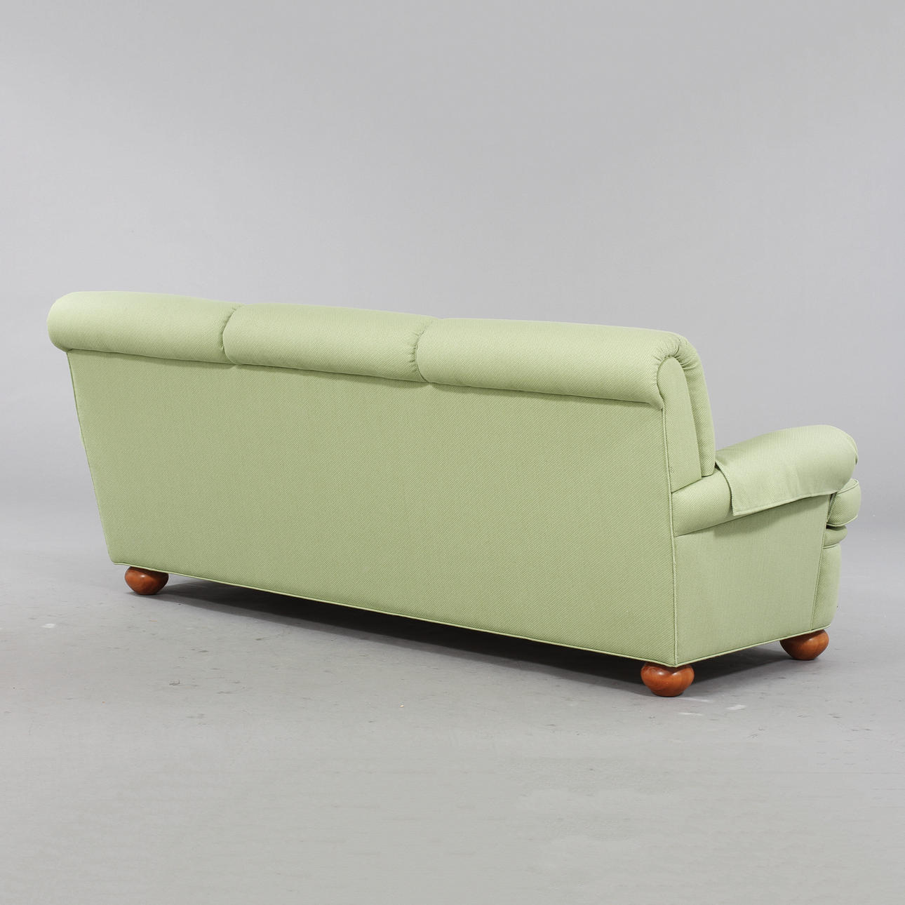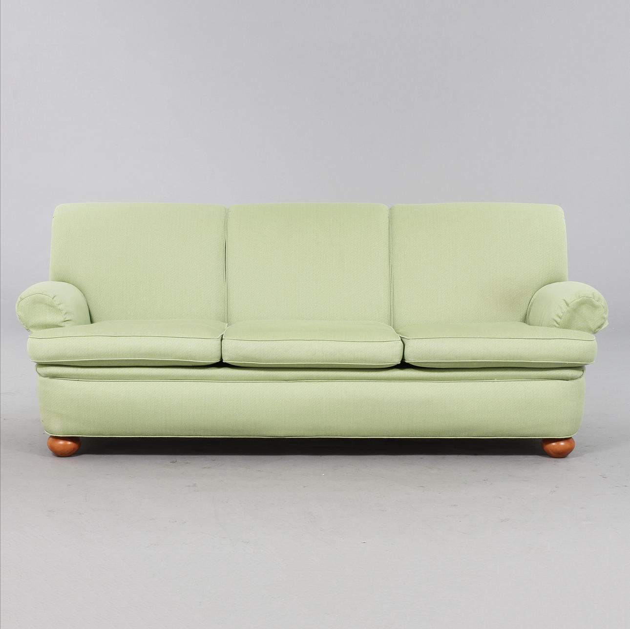 Tre-personers sofa betrukket med grønt stof. Længde 195 cm.