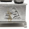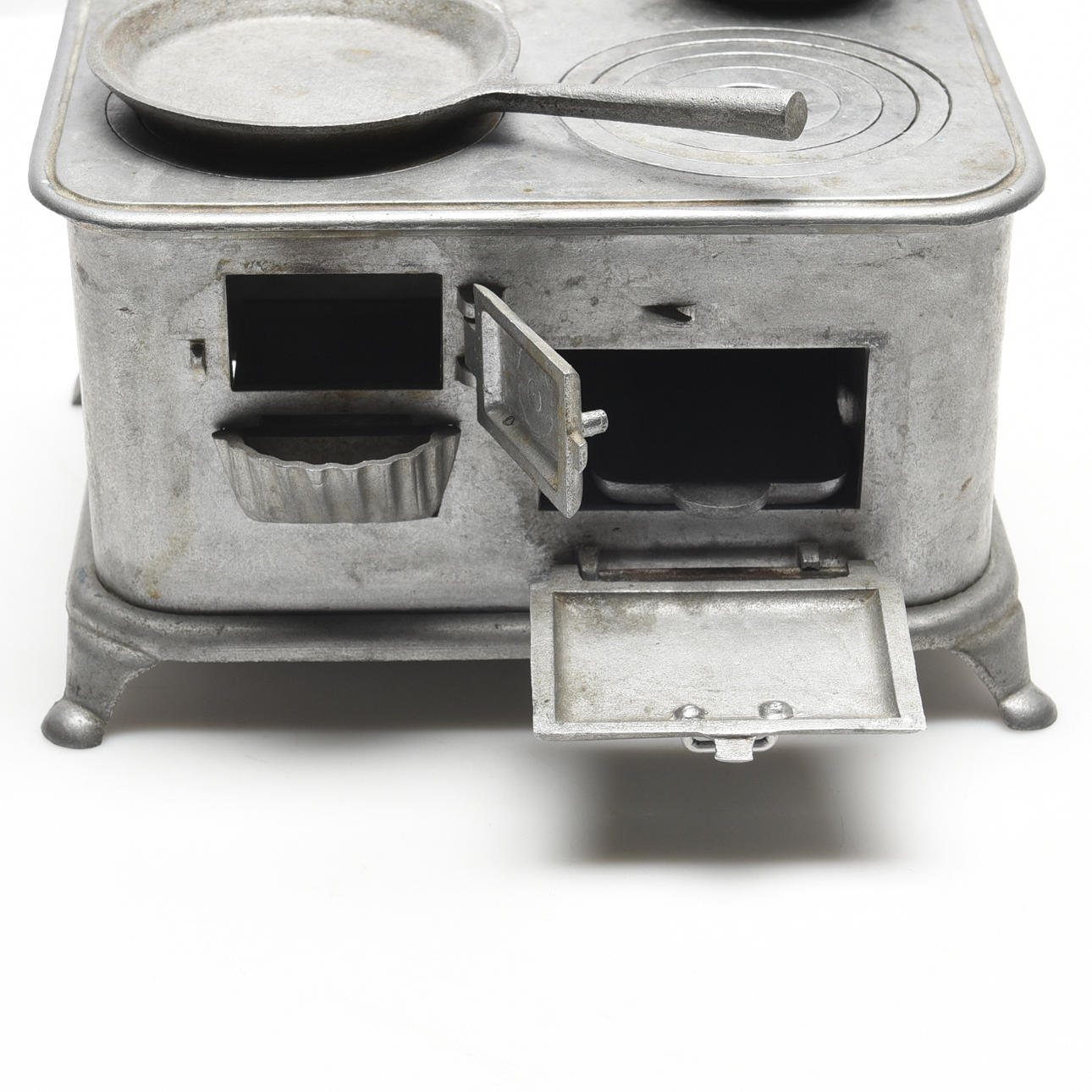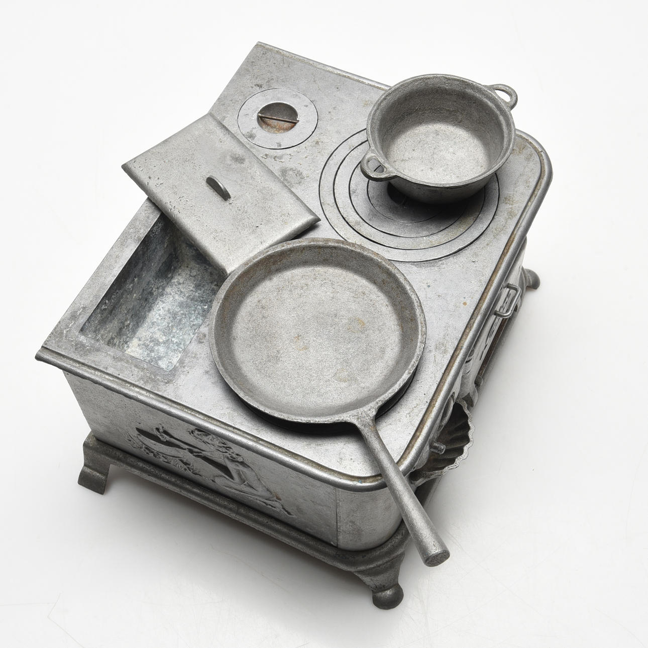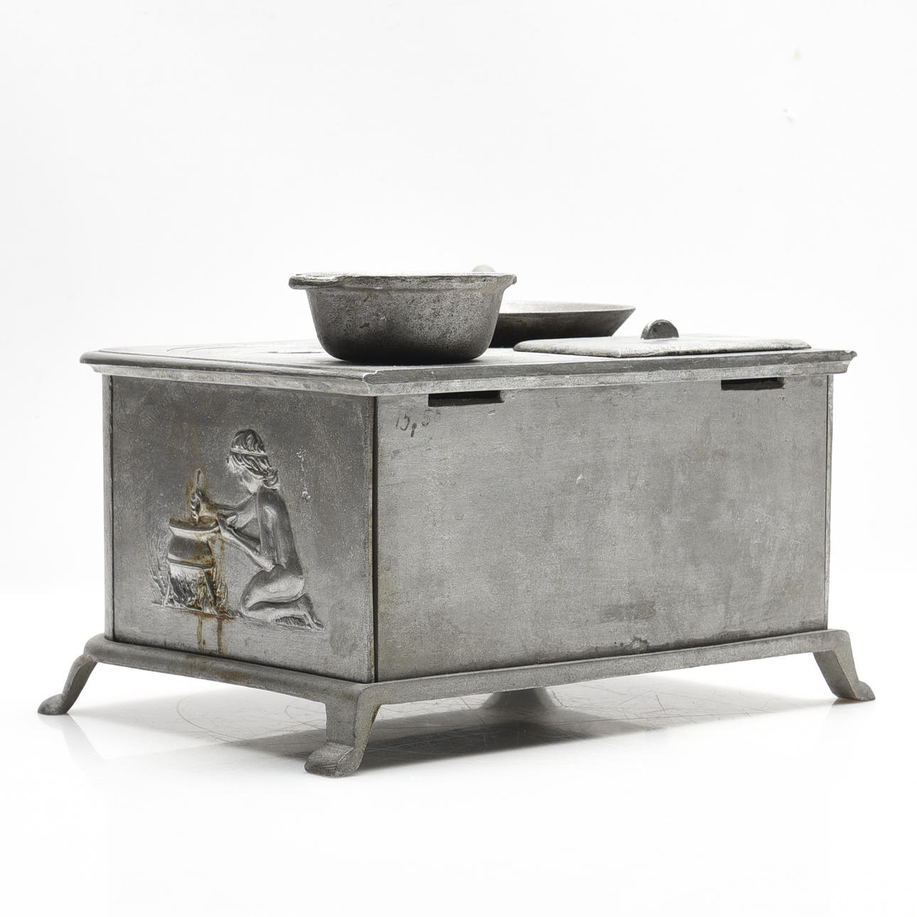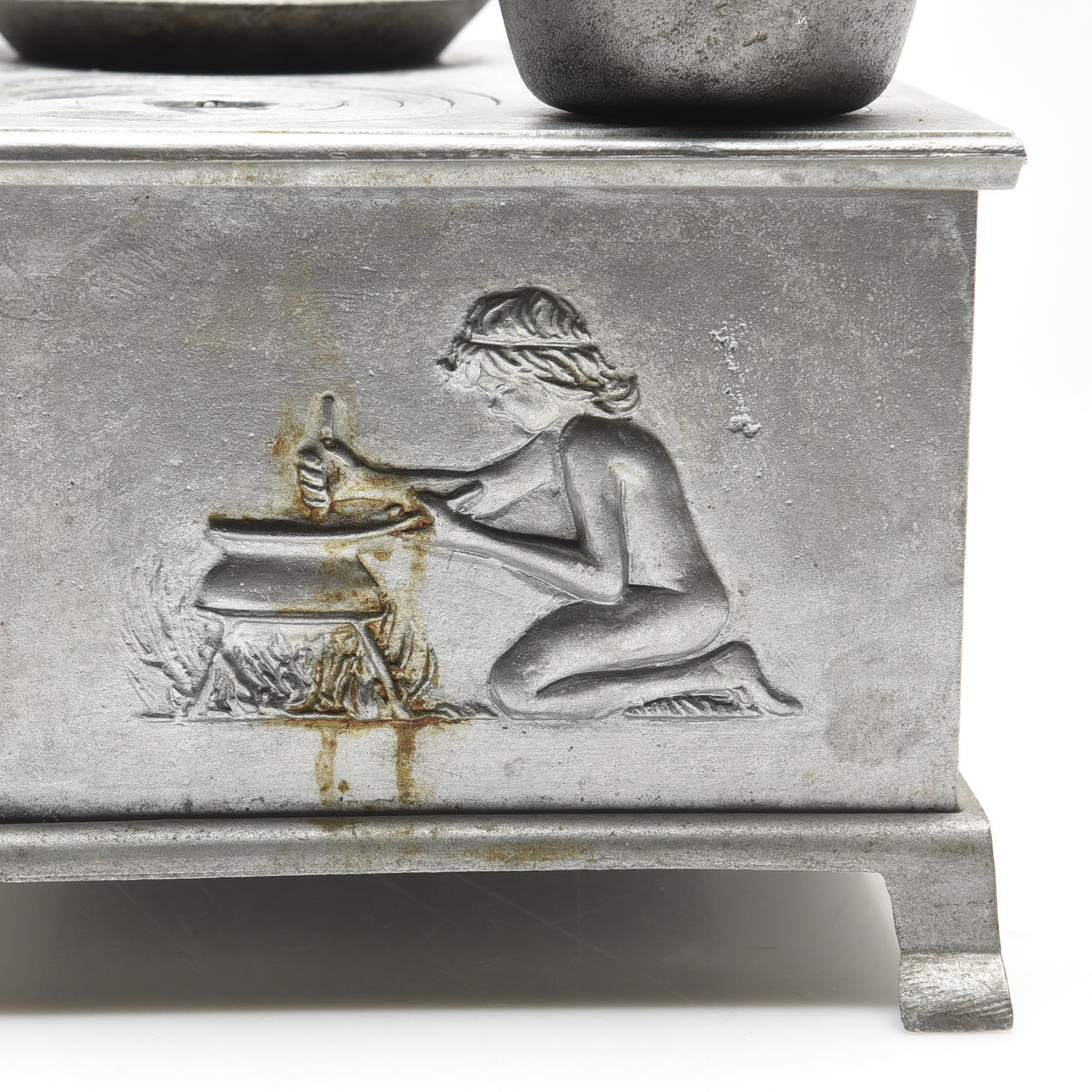 Første del af 1900-tallet, støbt i zink, afslutning med reliefmotiver, bradepande, gryde, bageplade og indsats til lampeolie medfølger, højde ca 14, 27x20 cm.