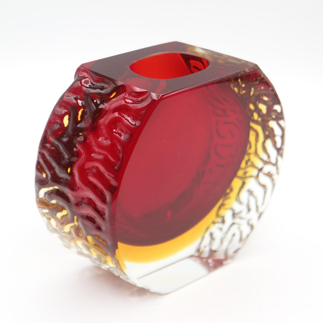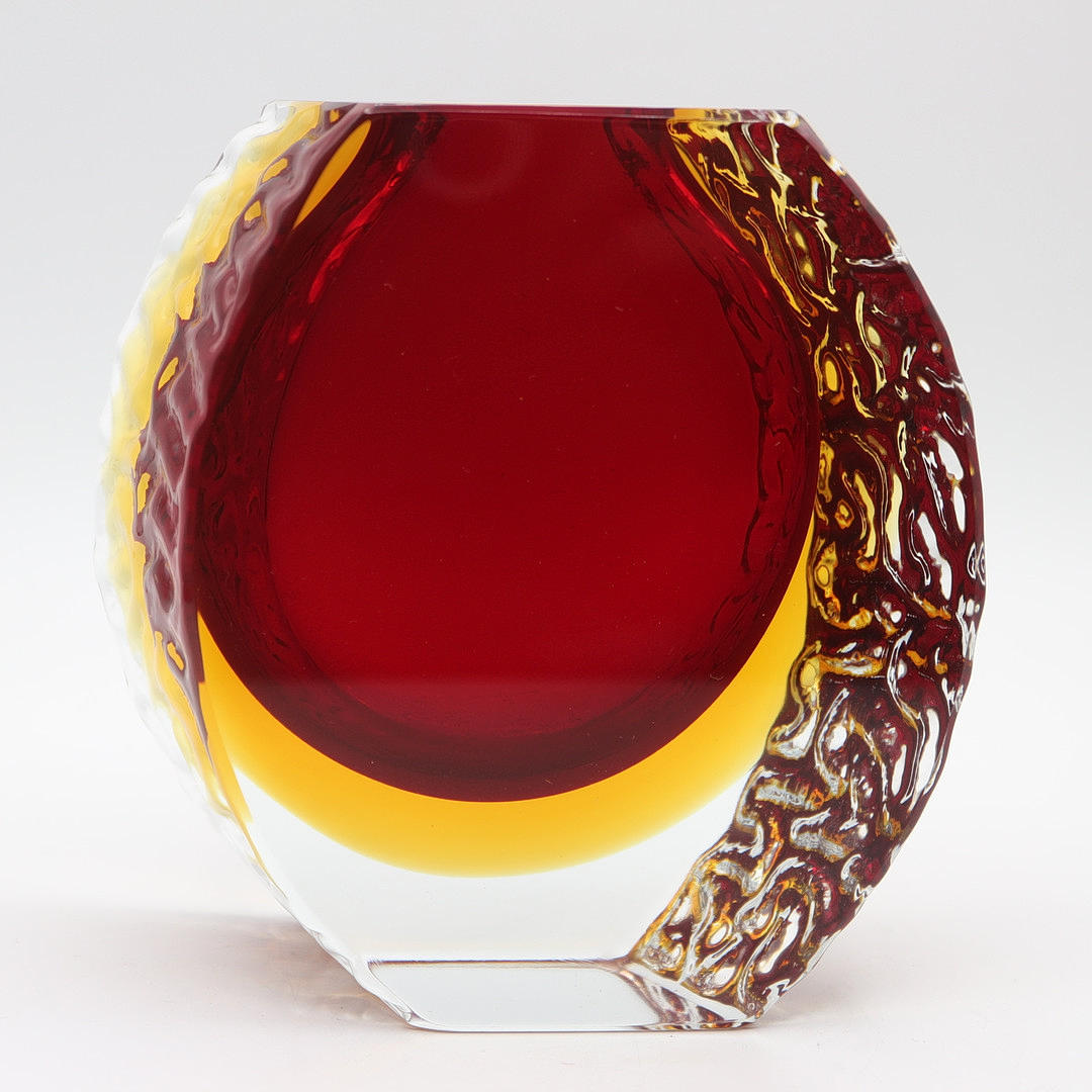 Mandruzzato Murano glasvase, meget sjældent design, tofarvet rødgul, fremstillet i Italien, mål: 13,5 x 13 cm.