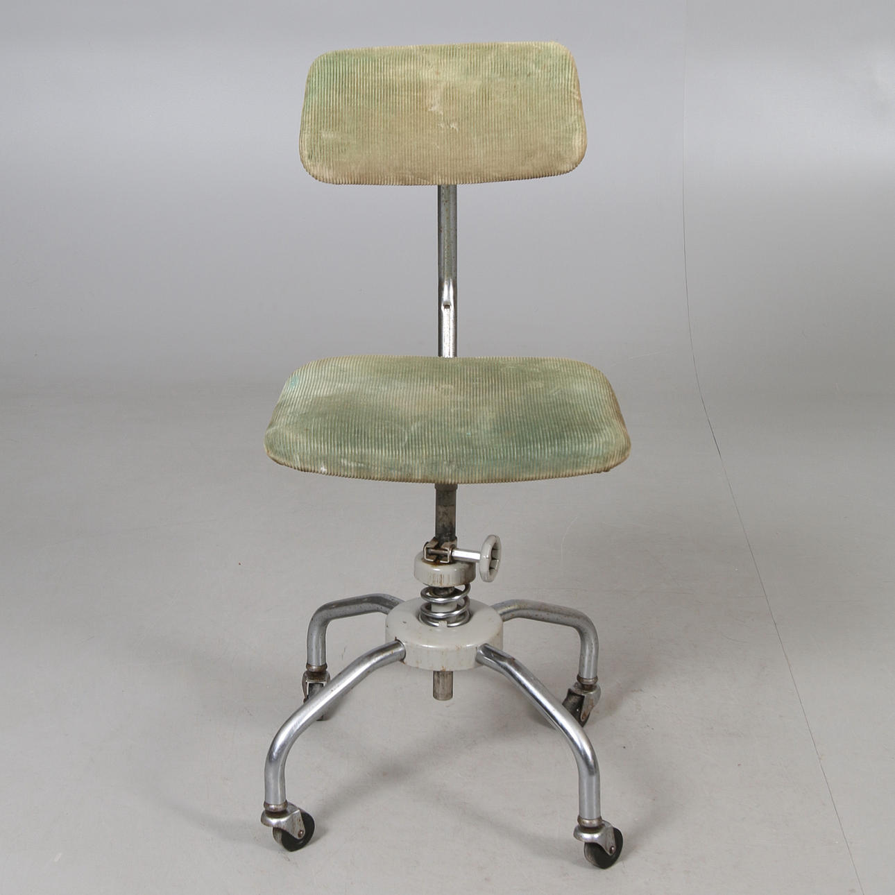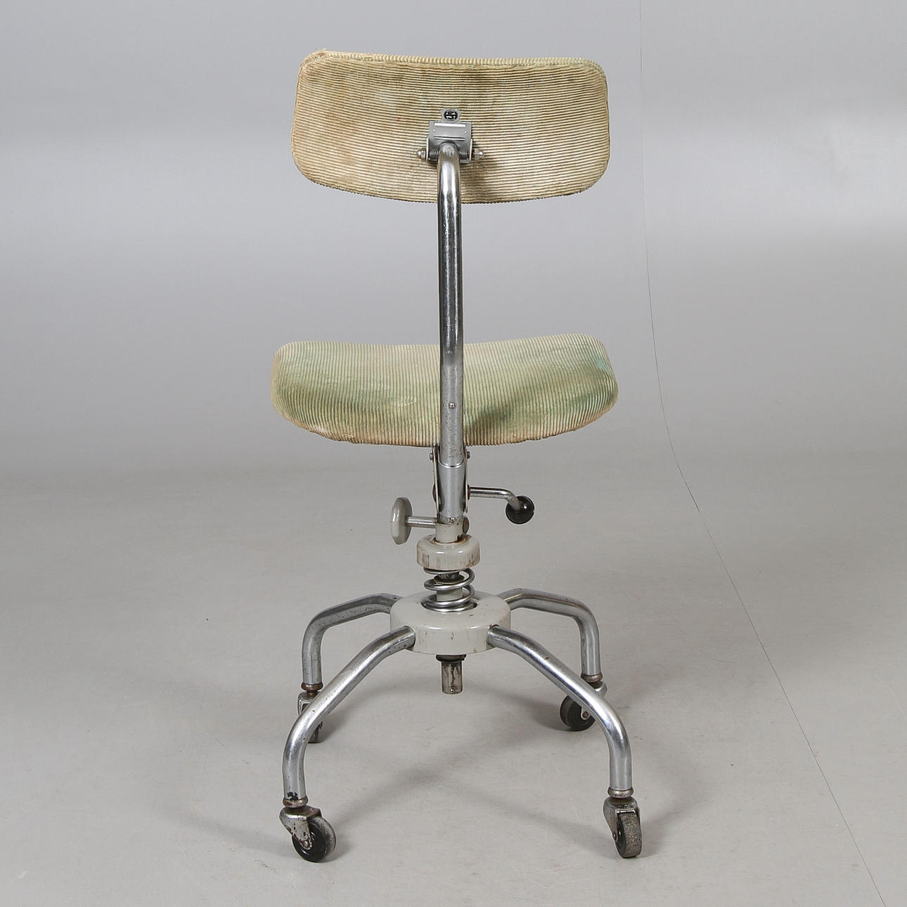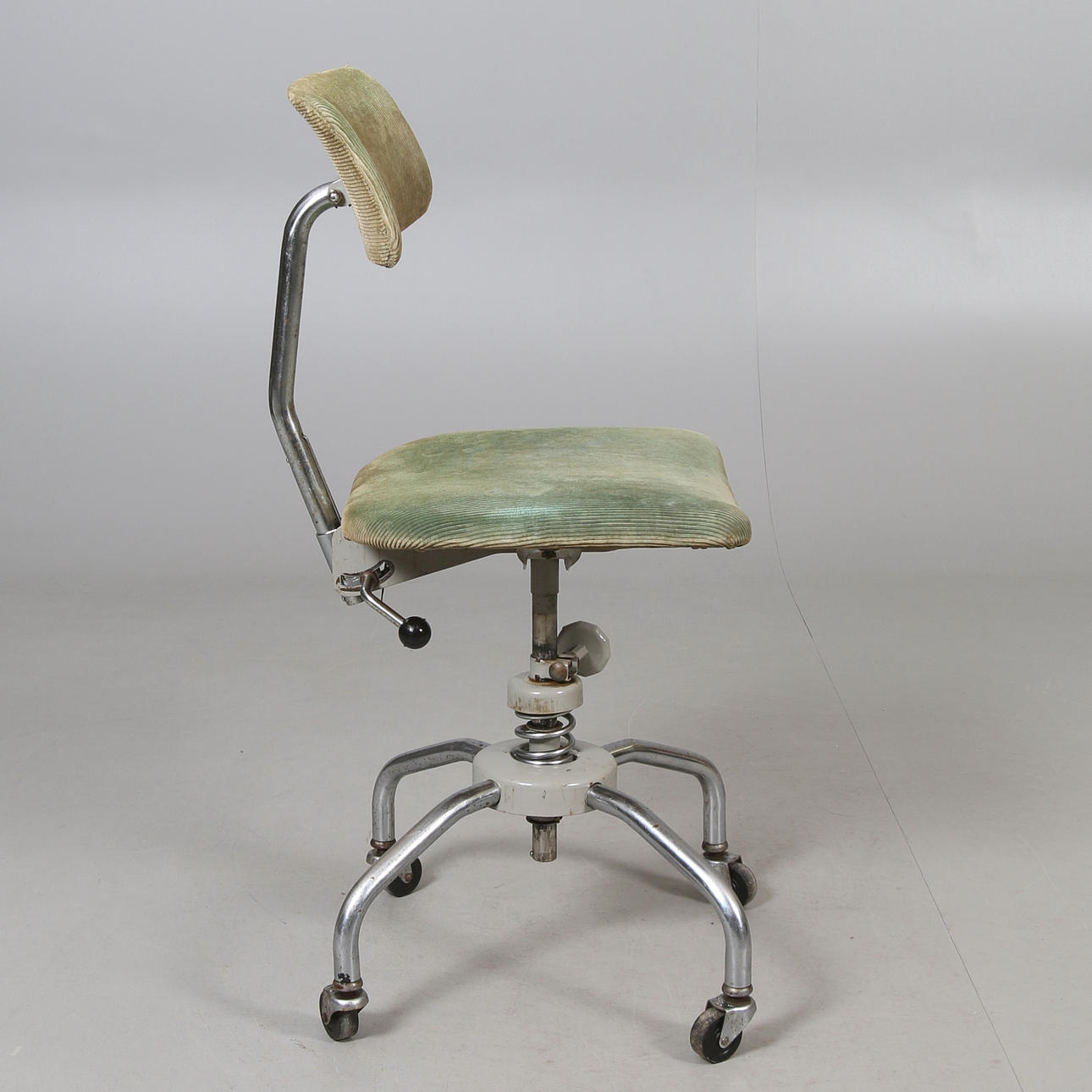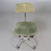 Metalramme. Polstret sæde og ryg. Justerbar. Markeret. Længde ca. 41, bredde 45, sædehøjde 54, ryghøjde 92 cm.