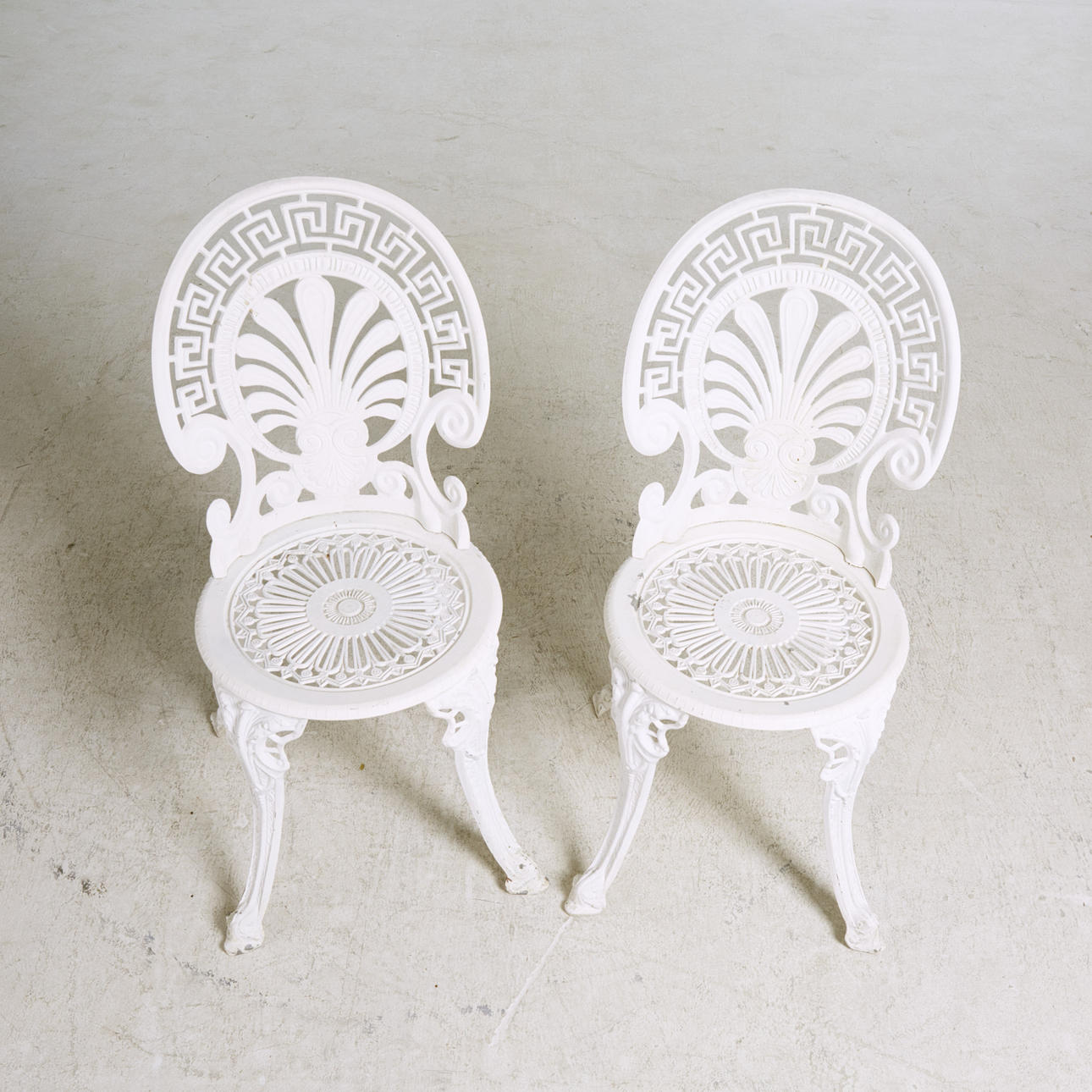 1744305. HAVESTOLE, 2 stk, i hvidmalet metal.