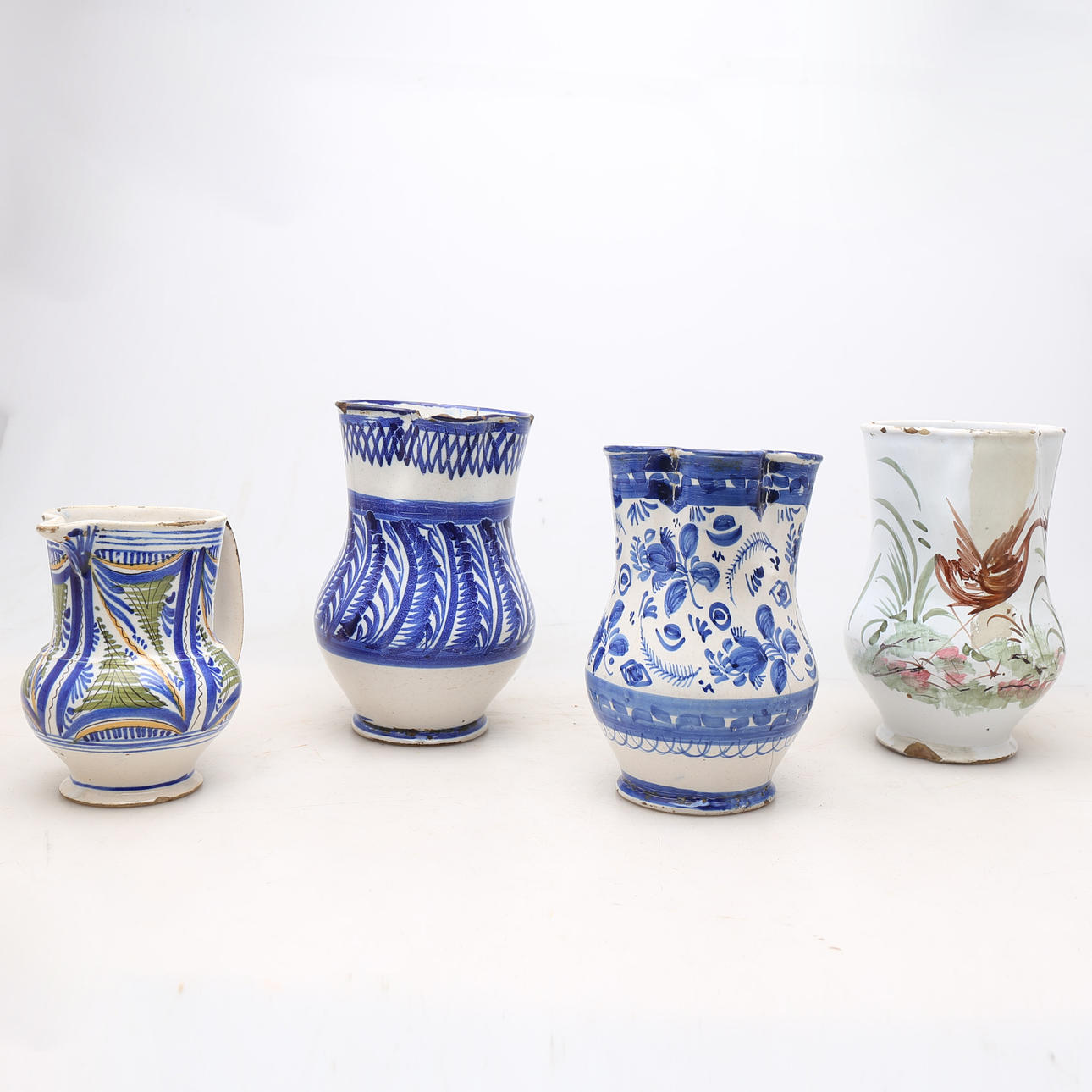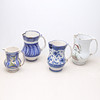 Den største (hvid med tricolor dekoration) med restaureringer. En med håndtaget limet på. Hår, skår og revner.