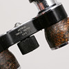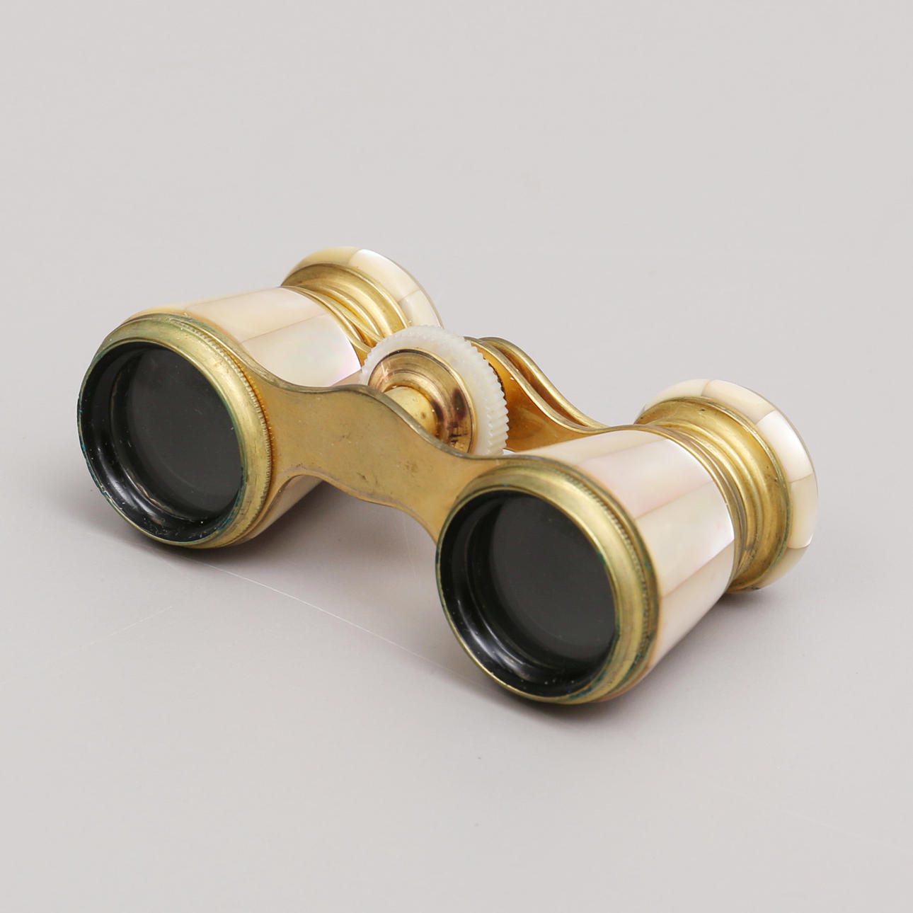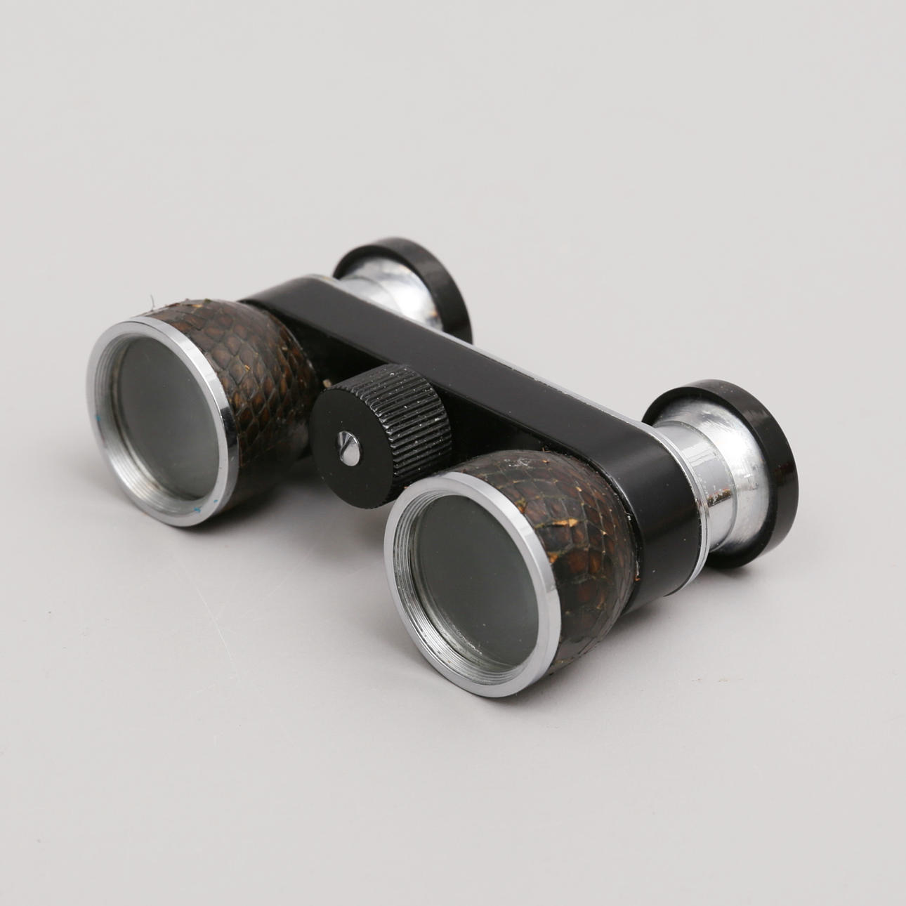 Perlemor-kikkert, bredde 9,5 cm, højde 5 cm. I rød sag. Sort kikkert Astron bredde 9 cm, højde 5 cm.