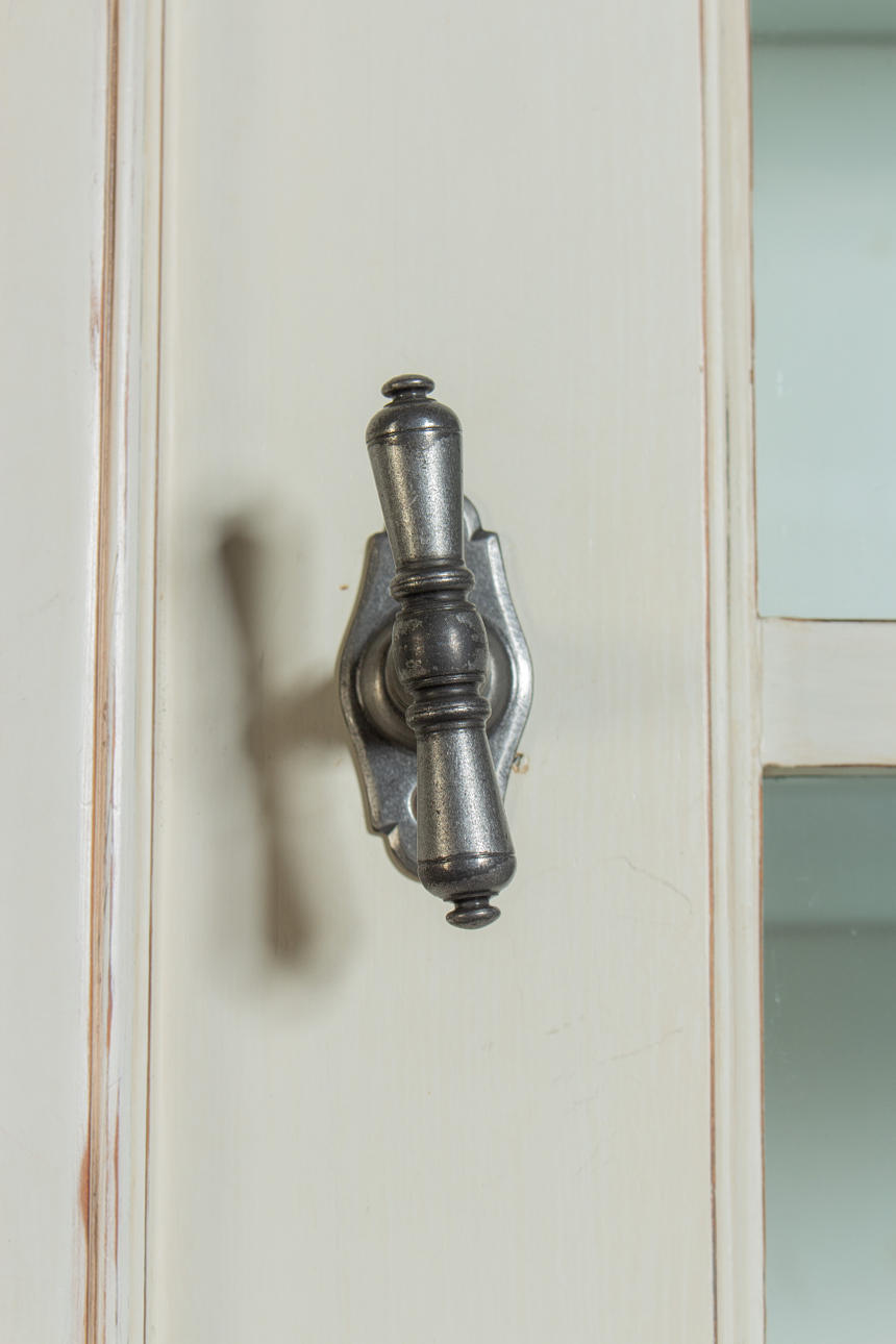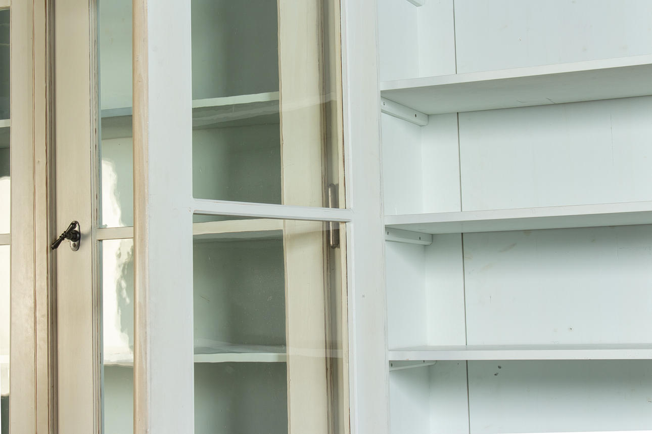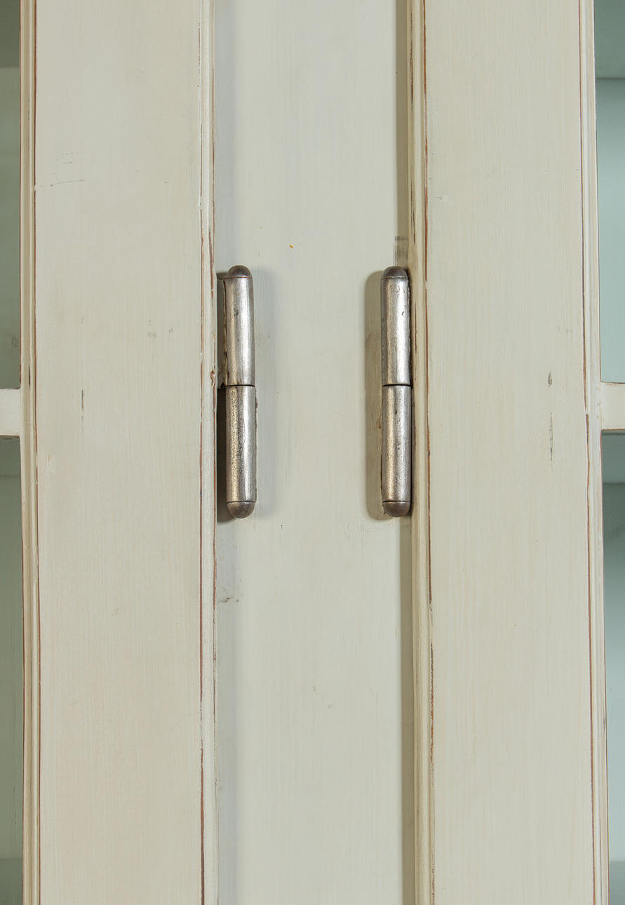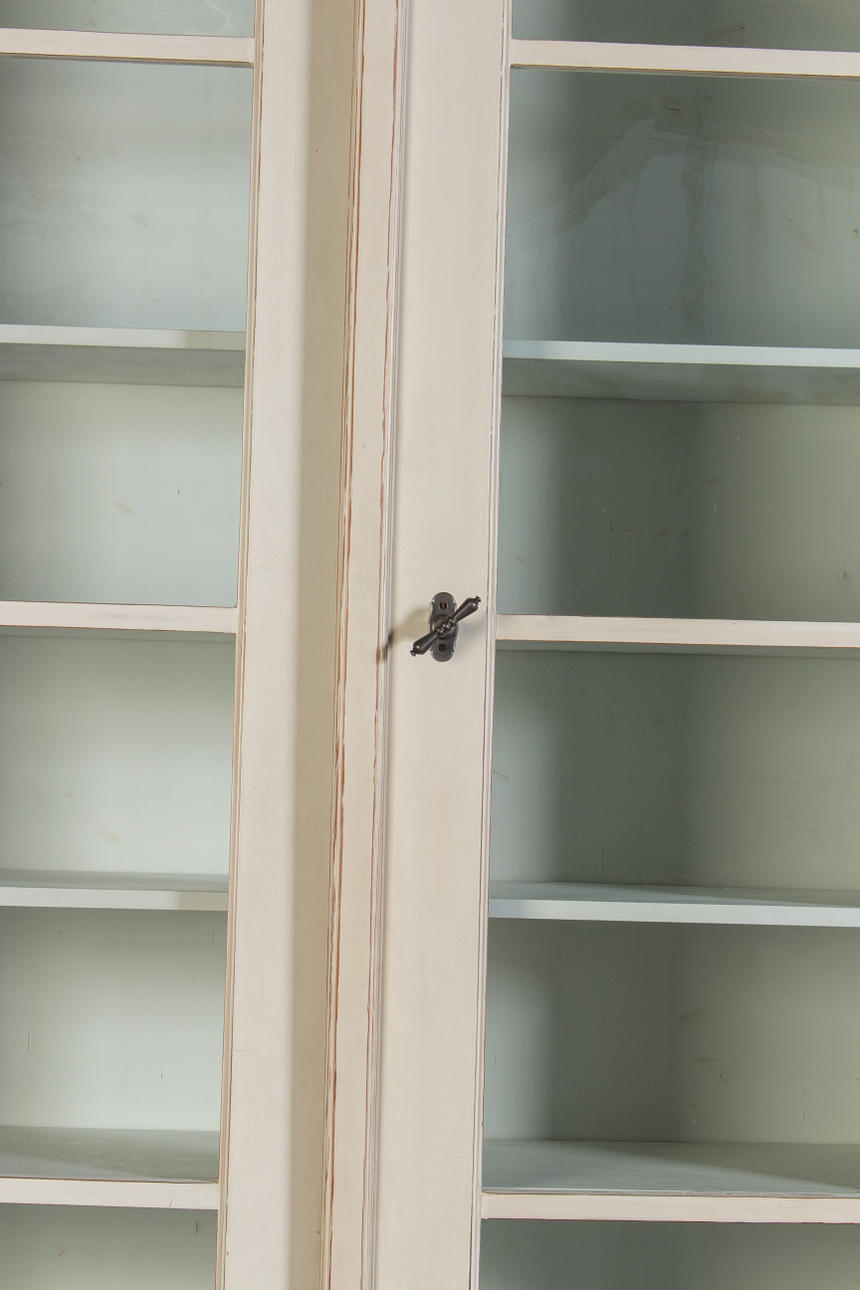 Antik hvid og eukalyptus farvet. Lige krop på en fremspringende rammebund. Struktureret af dobbeltdøre med trukket fladt glas og vandrette stivere. buket gavl. Indeni er der syv hylder. Lodrette U-bolte. HxBxD: 301 x 332 x 50 cm.