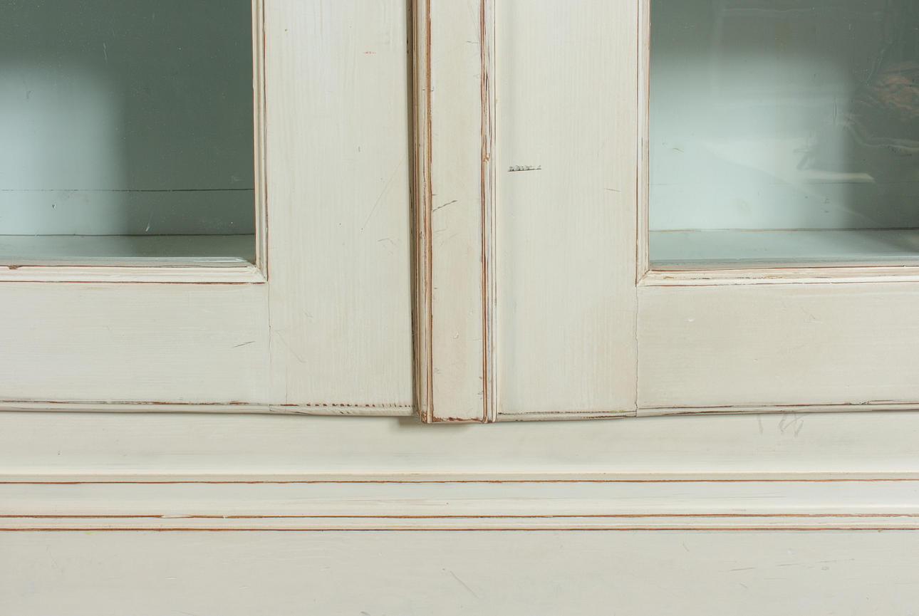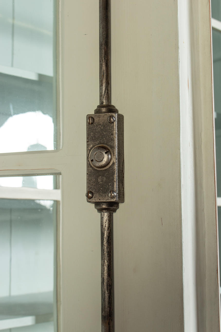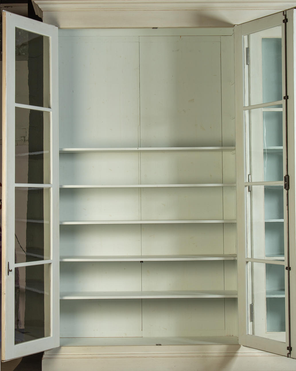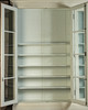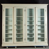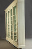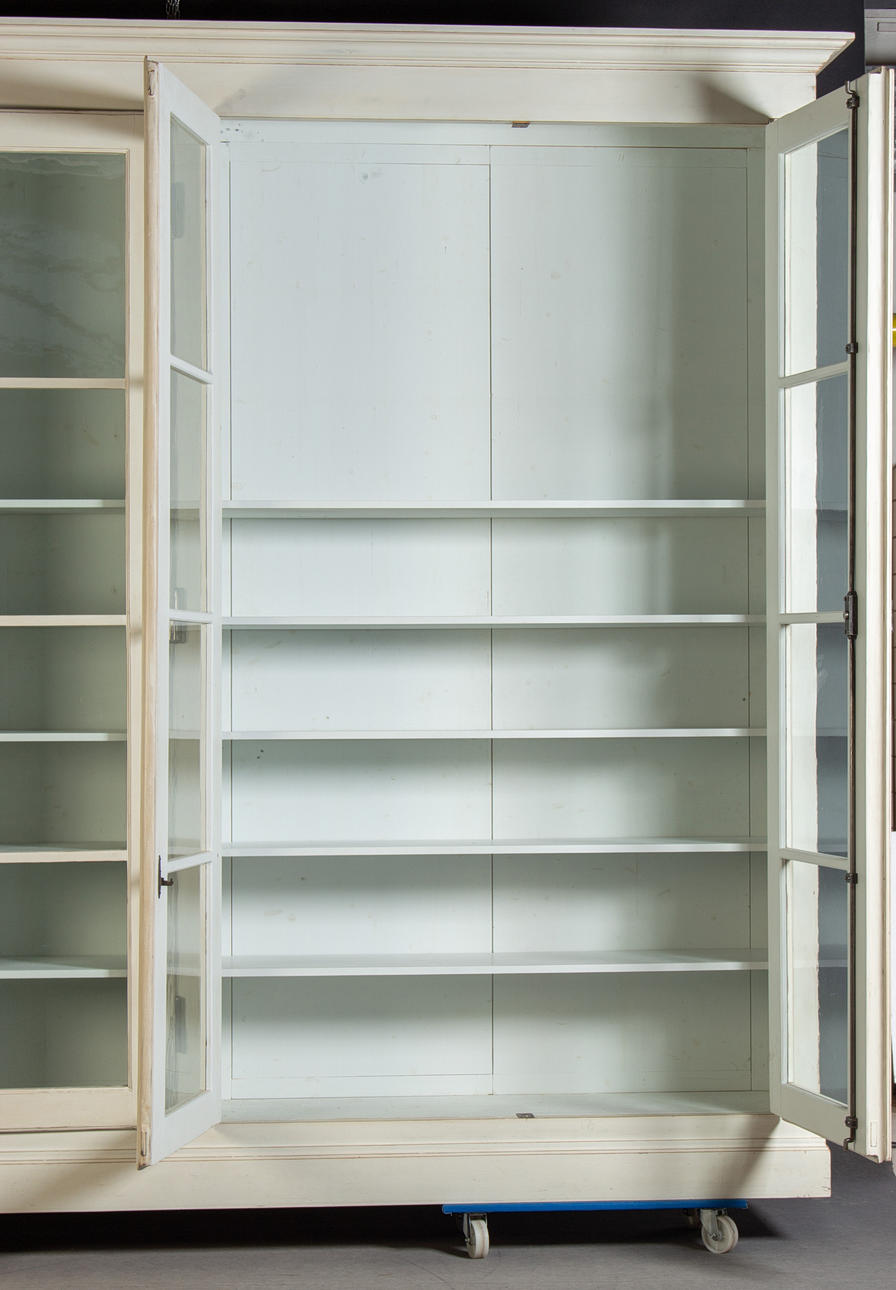 Antik hvid og eukalyptus farvet. Lige krop på en fremspringende rammebund. Struktureret af dobbeltdøre med trukket fladt glas og vandrette stivere. buket gavl. Indeni er der syv hylder. Lodrette U-bolte. HxBxD: 301 x 332 x 50 cm.