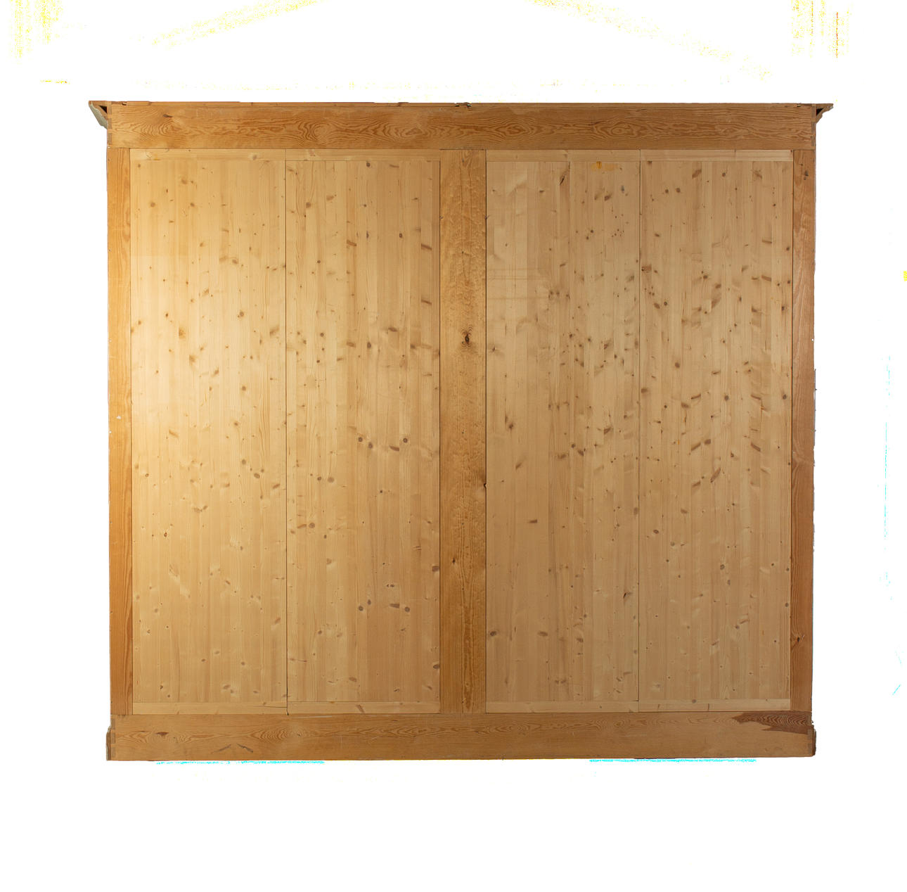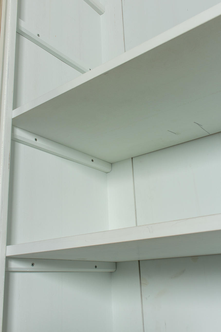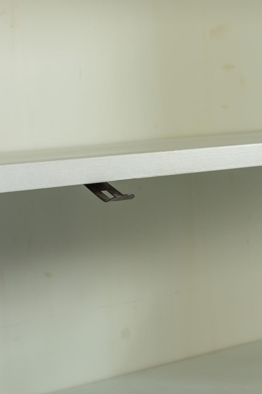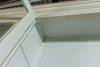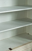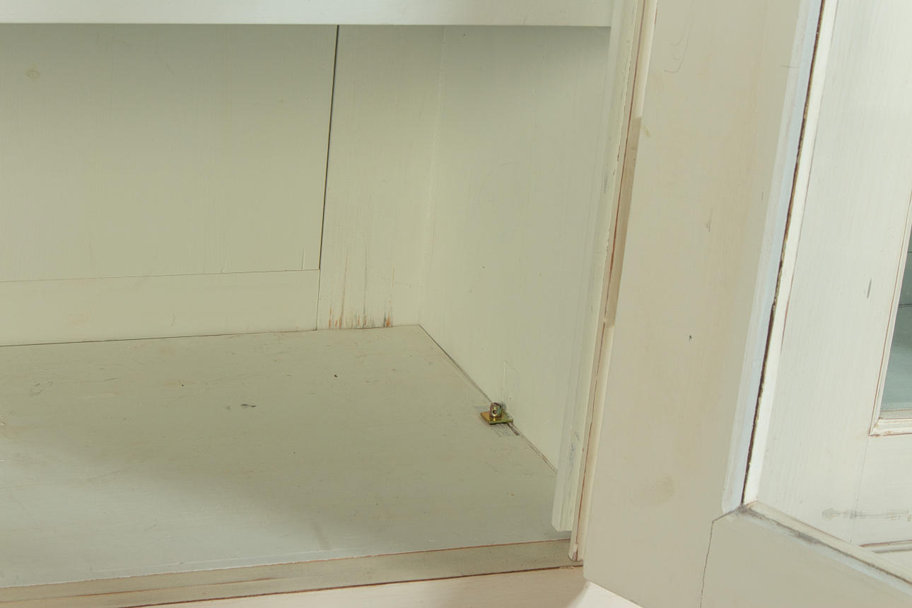 Antik hvid og eukalyptus farvet. Lige krop på en fremspringende rammebund. Struktureret af dobbeltdøre med trukket fladt glas og vandrette stivere. buket gavl. Indeni er der syv hylder. Lodrette U-bolte. HxBxD: 301 x 332 x 50 cm.