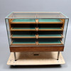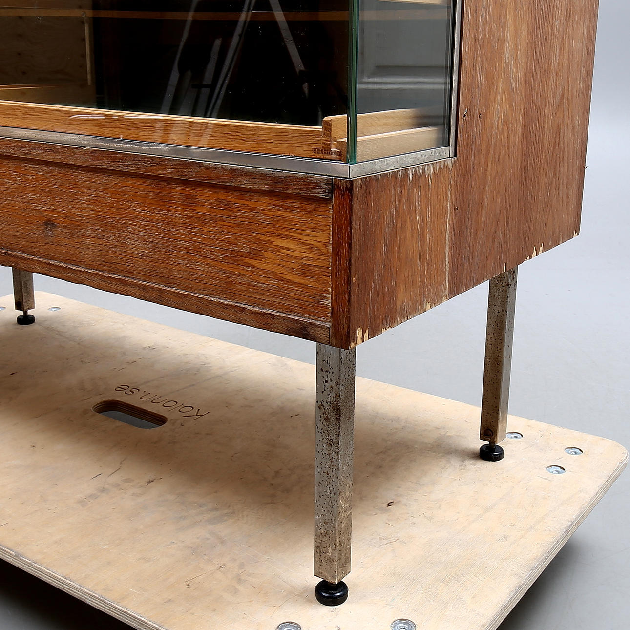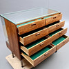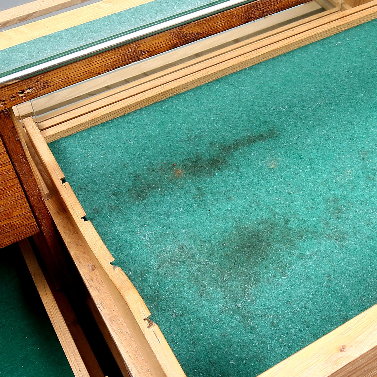 Slitage, pletter, ridser, Kantstødt, finerskader. To skuffer mangler glasfronter.