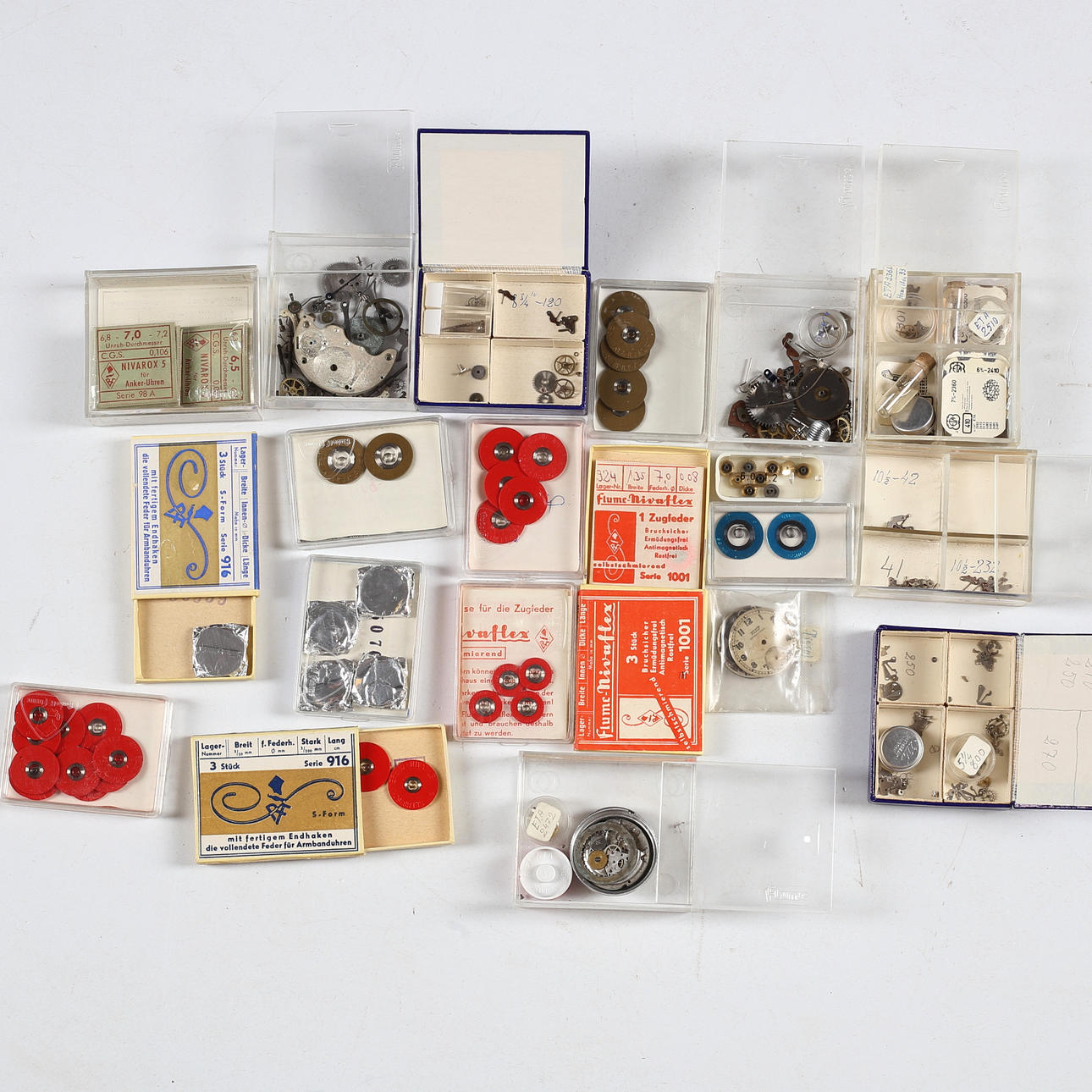 Flere små æsker med urdele til lommeure og armbåndsure.