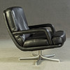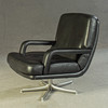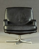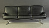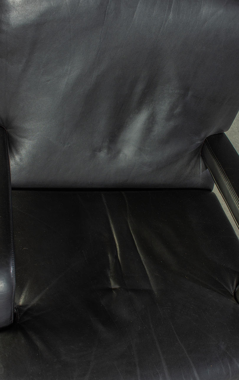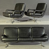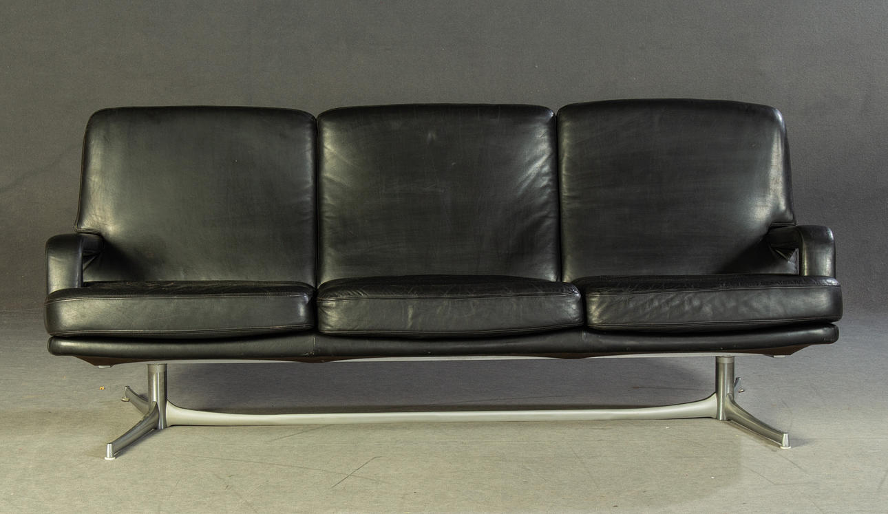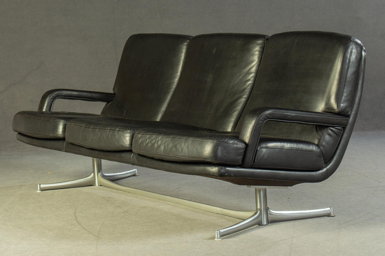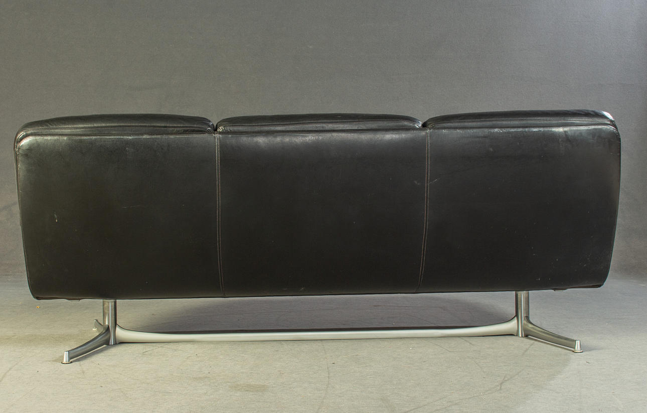 Model "Don" lav ryg. 3 personers lounge sofa og 2 lænestole, tysk design. Udkast omkring 1976. Betræk i sort læder, aluminiumsramme. kontorstol. En mærket med etiket. HxBxD: 82x74/200x78 cm.