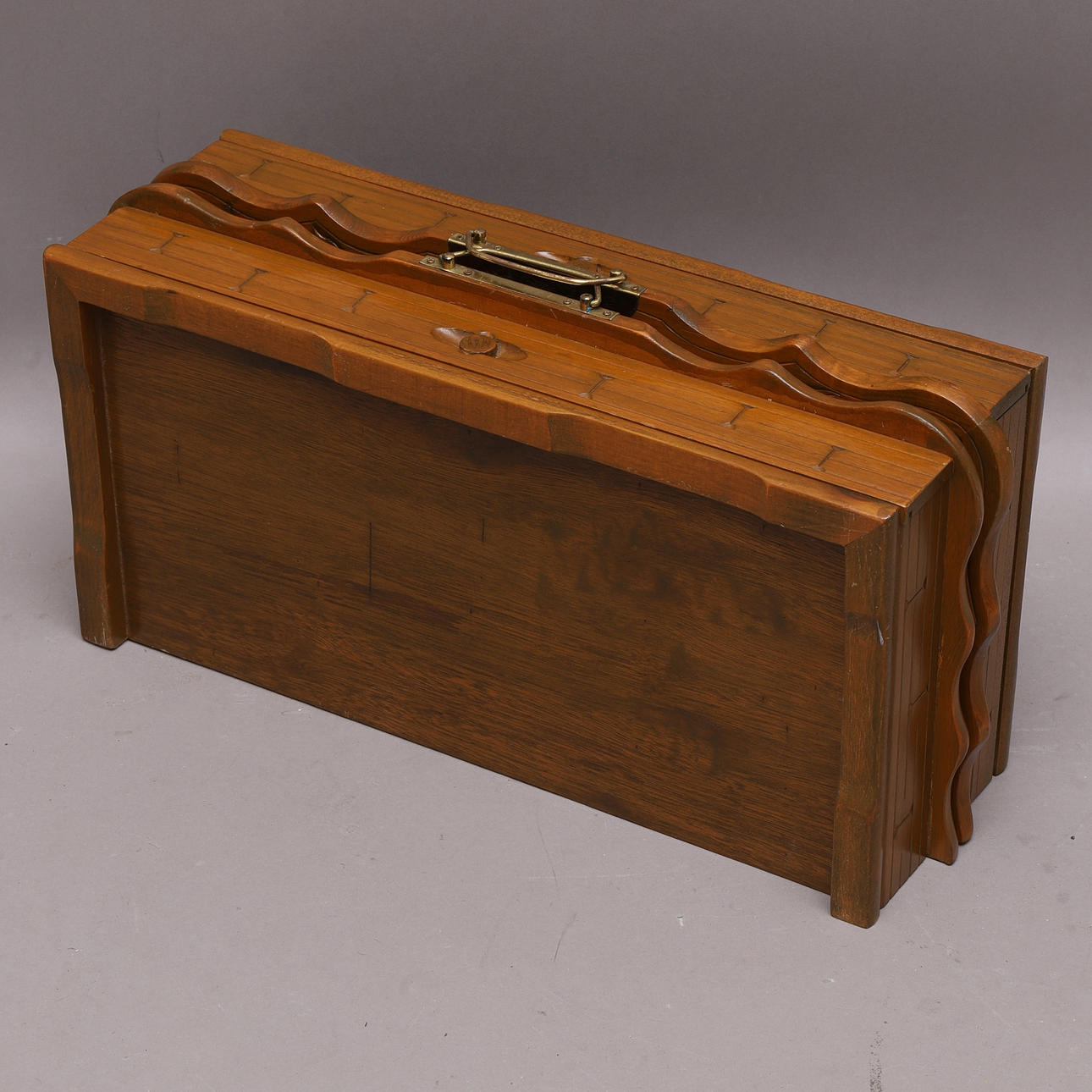 Udvidbart skakbræt med figurscener på firkanterne. Spillefladen er lavet af plastik, brikkerne er lavet af plastik, kabinettet er lavet af udskåret træ.
