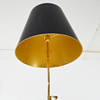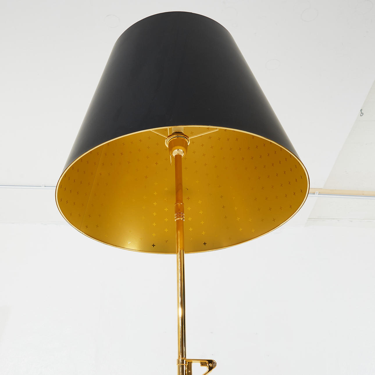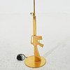 Stel i trykstøbt aluminium, polymersprayet og forgyldt med 18K guld, skærm i sort karton med silketrykt indvendig i guld, fod med teksten "Happiness is a hot gun", totalhøjde inkl. skærm ca 168 cm.