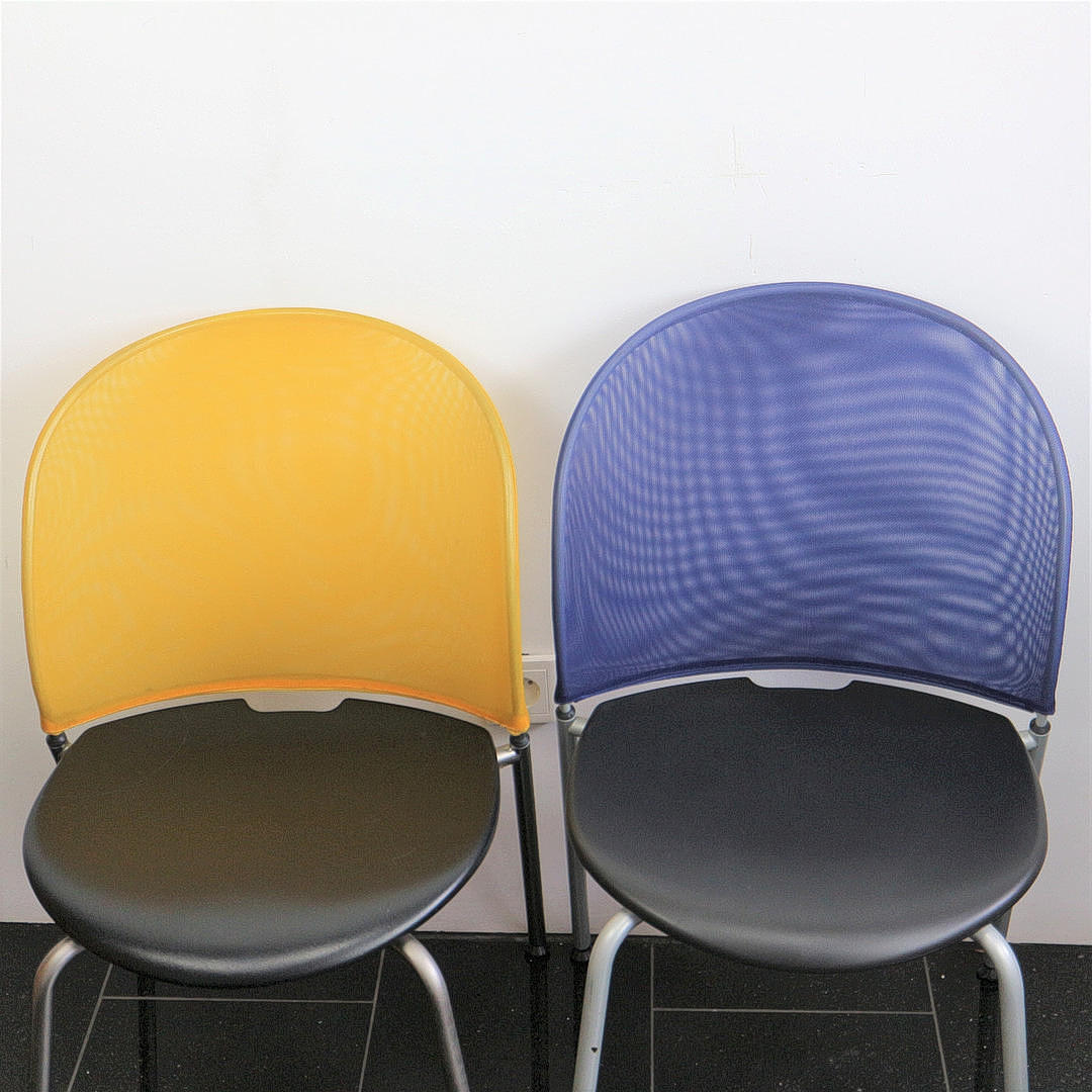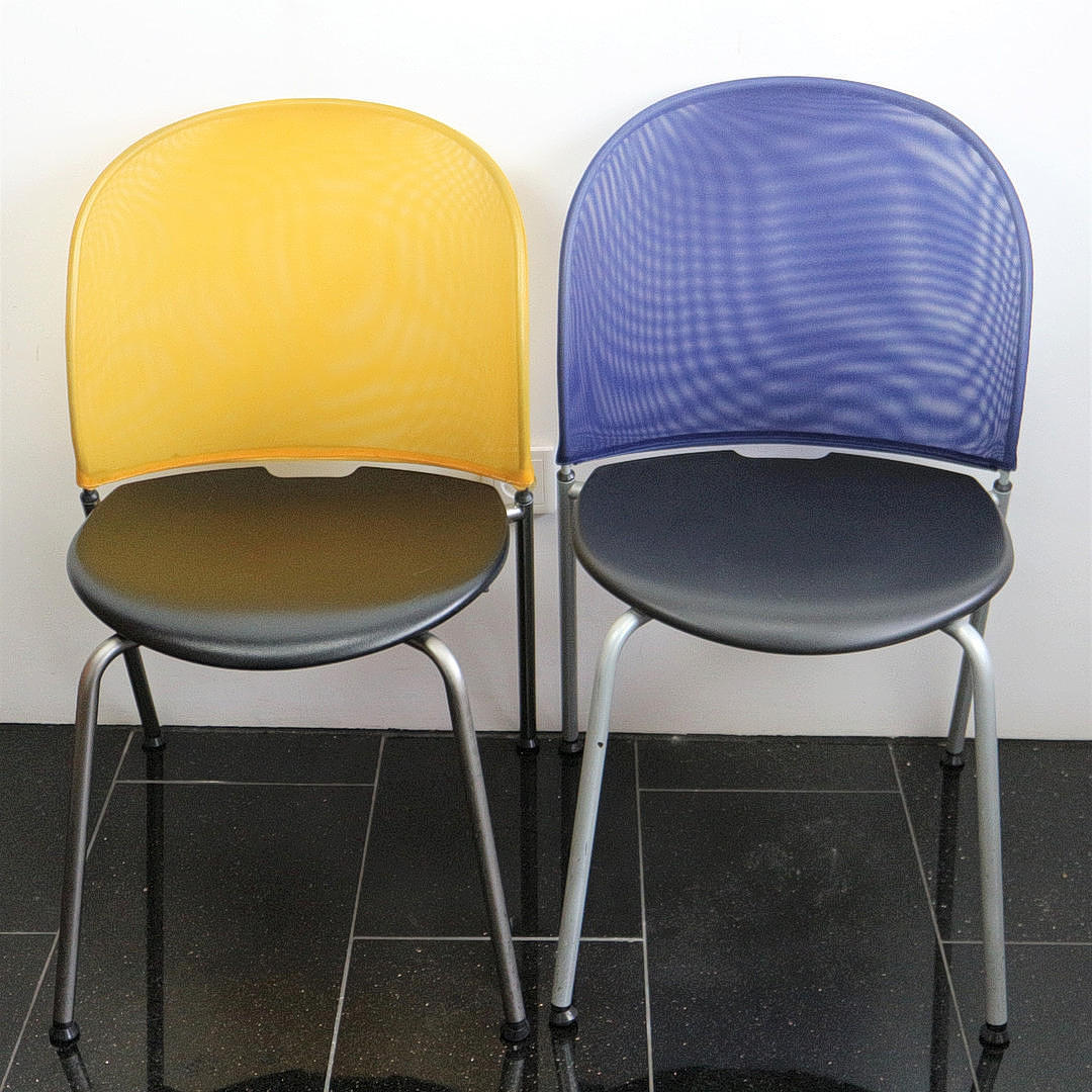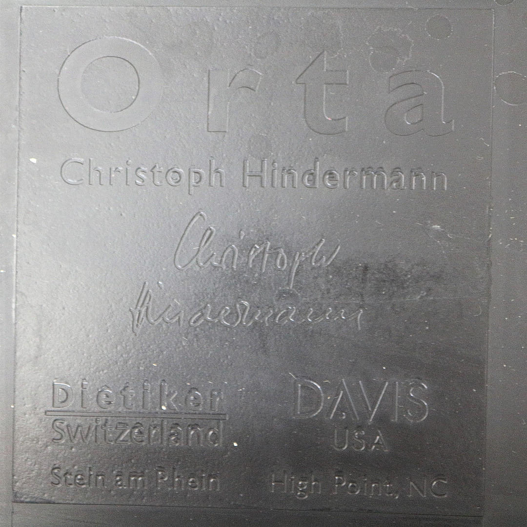 Dietiker Orta designerstole, Schweiz, sort polyamid sæde, ryg Trevira monofilament mesh, H 80 cm, D 56 cm, B 47 cm: 1. Orta blå Christoph Hindermann Edition 2. Orta gul Christoph Hindermann blev født i 1948 i Basel. Den uddannede tømrer arbejdede i forskellige tømrervirksomheder, inden han i 1970 studerede boligindretning på Designskolen i Basel. Efter sin aktivitet som indretningsarkitekt (bl.a. hos Ralph Hiestand Wohndesign i Horgen) grundlagde han sammen med Adalbert Lamprecht et planlægningskontor for boligindretning og design med registrerede kontorer i Basel og Bad Säckingen, Tyskland i 1982. Efter seks år gik partnerne fra hinanden, og i 1988 grundlagde Christoph Hindermann Hindermann Office Basel. Den succesfulde indretningsarkitekt og designer, som havde en stol på Designskolen i Basel i ni år, designede adskillige prisvindende møbler: blandt andet stolene Sparta, Orta, Tila og Satu for Dietiker. I 2007 blev sidstnævnte tildelt guldprisen fra Iidex Neocon, Canada.
