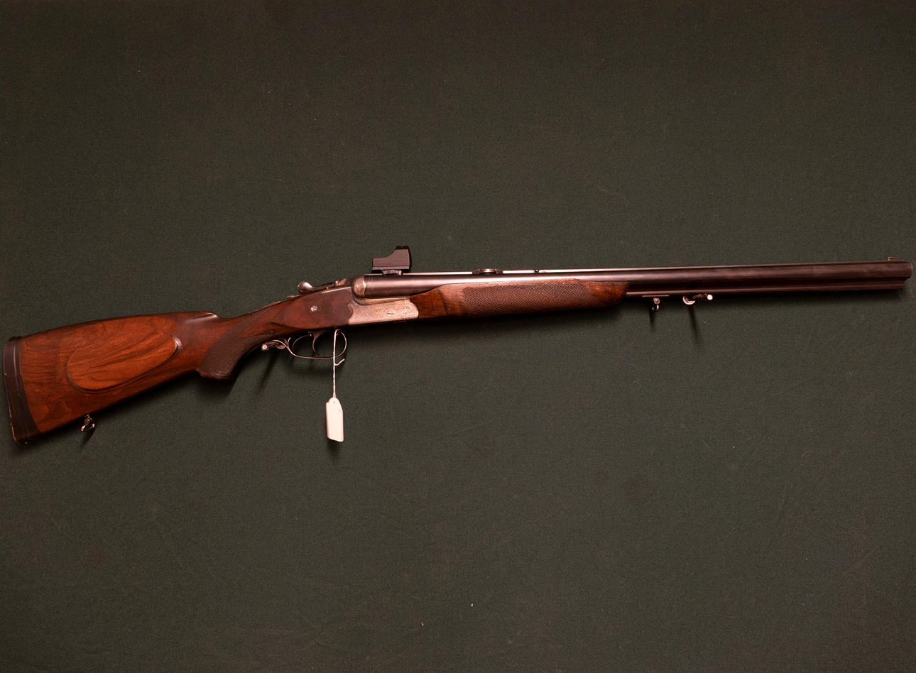 Boring tysk Hammerless. Lavet af Merkel. Mod. Standard. Kaliber 12/7x57R. Ref nr. 965060. Tønde længde 63 cm. Forlænget gangbro med krydsbolt. øverste lever. side ører. Signalstift. Kuglekontakt og sikring på stempelhals. Dobbelte skodder med hurtige print på fronten. Venstre stempel med pistolgreb, svineryg og kindstøtte. Gummi bagbeklædning. Stor lager original medfølger. Docter rødpunktsigte monteret i krogsamling.