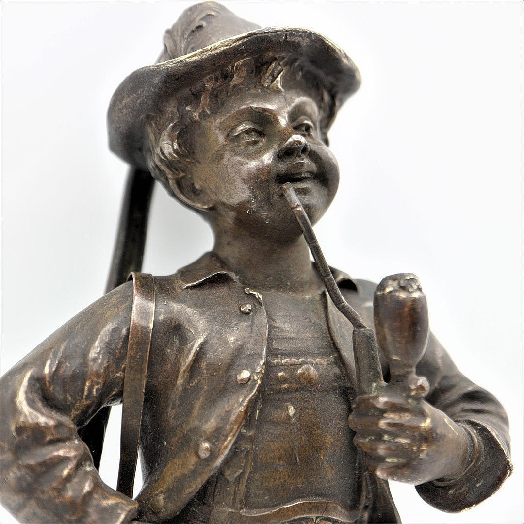 Bronzefigur af en jæger med et rør og en kendelse uden base.