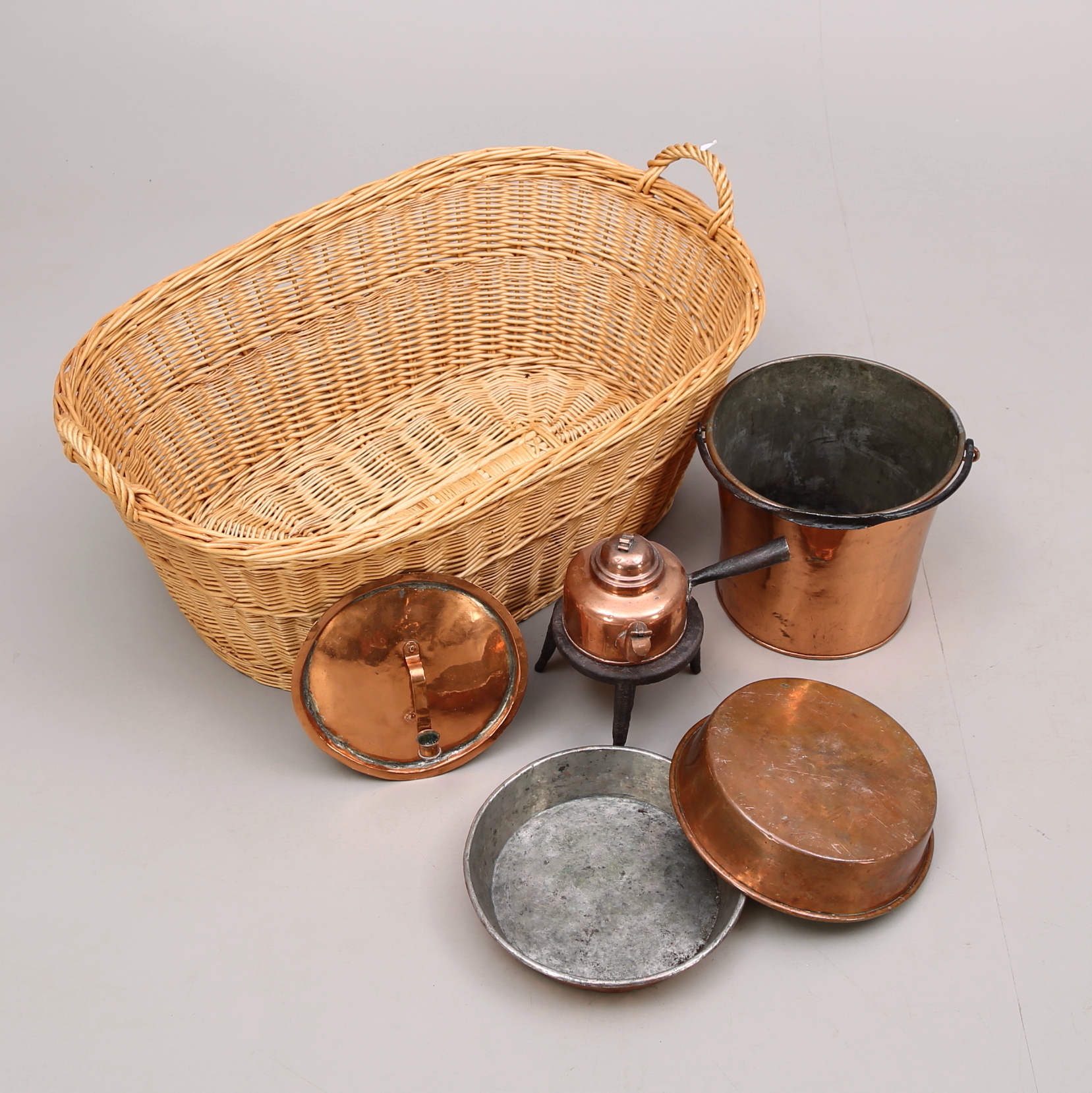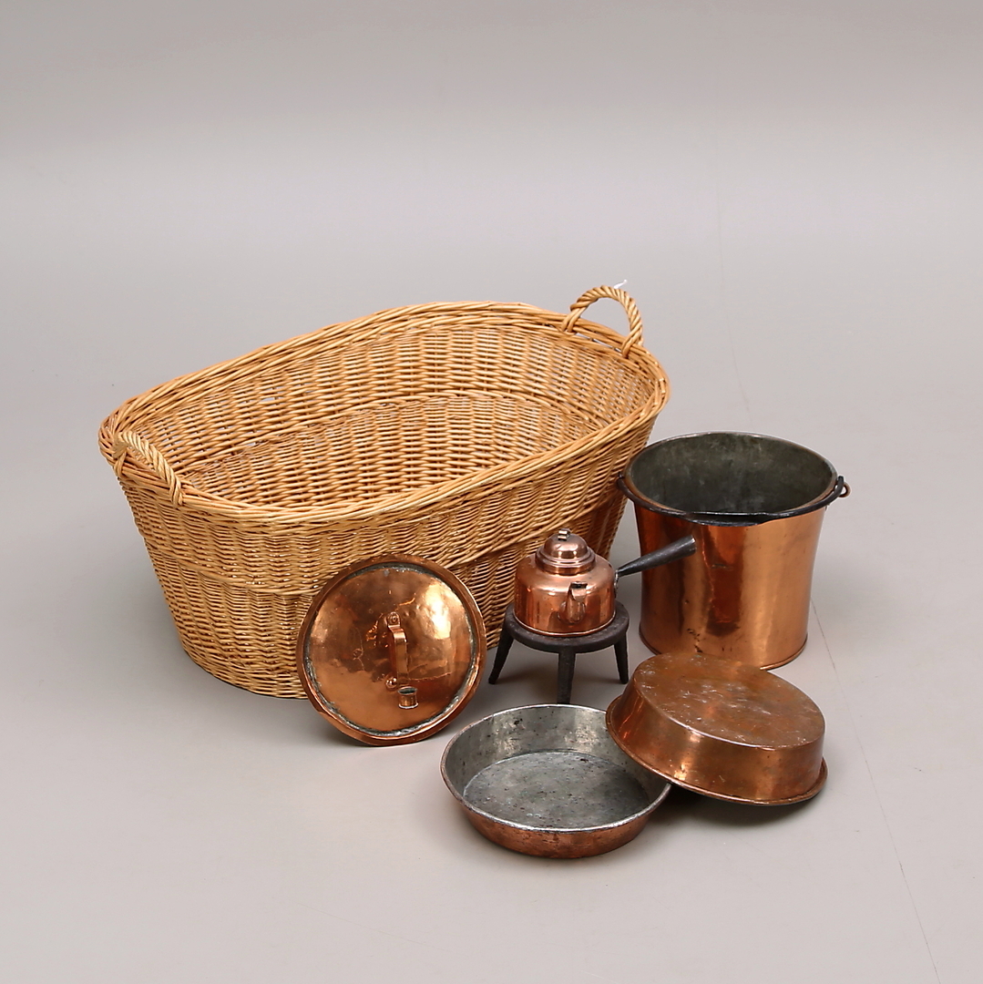 180384. KOBBERVARER, 5 stk, og VASK, rattan.