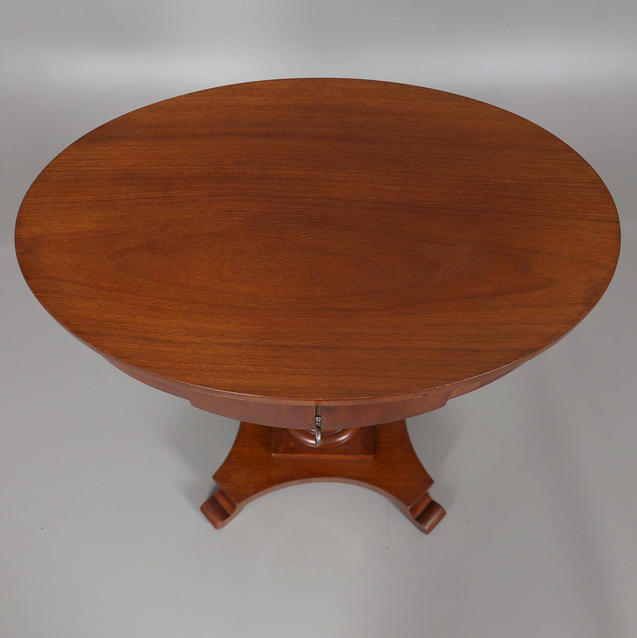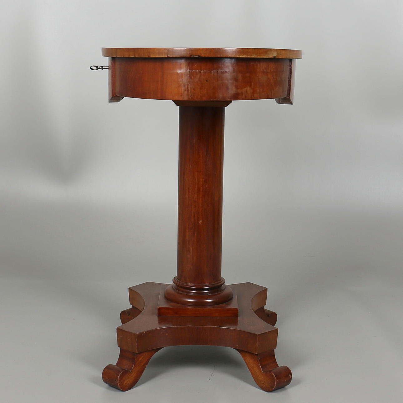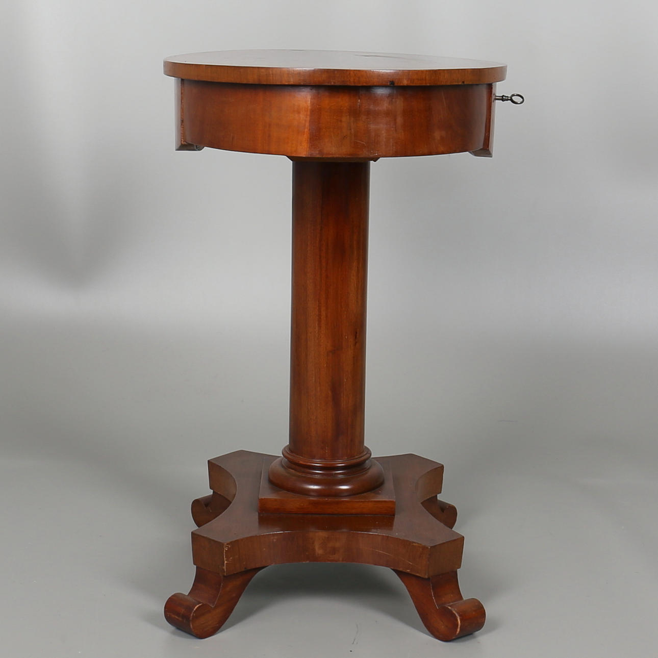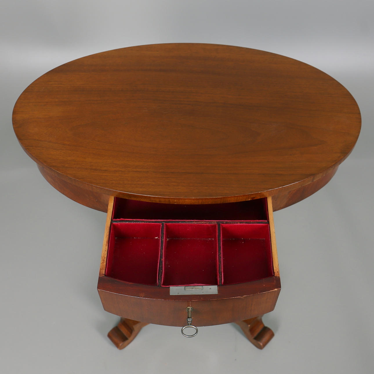 Oval form med skuffe på firedelt søjlebund Skuffe med nøgle Højde, 71,5 cm Længde, 67 cm Dybde, 44 cm.